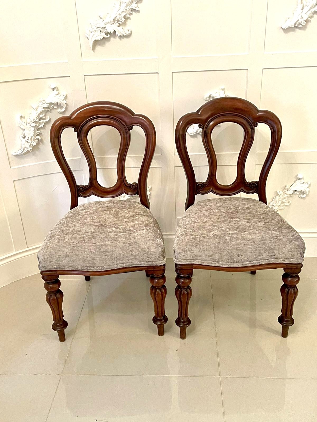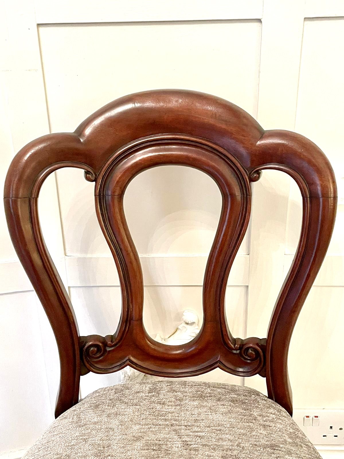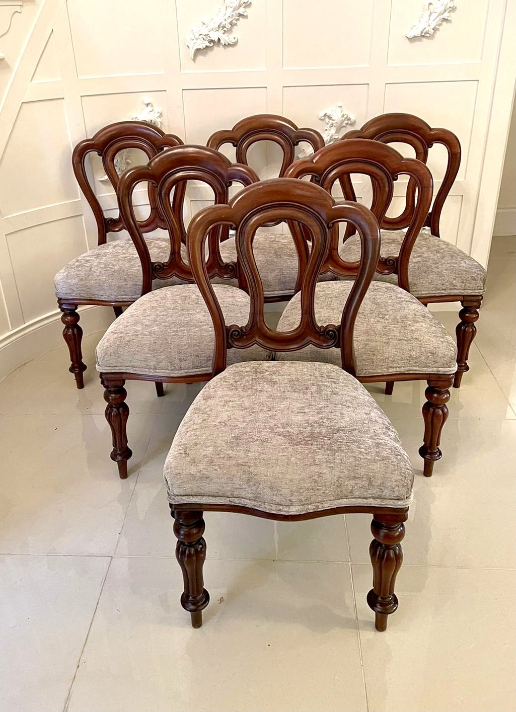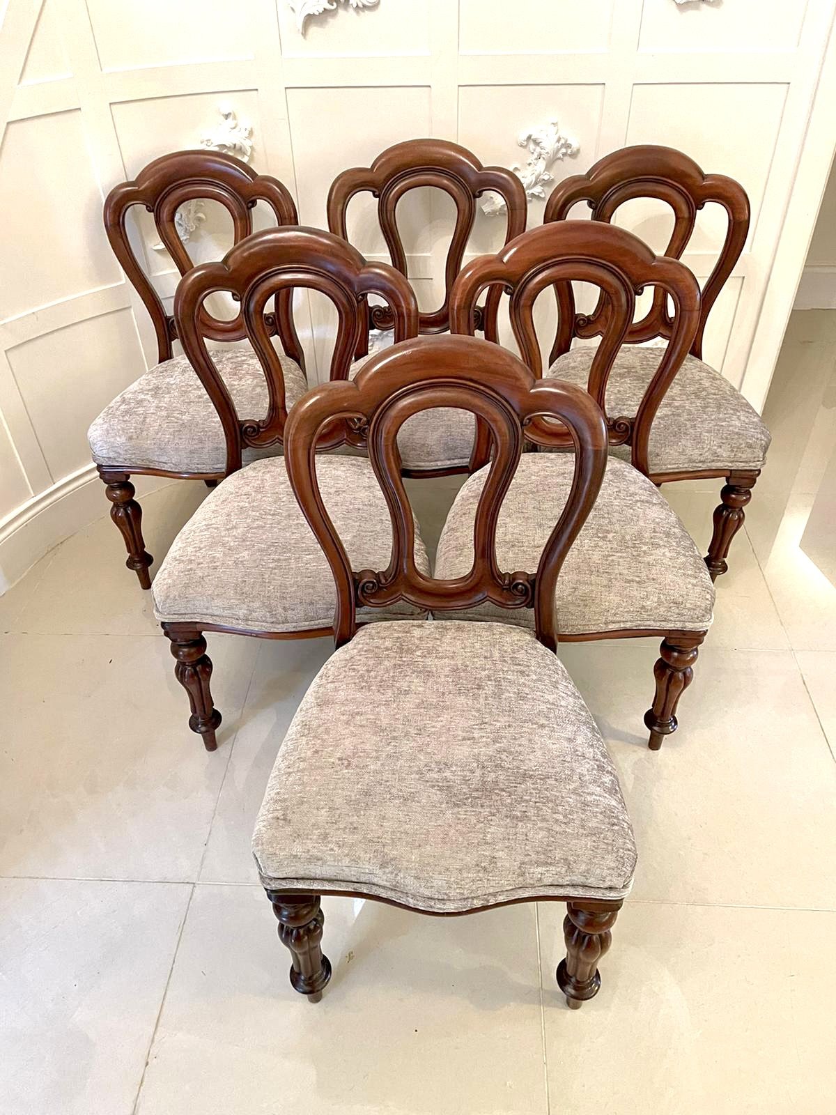 Antique set of six Victorian mahogany dining chairs having a quality mahogany top rail and shaped carved back, newly reupholstered serpentine shaped seats in a quality grey stylish fabric, standing on shaped attractive reeded turned legs to the front and out swept back legs.