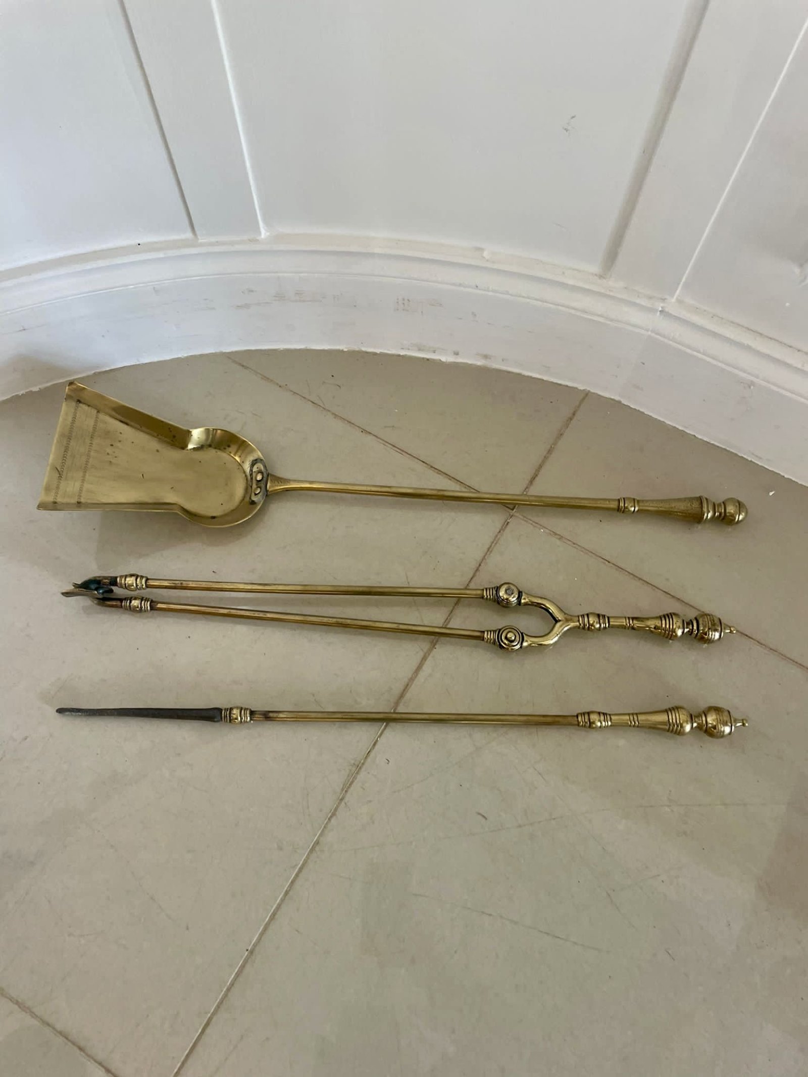 Antique set of three Victorian quality brass fire irons consisting of a quality brass shovel, poker and fire tongs