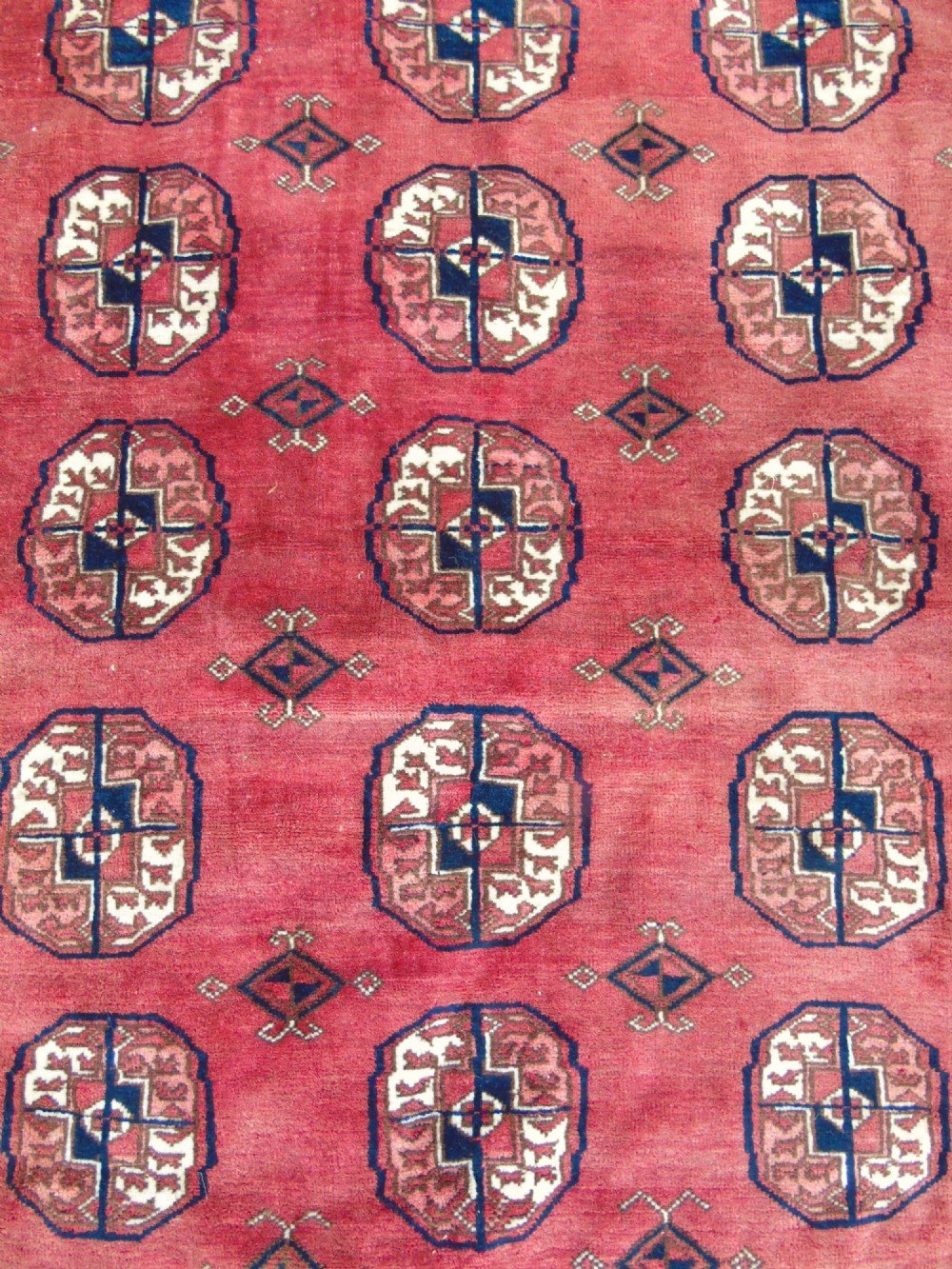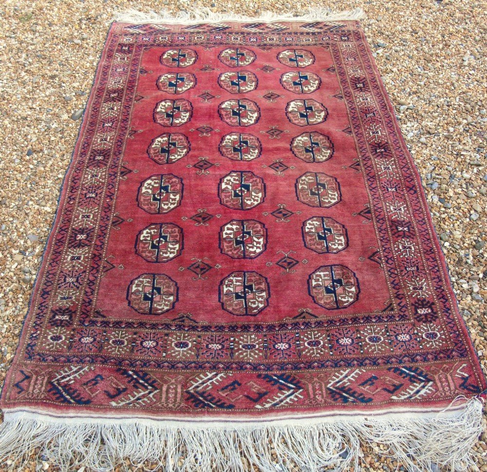 This is a very smart Tekke Turkman hand woven carpet in excellent original order dating from around 1910. The carpet has a really attractive rose red ground colour and 7 rows of three guls to the design. With very pretty borders and ends the rug has tasselled fringes and is in beautiful condition throughout. A good soft pile and soft handle make this a very pleasing little carpet.