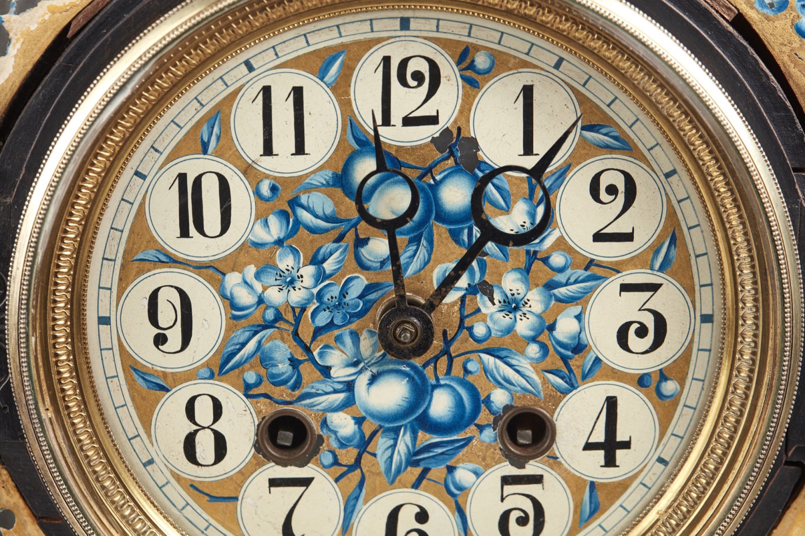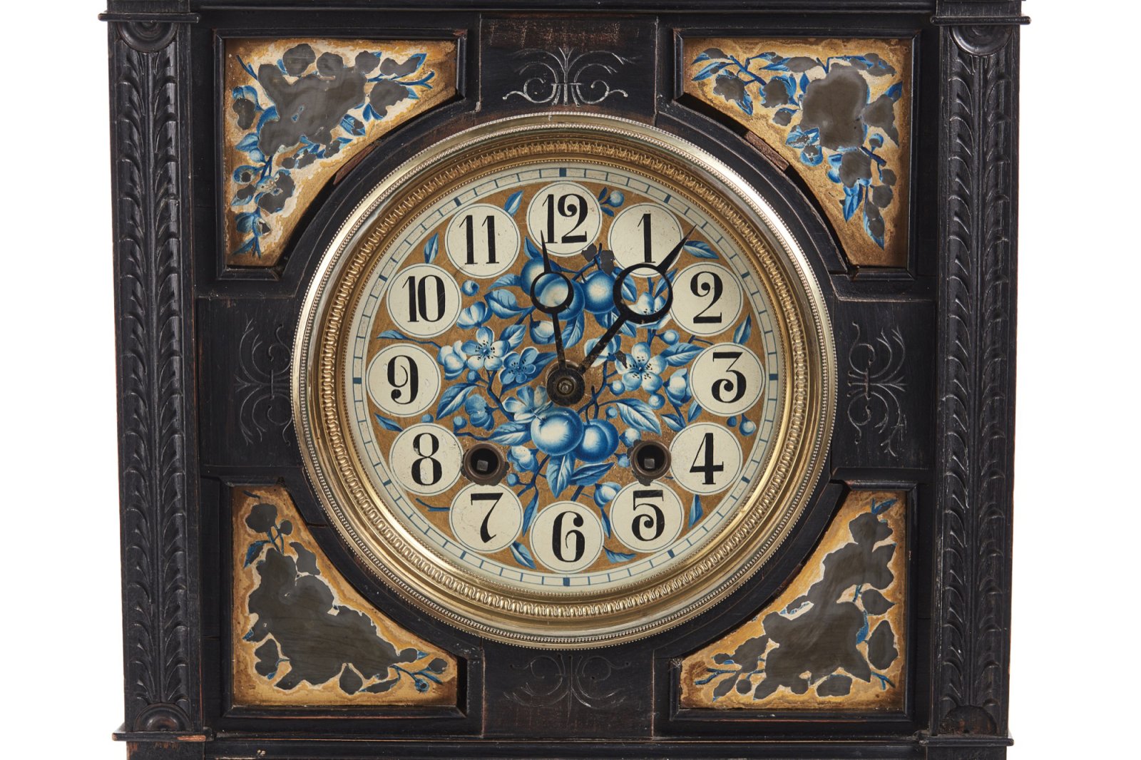 Antique Victorian 19th Century antique ebonised Aesthetic movement mantel clock having a lovely arched case, pretty painted dial and spandrels decorated with fruit and set with Arabic numerals with eight day movement. Good condition and working order.