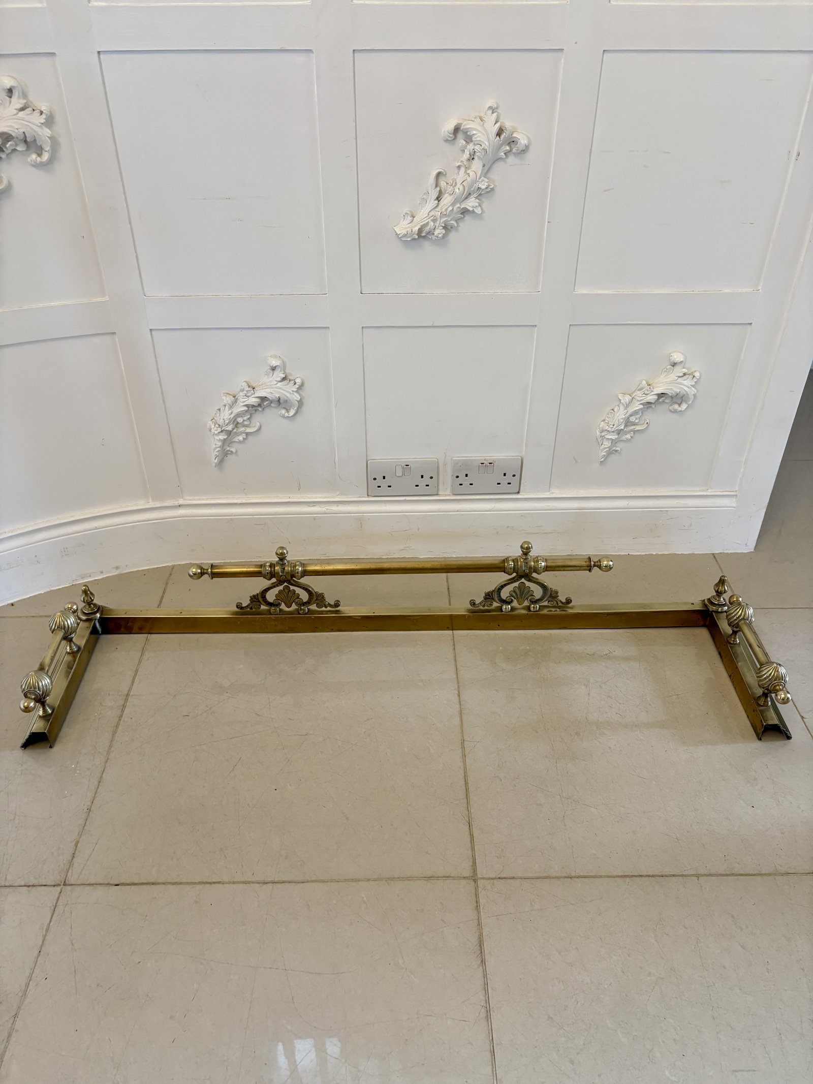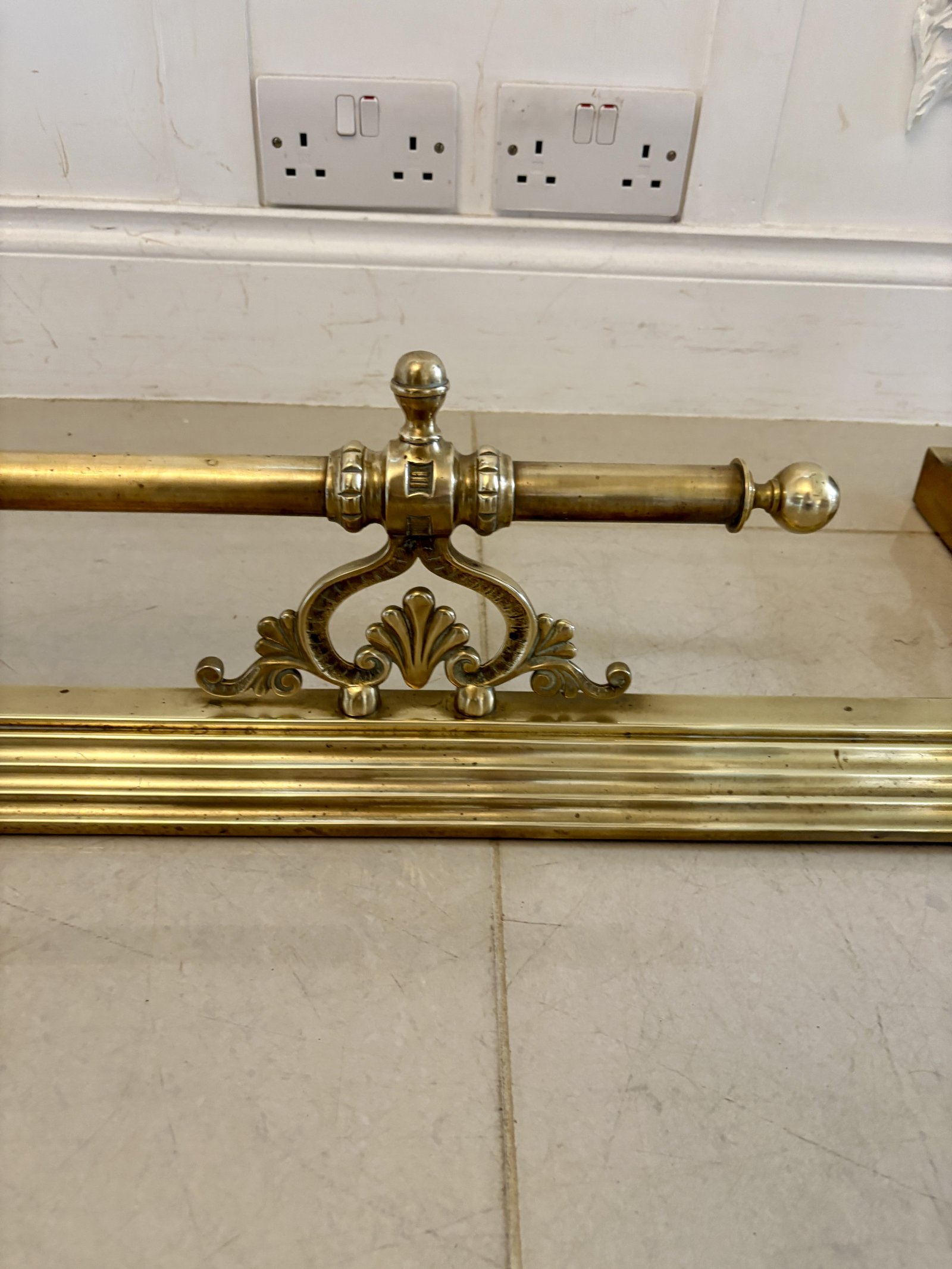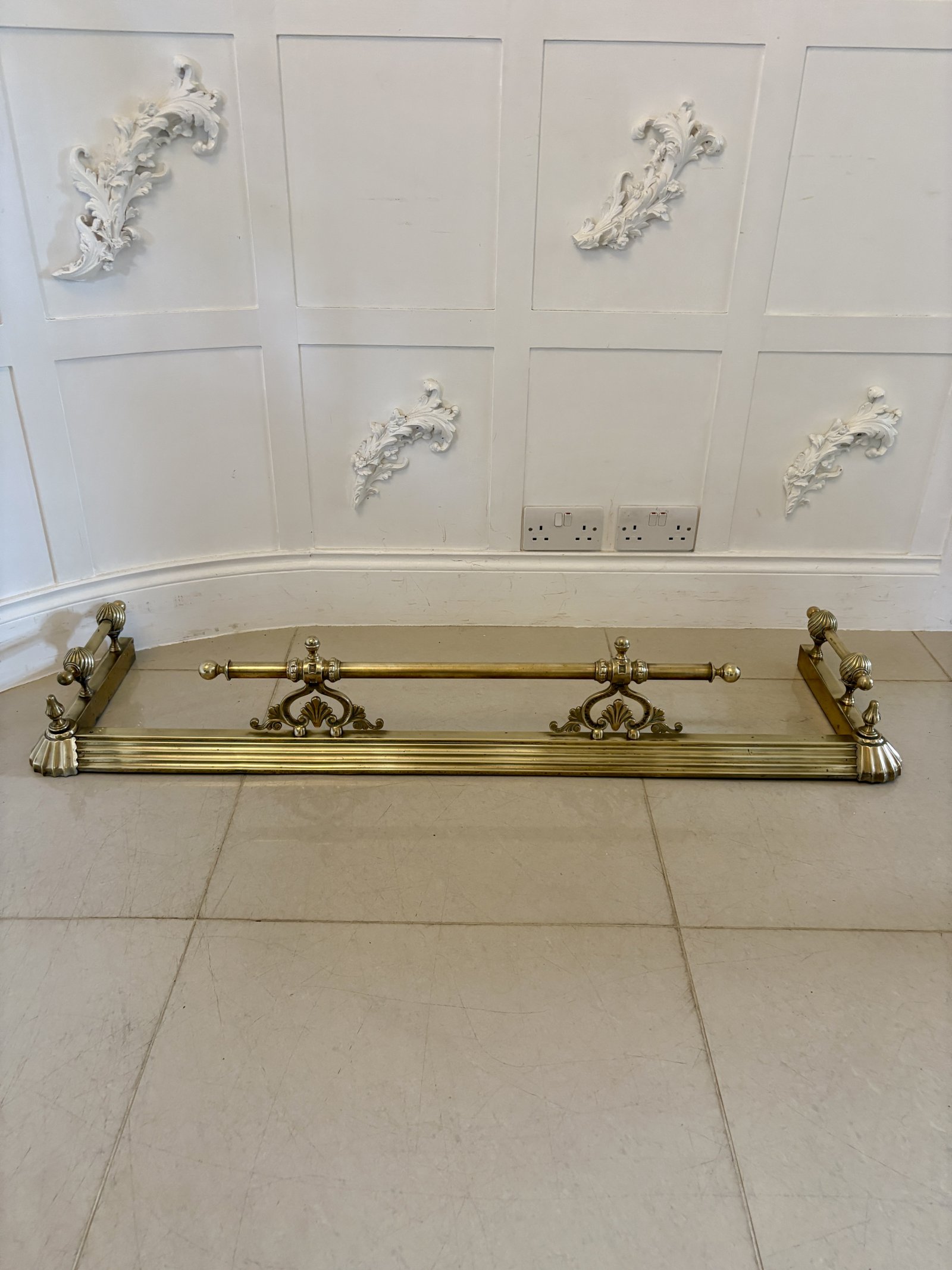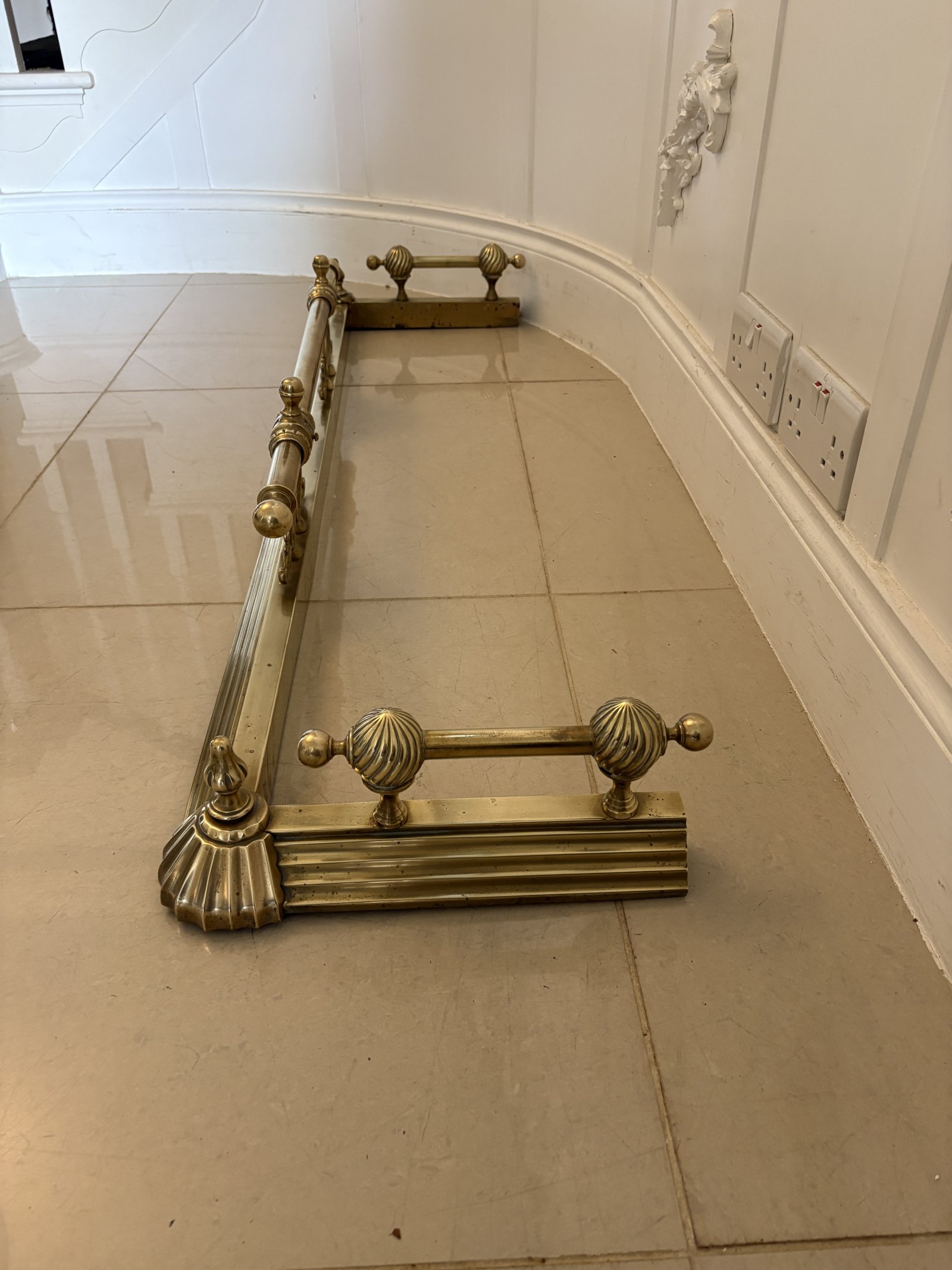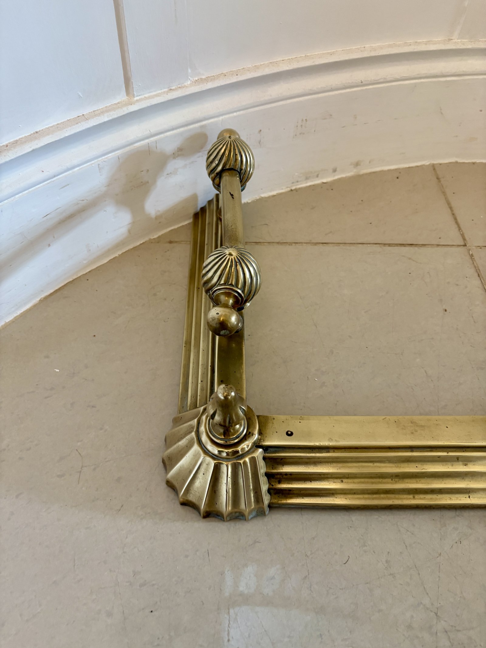 Antique Victorian brass fender crafted in solid brass and having a reeded and bobbin shaped design with scrolls, finials to each end.