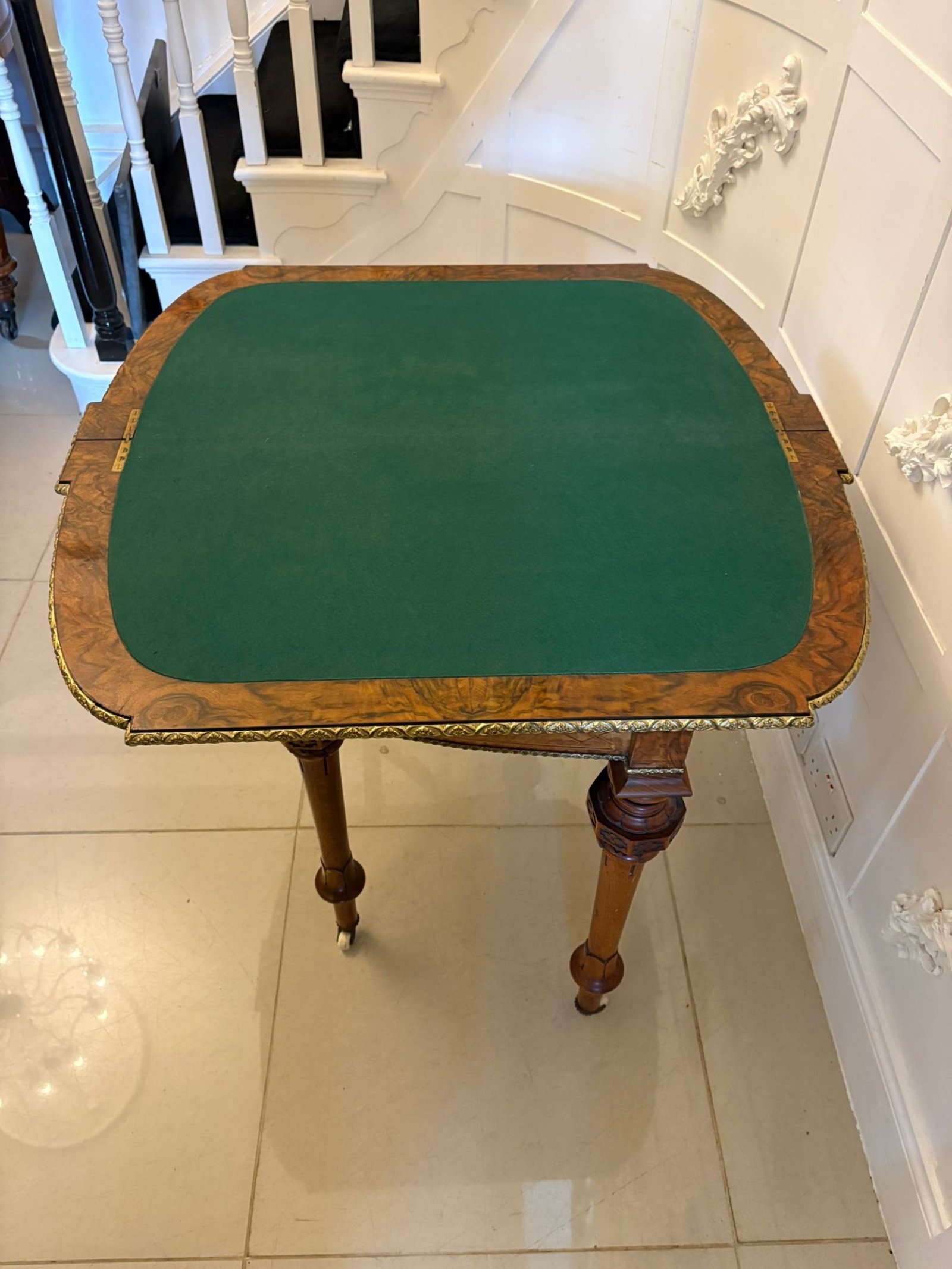 The interior retains its original configuration, designed for card playing and social games. In the Victorian period such tables were used in drawing rooms for entertaining guests, then closed to sit neatly against the wall as a console, making it highly versatile for modern interiors.