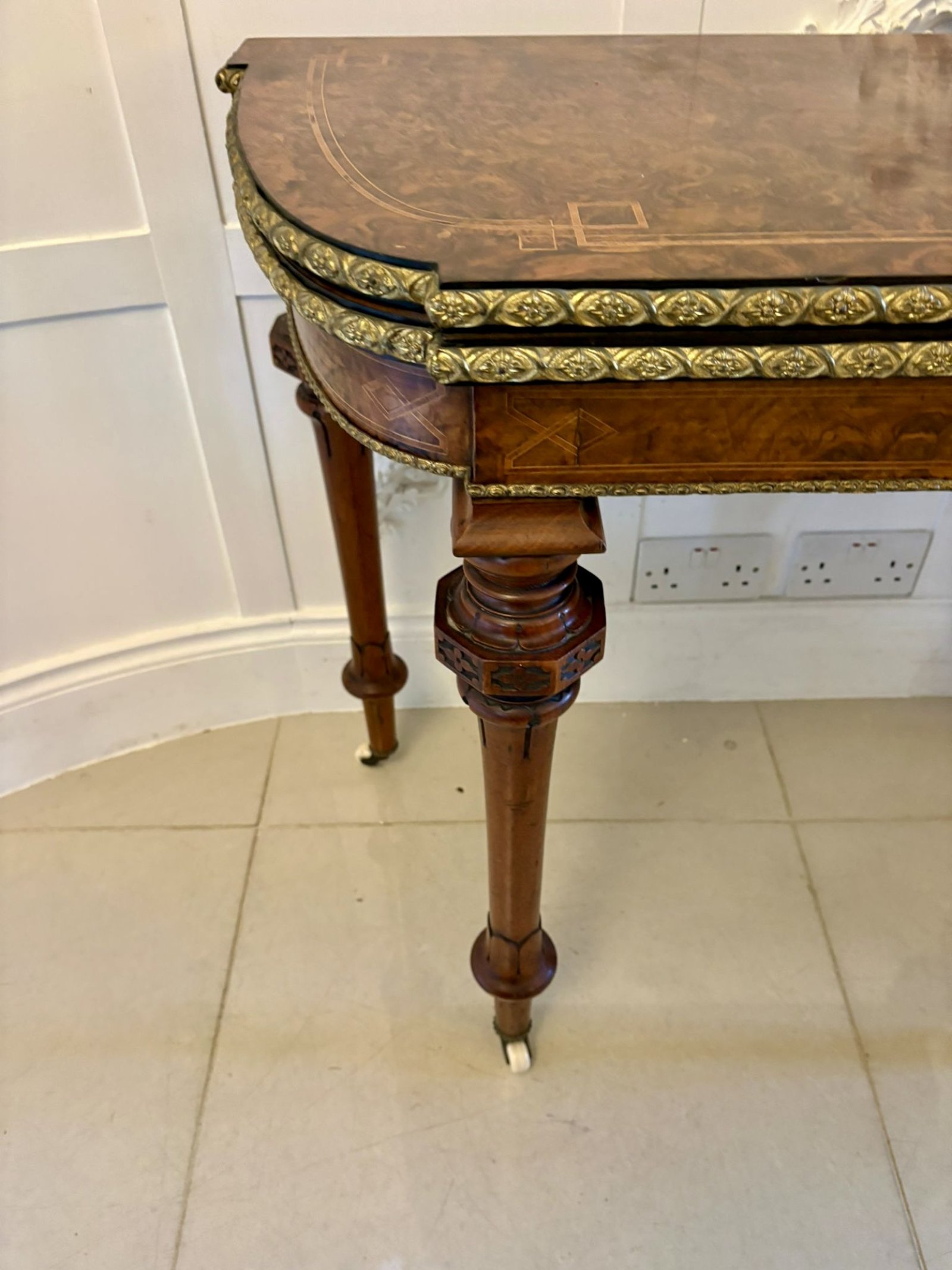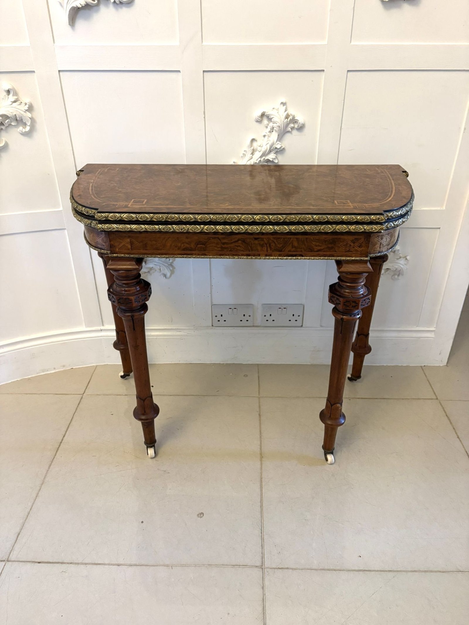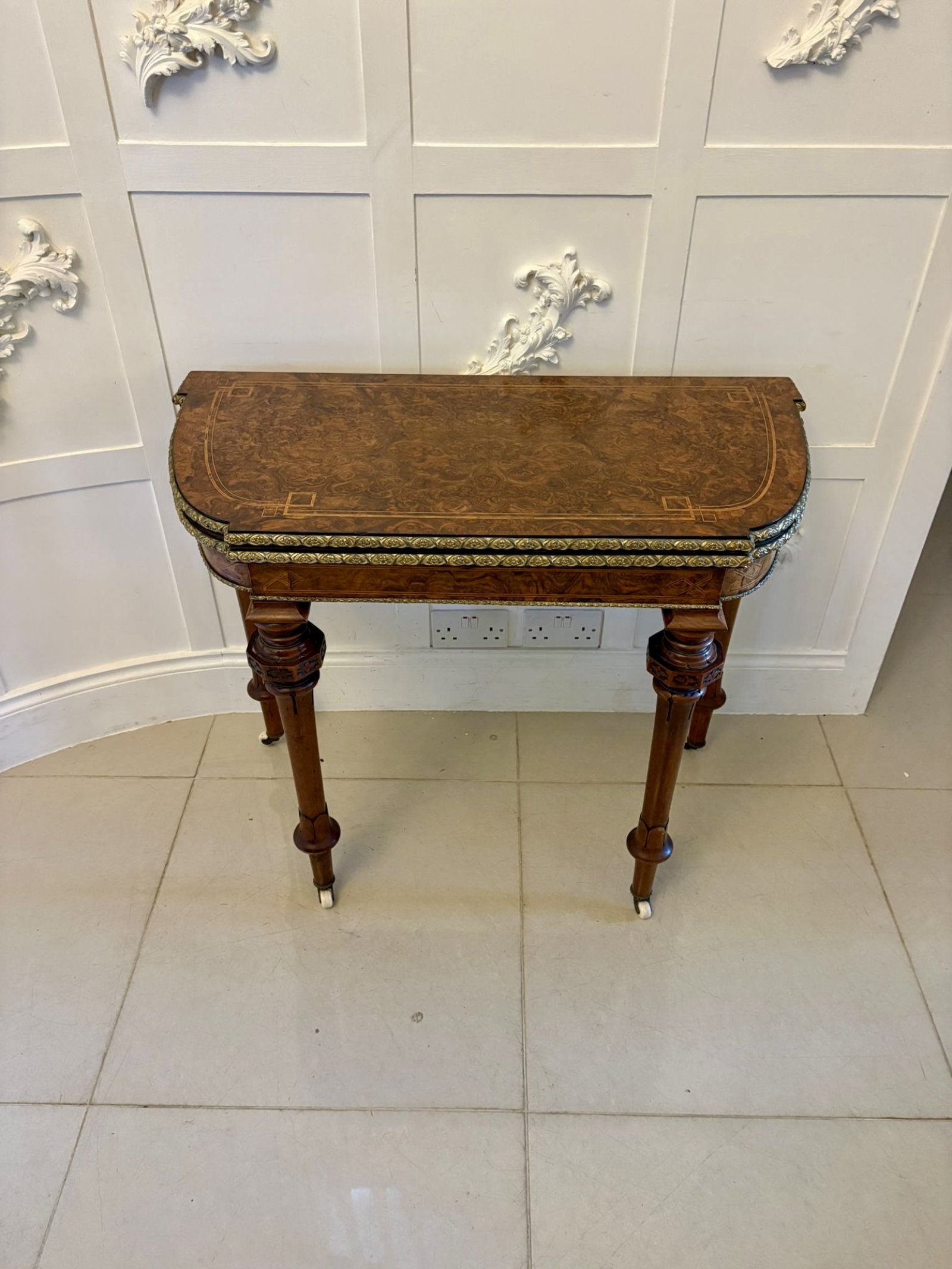 Antique Victorian Burr Walnut Card Console Table with Ormolu Mounts and Inlay