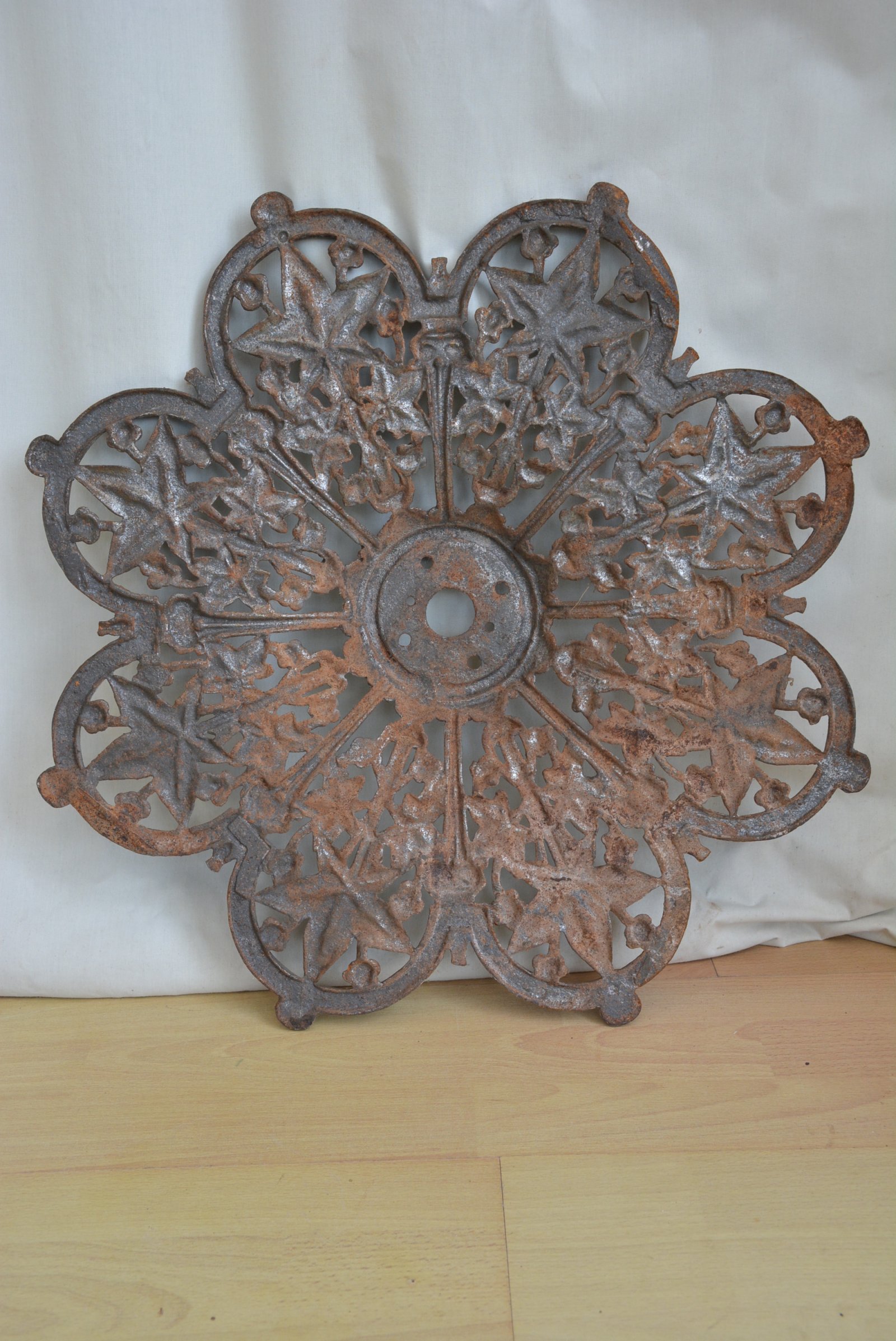 K0421 Antique English Victorian cast iron ceiling rose with intricate pierced ivy leaf design throughout and four fixing holes. This antique ceiling rose has been stripped and is ready to paint in 125colour of your choice. Truly excellent example, no missing elements no loose decoration, solid and sturdy, and in home ready condition. c1880
