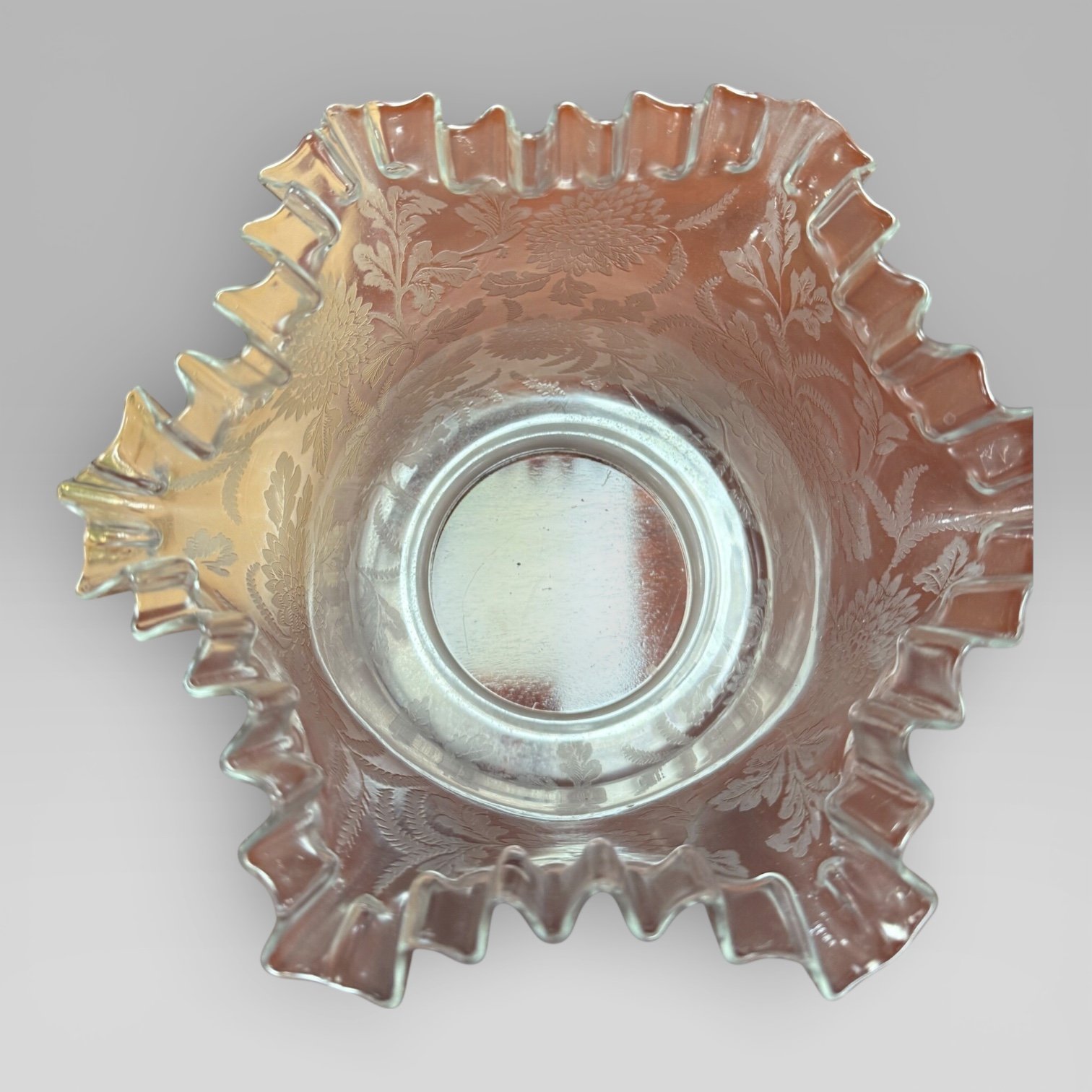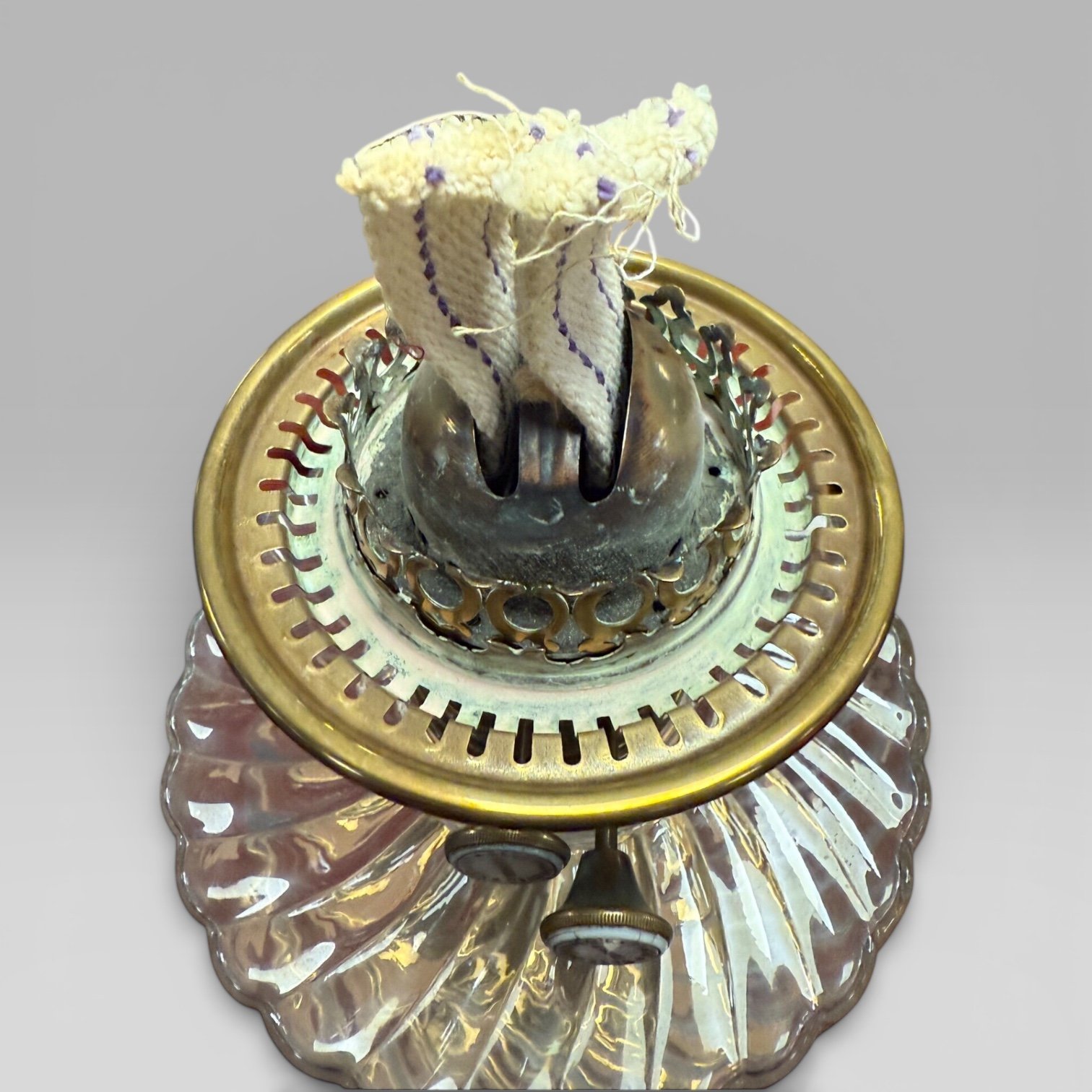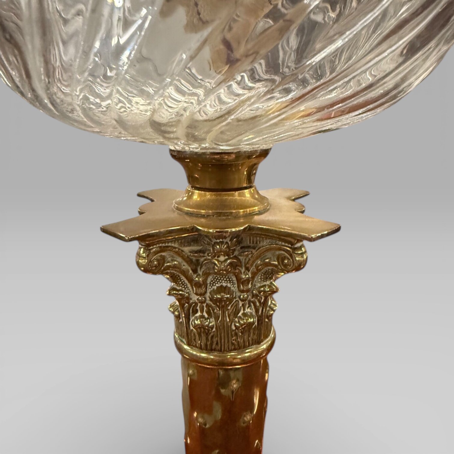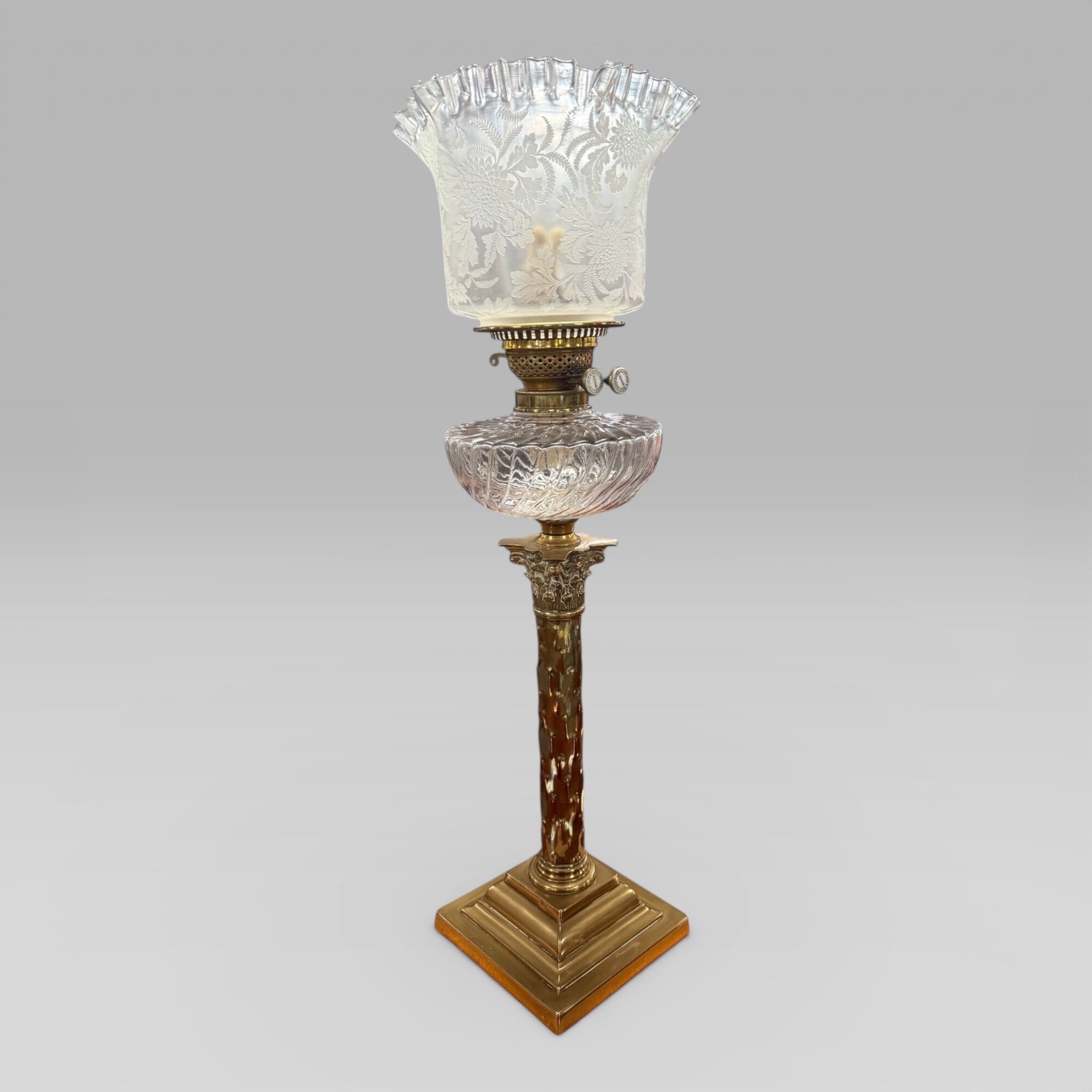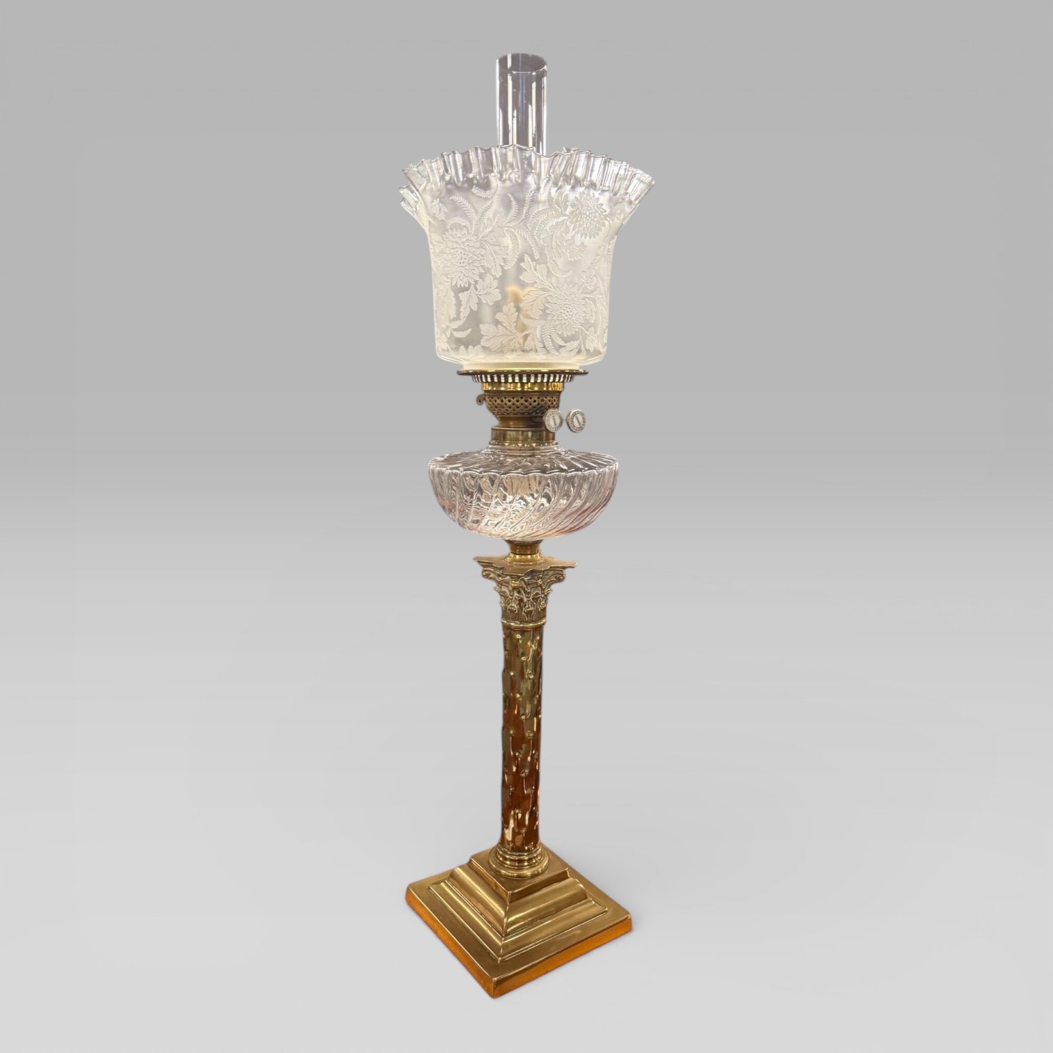 Here we have an English Antique Victorian (1837-1901) Duplex Clear Etched Glass Tulip Shade Oil Lamp With Brass Corinthian Column Base. Including a clear glass font reservoir to the centre.