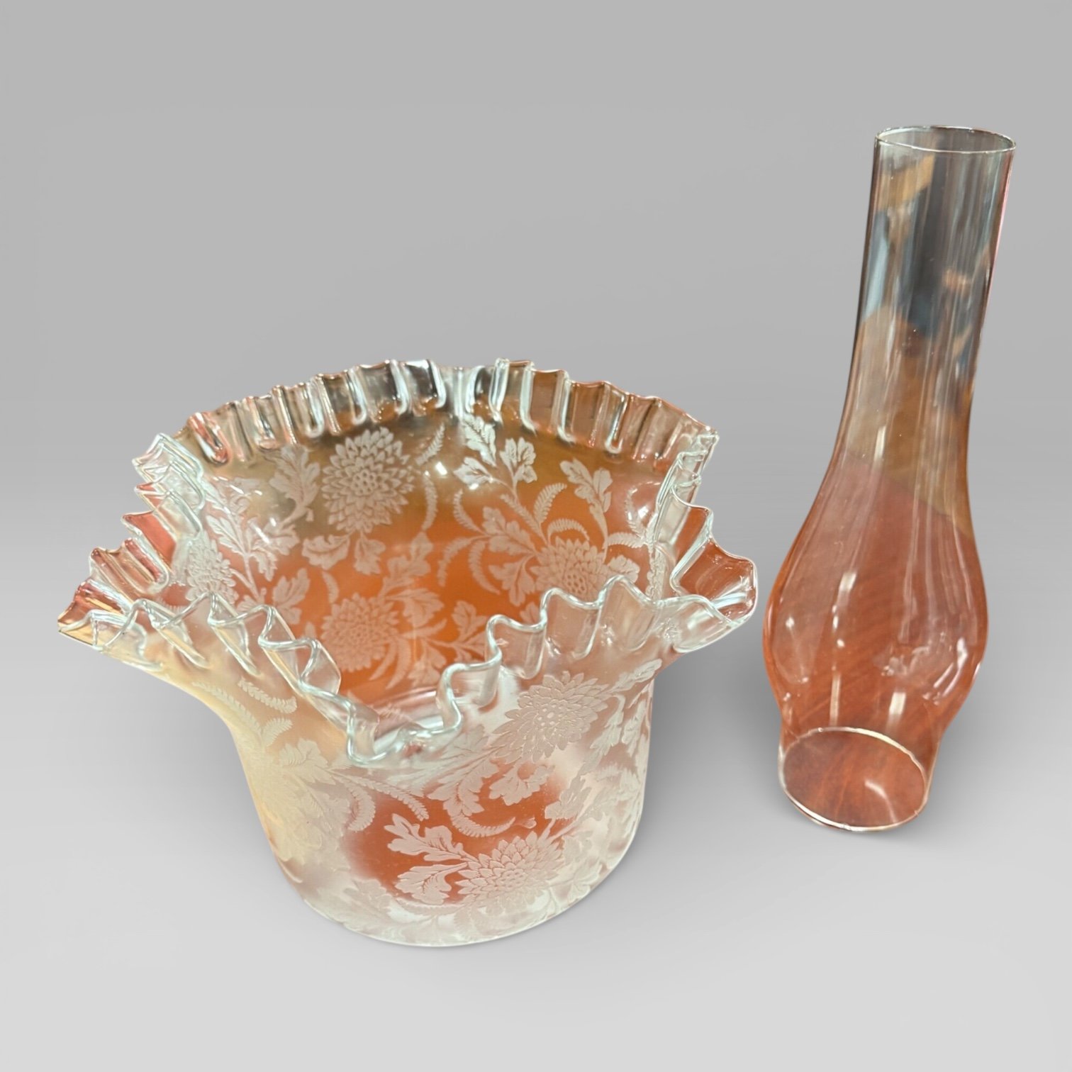 Antique Victorian Duplex Etched Glass Tulip Shade Oil Lamp With Brass Column