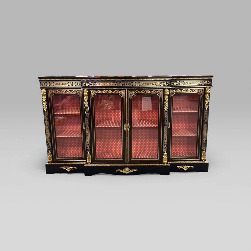 A Large Victorian Ebonised & Boulle Breakfront Credenza. A beautiful blend of boulle & brass ormolu decoration. With 4 glazed panelled and boulle inlaid doors, opening to reveal a patterned red interior.