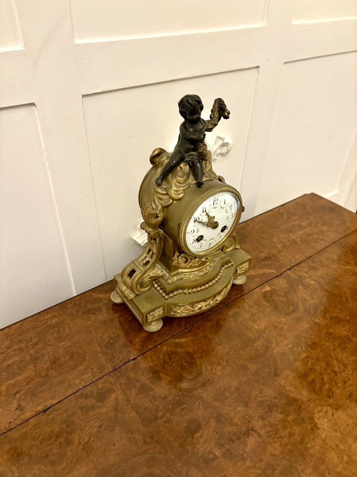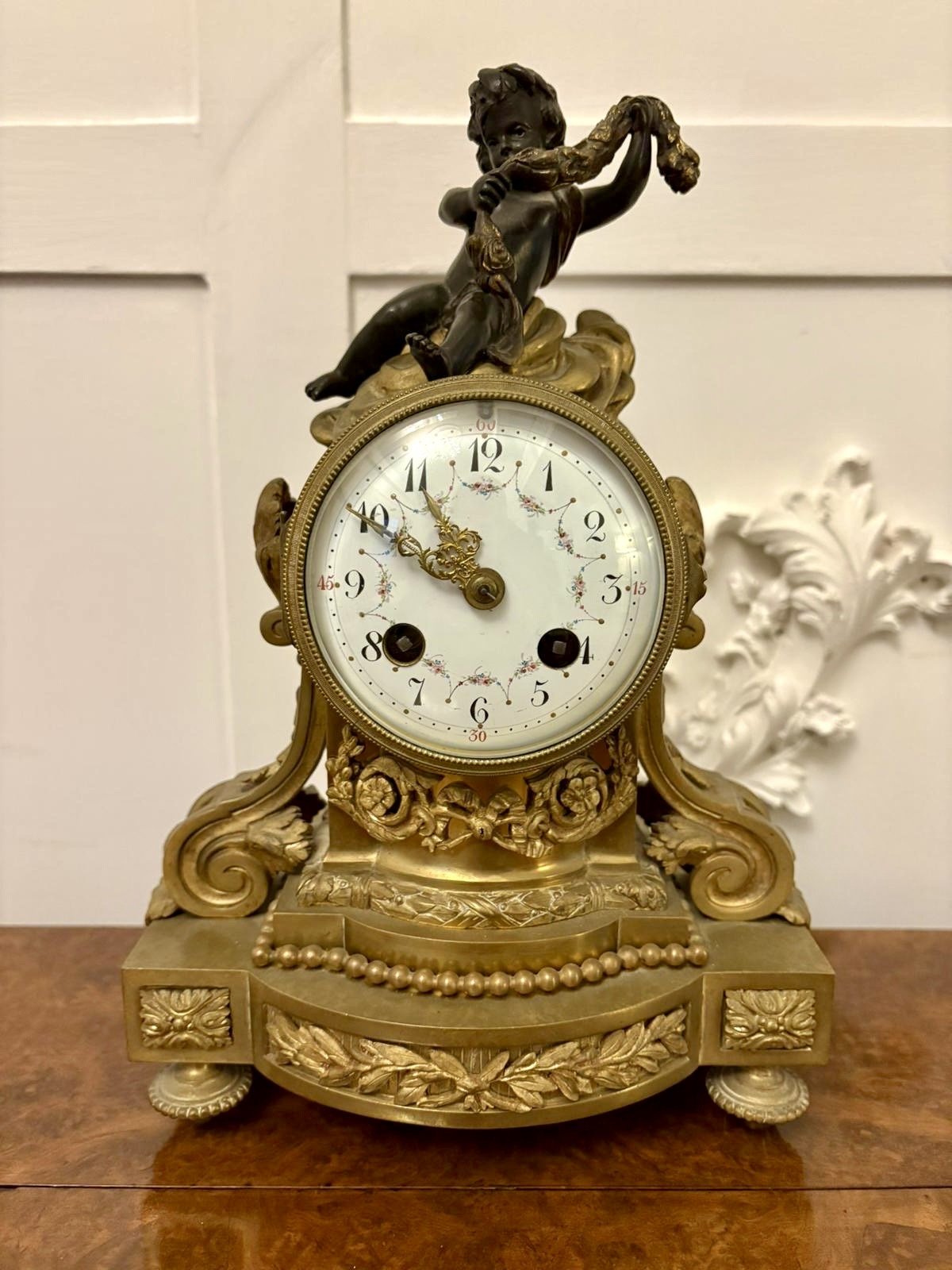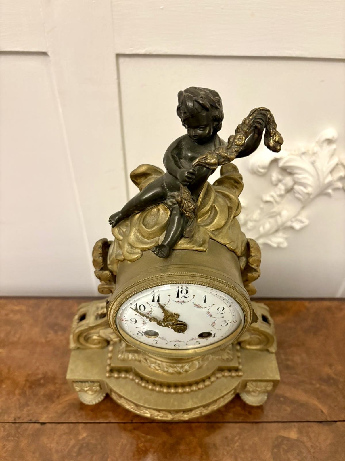 Antique Victorian French quality ornate ormolu and bronze mantle clock having a quality bronze cherub to the top ornate ormolu case with scroll, bow and leaf decoration, circular hand painted porcelain dial, original hands, 8 day French movement striking on the hour and half hour on a bell
