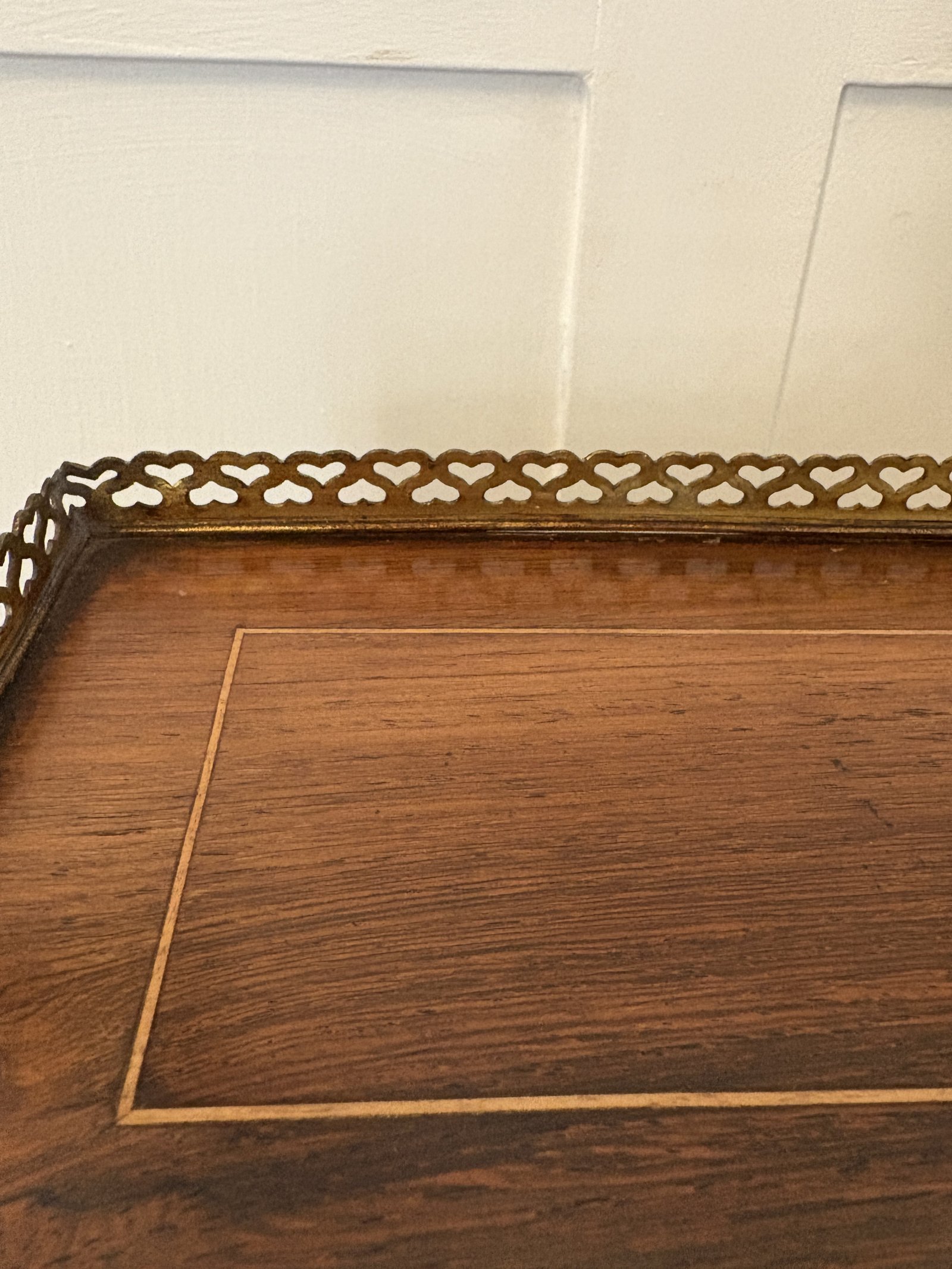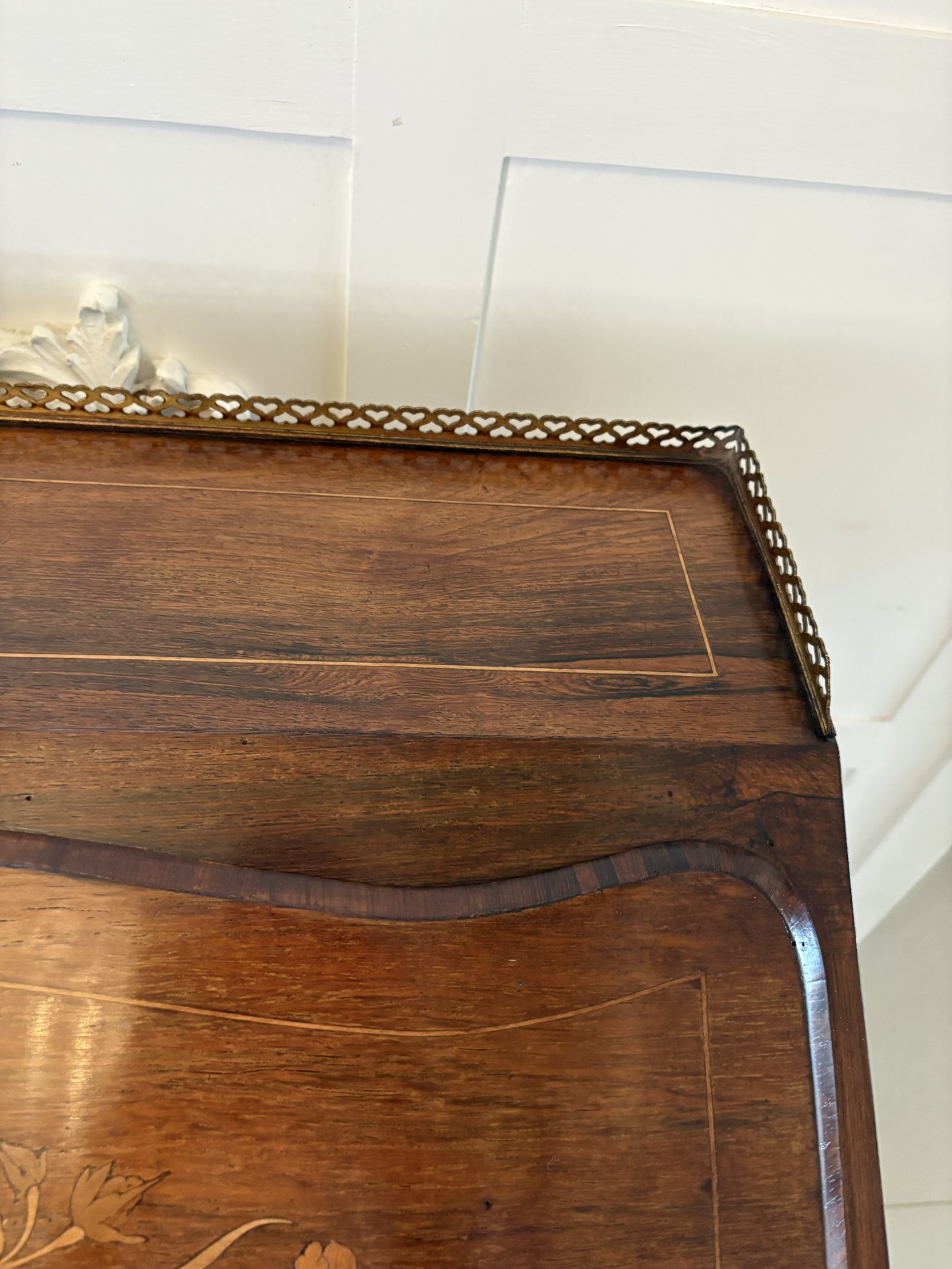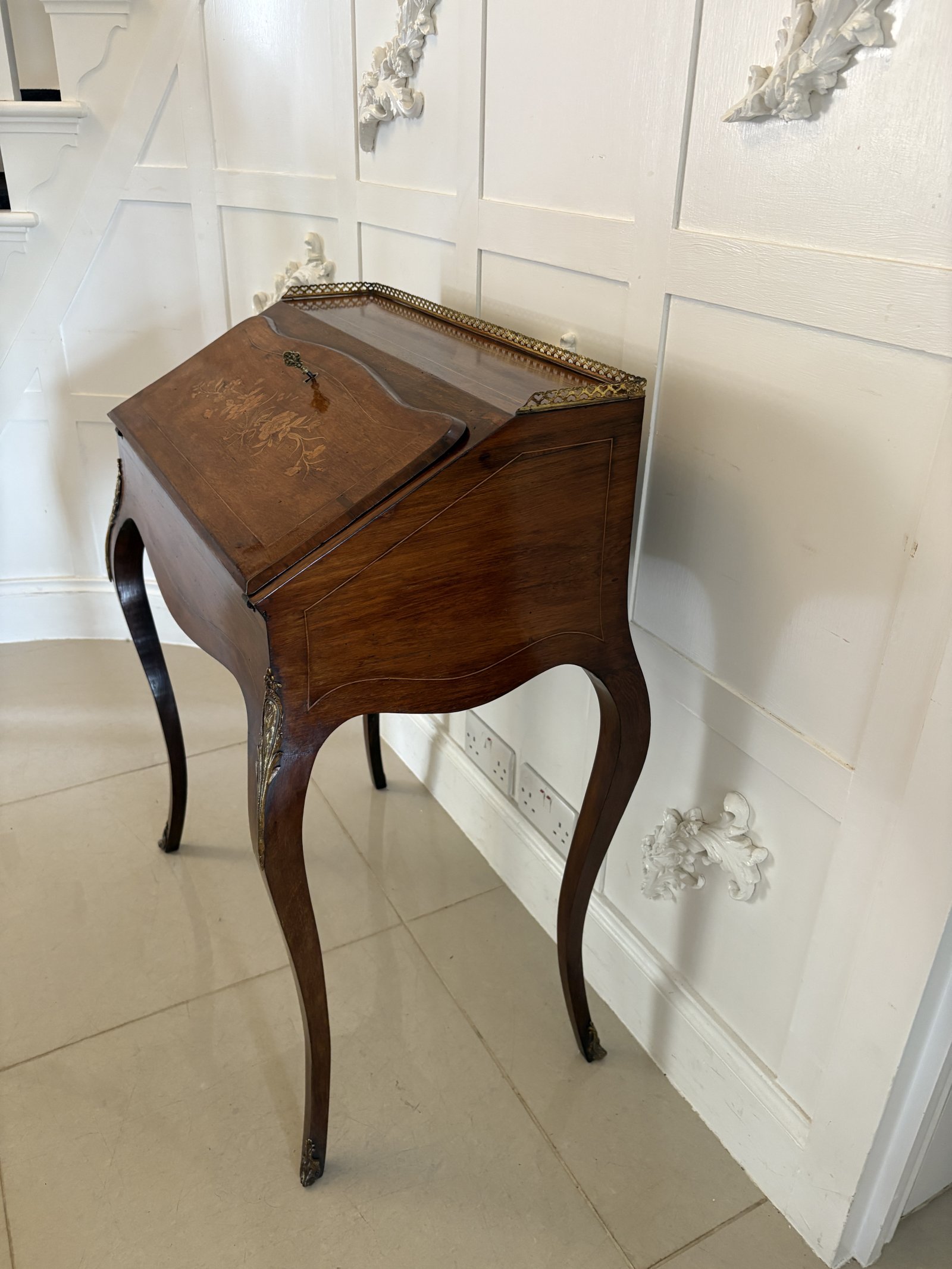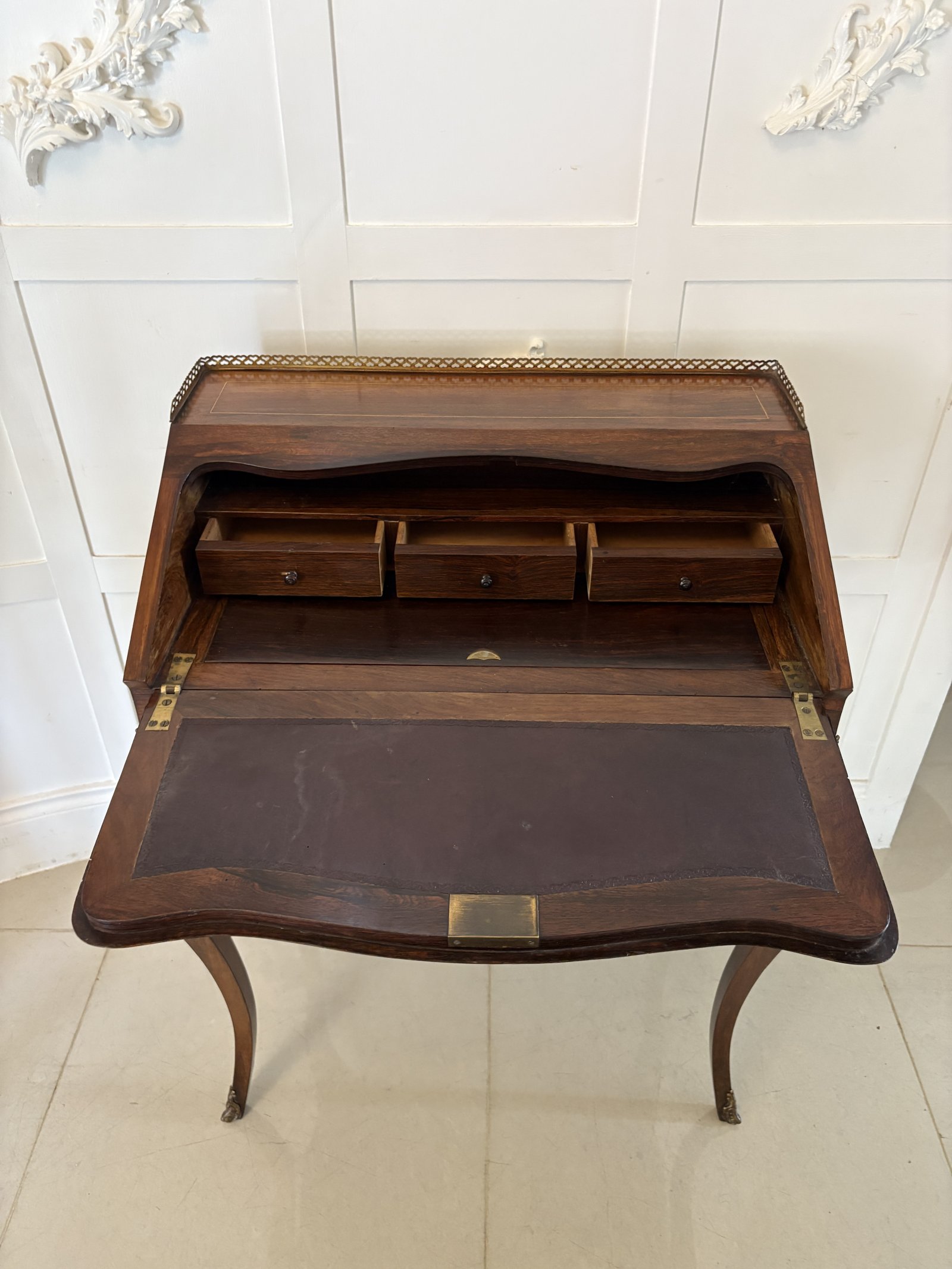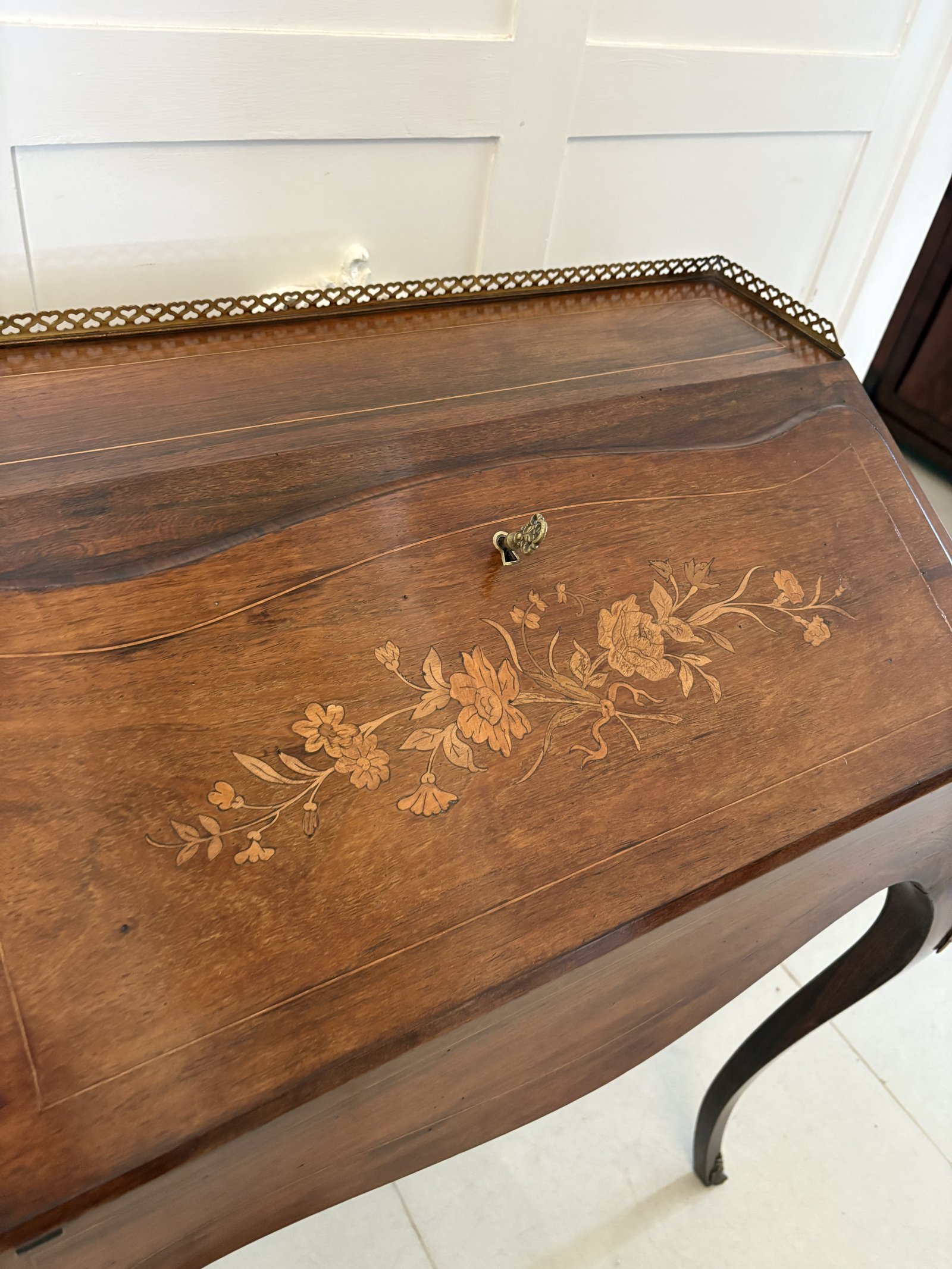 Antique Victorian French quality rosewood marquetry inlaid bureau having the original ornate brass gallery above a quality rosewood marquetry inlaid fall opening to reveal three drawers and a sliding storage compartment standing on shaped cabriole legs with ornate gilded brass mounts