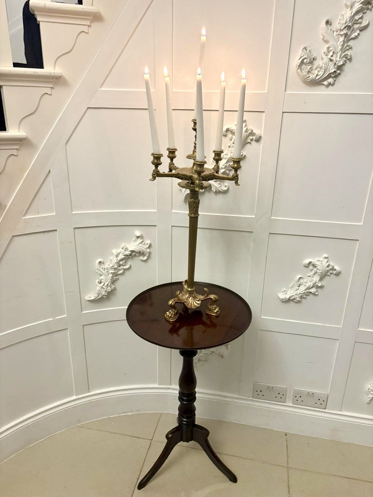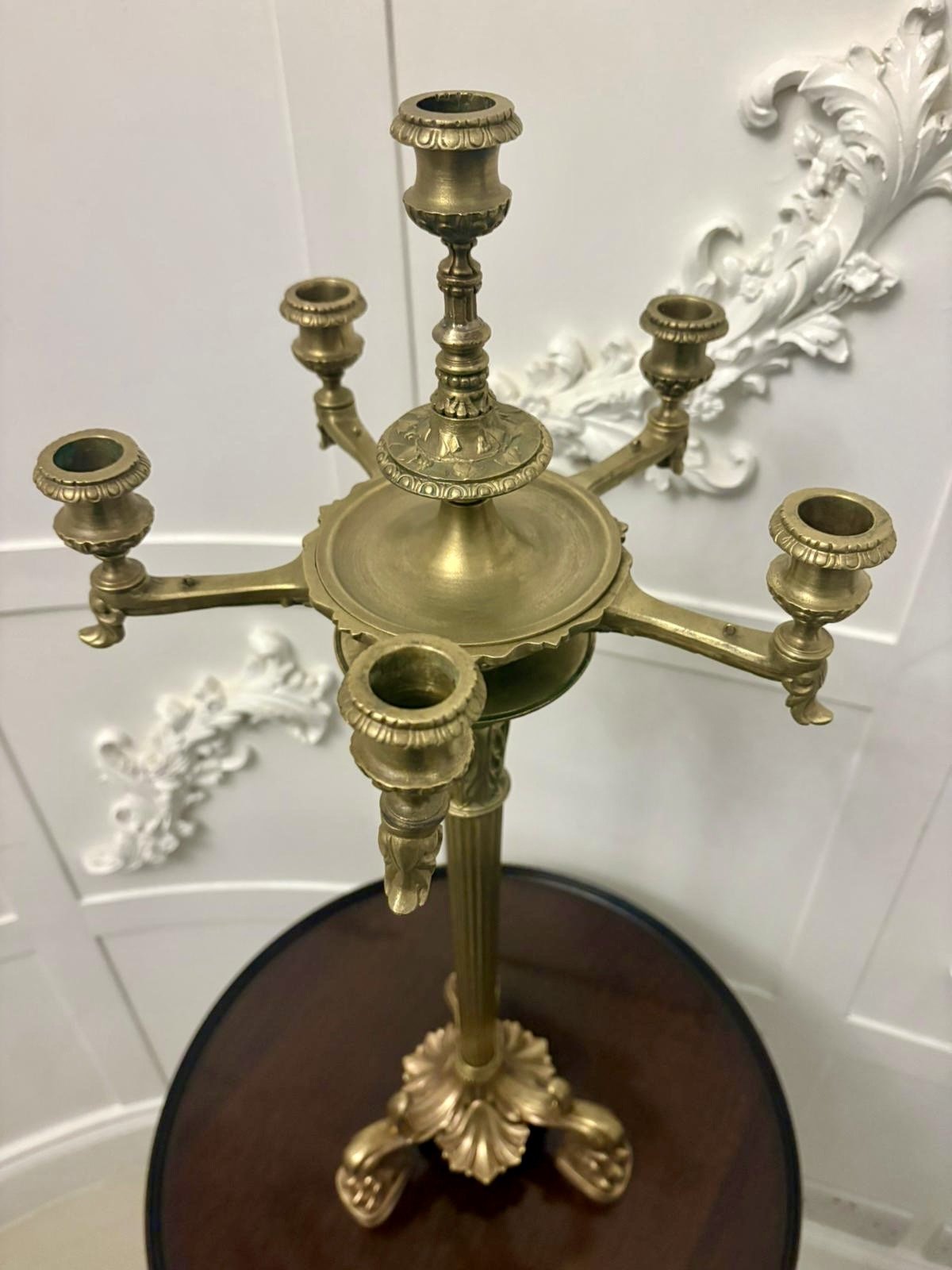 A lovely antique Victorian gilt brass six-light candelabrum stand with beautifully cast detailing throughout. The candelabrum features six candle holders arranged around a central elevated sconce, each with decorative foliate and petal moulding. The scrolling arms and fluted column add elegance, while the acanthus-carved base with paw feet provides a sturdy and attractive foundation.