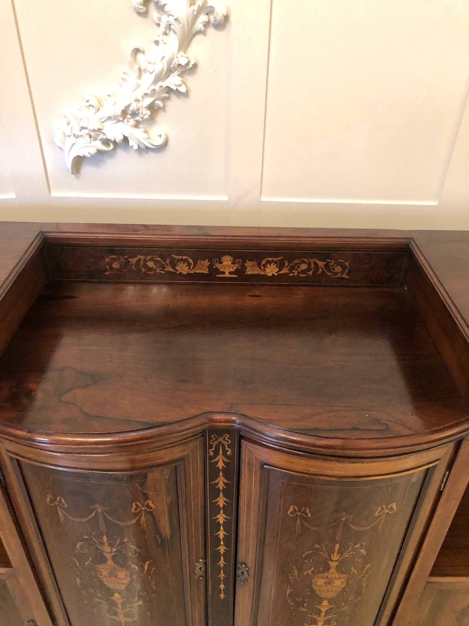 Antique Victorian inlaid rosewood side cabinet having a shaped rosewood top with moulded edge and a quality inlaid frieze, two shaped panelled rosewood doors to the centre with outstanding inlaid satinwood decoration opening to reveal shelves flanked by two panelled rosewood inlaid cupboard doors raised on shaped turned legs.