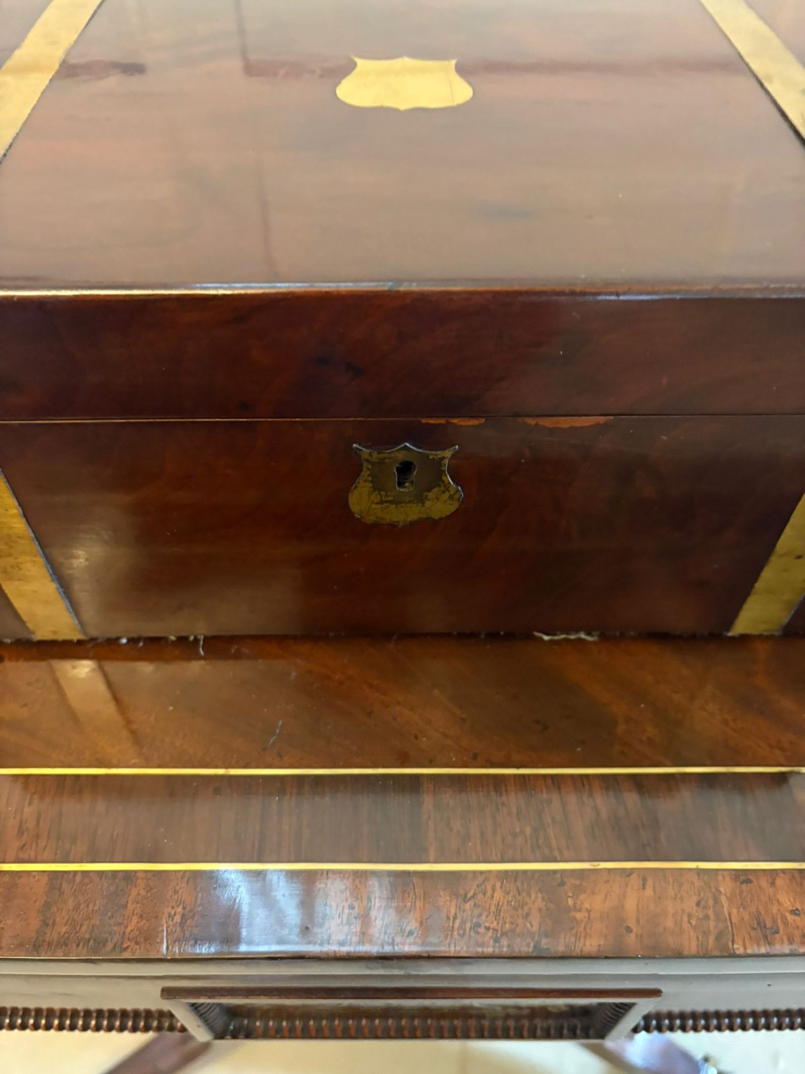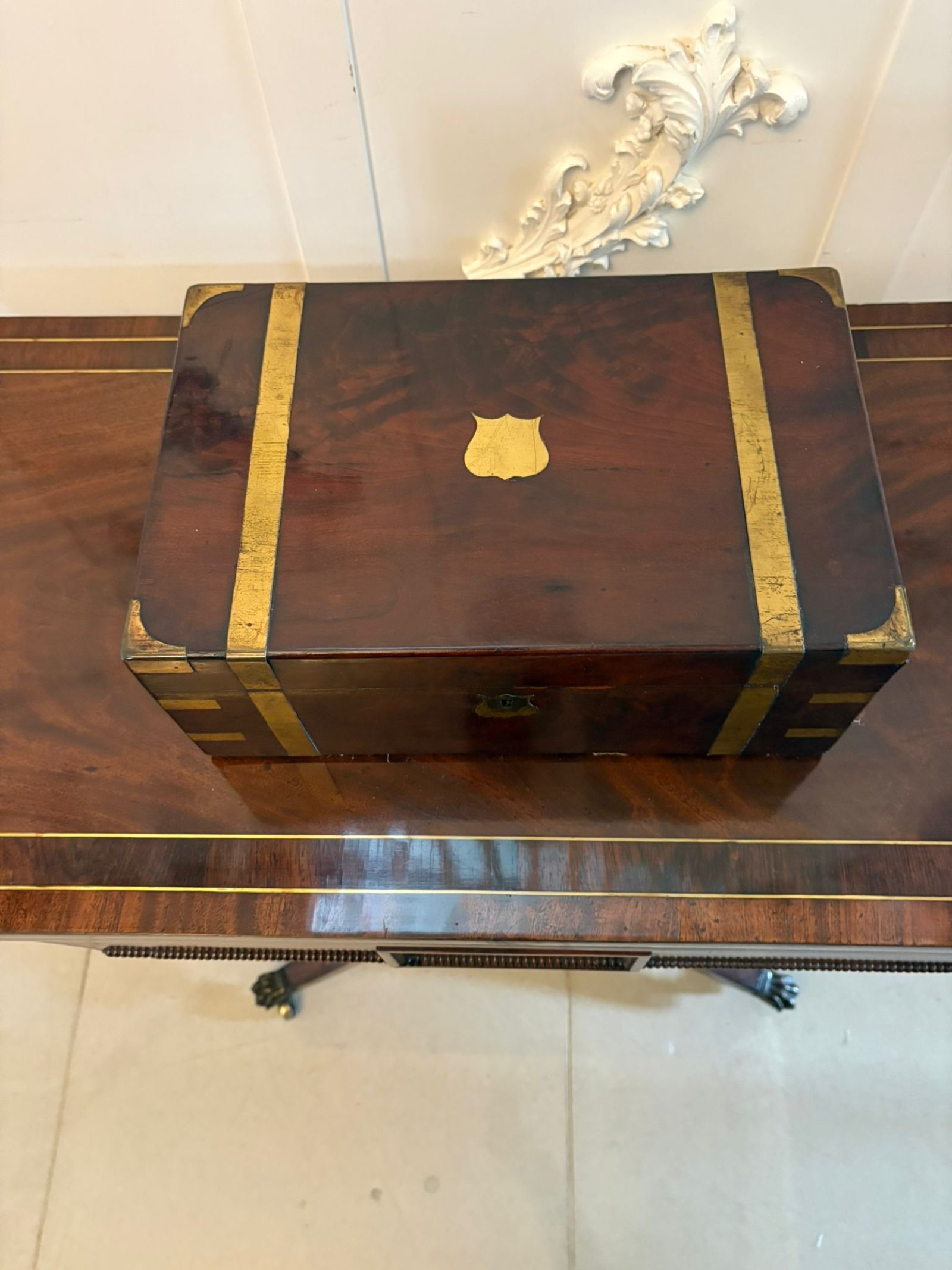 An attractive example with rich colour to the mahogany and decorative brass bound detail.