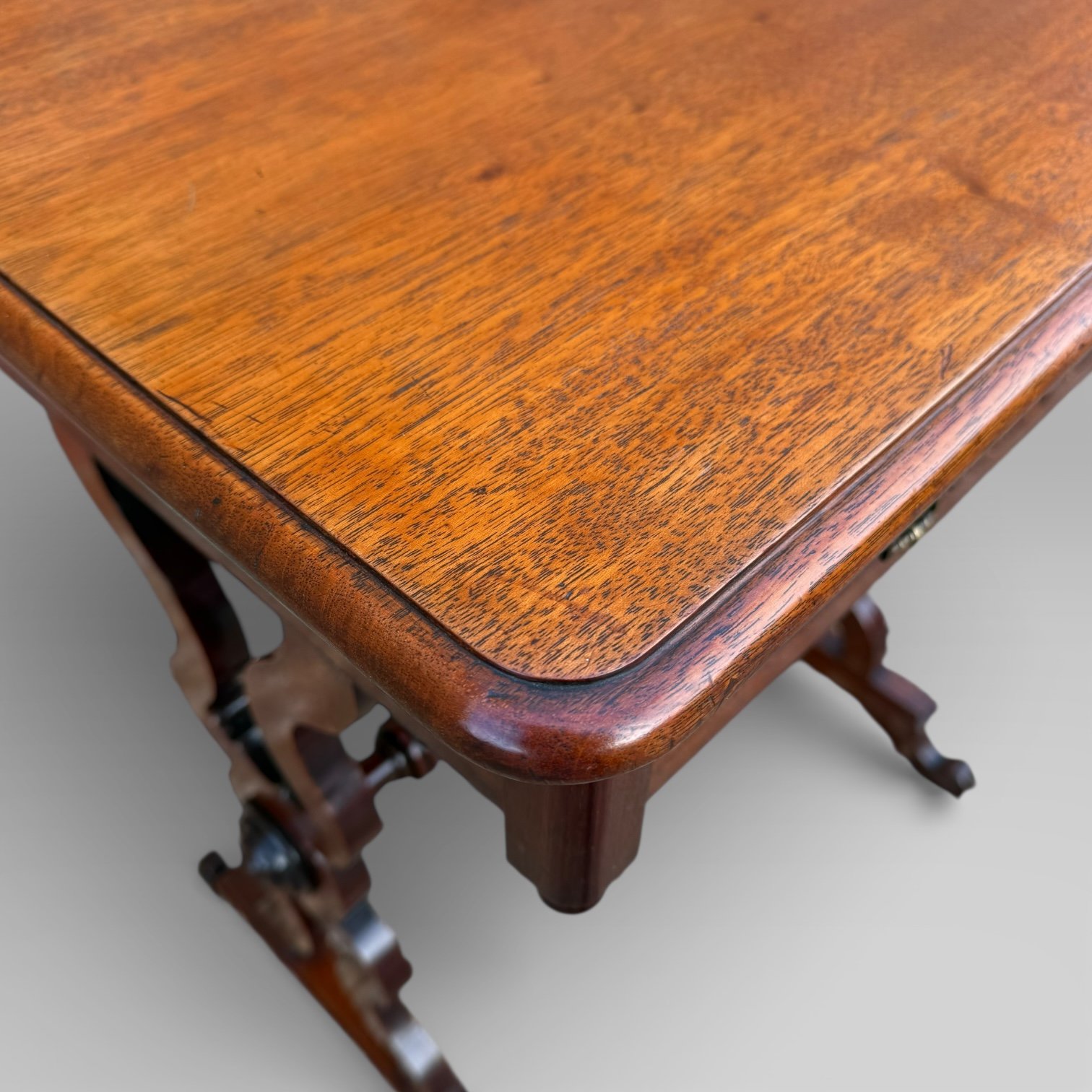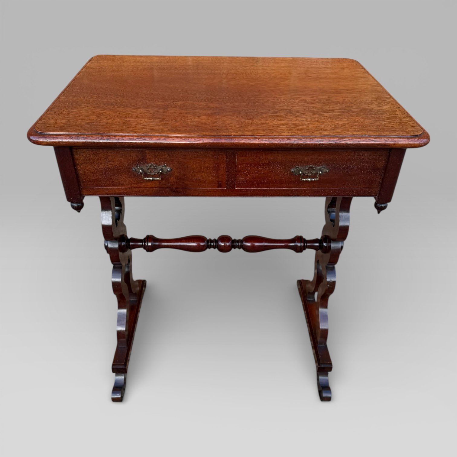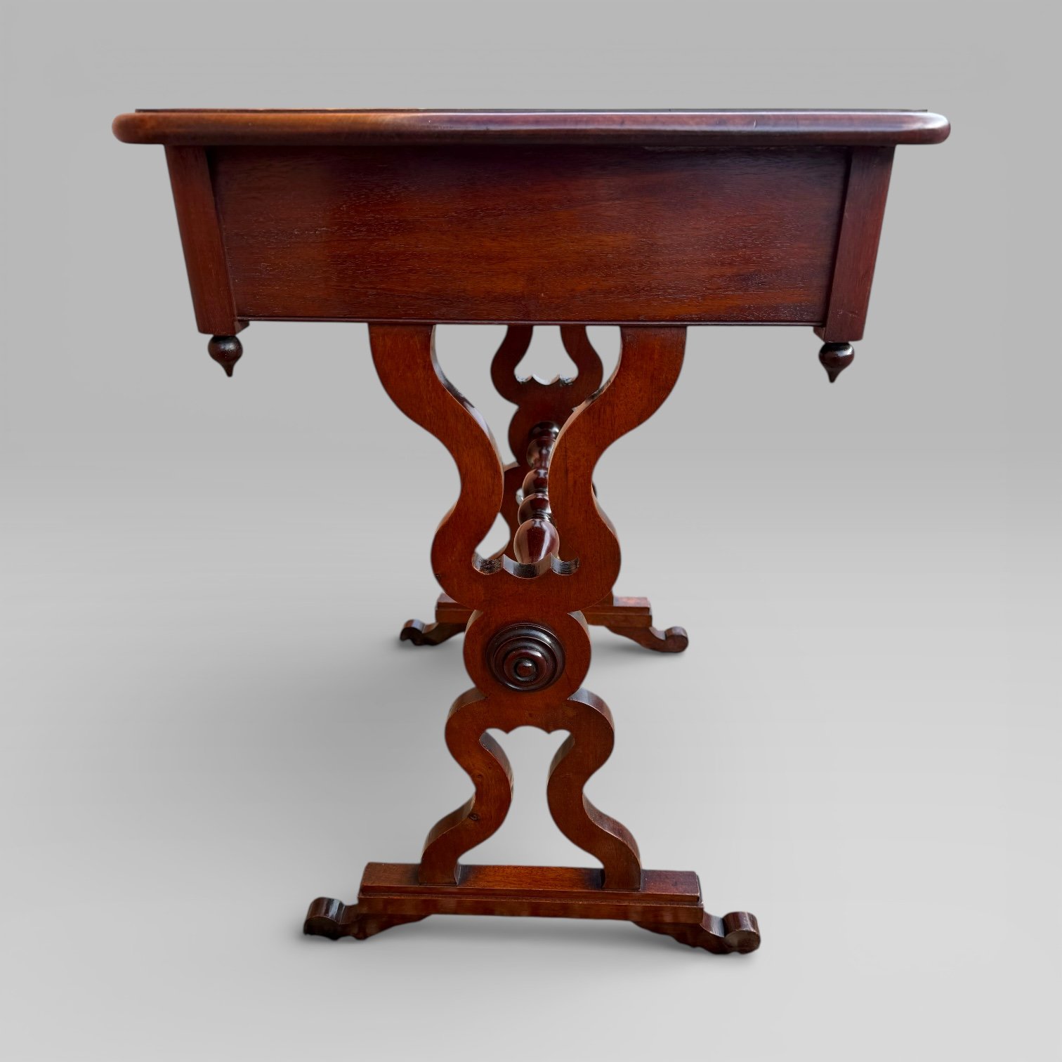 The table is raised on lyre-form trestle supports, joined by a baluster-turned stretcher, and terminating in scroll feet, providing both strength and visual balance. The stretcher base offers good legroom while remaining decorative and practical.