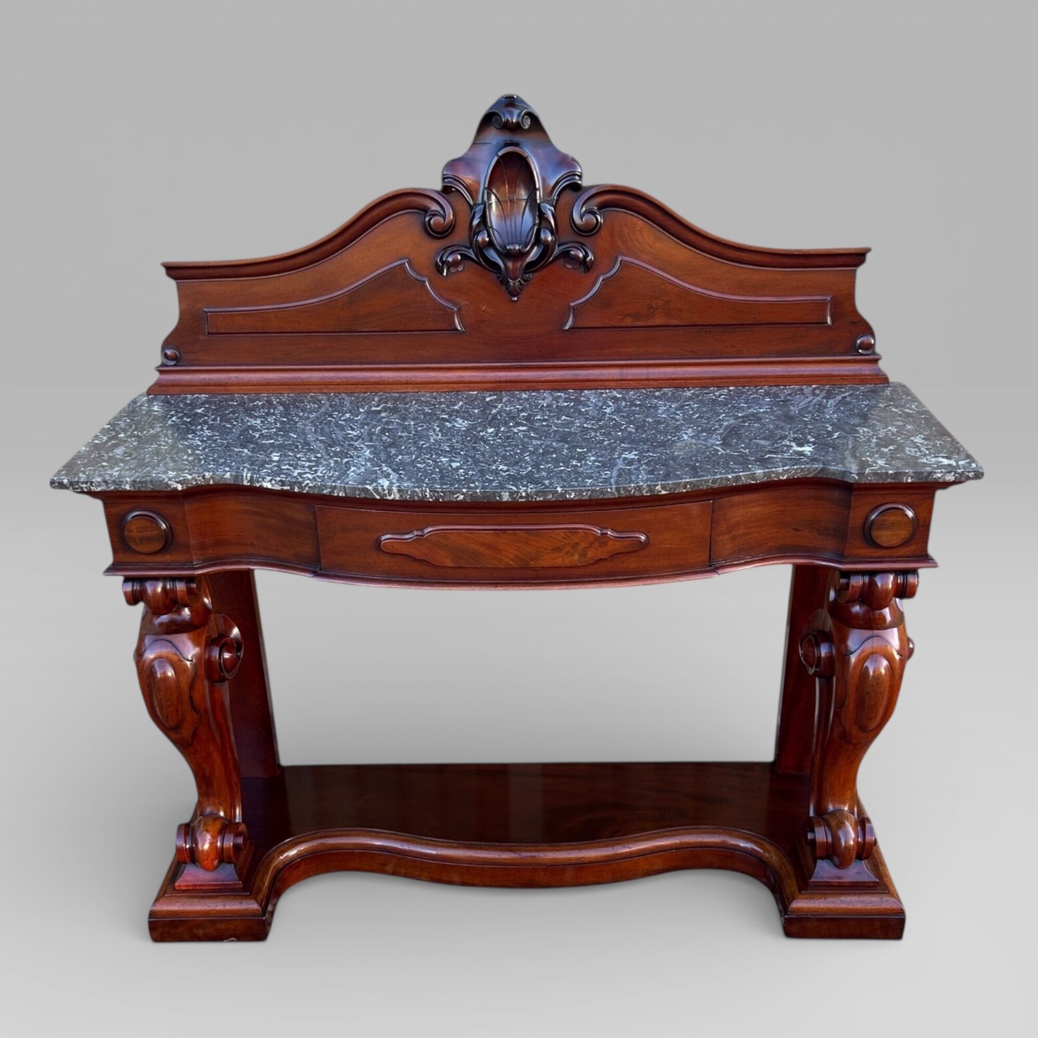 Here we have a Victorian Mahogany & Marble serpentine shaped Console Table. This console table has a shaped grey and white veined marble top, a single drawer to the centre of the frieze, a carved back to the top and moulding to the bottom of the frieze. The front legs are thick polished scroll shaped legs with carvings to the middle and the whole piece stands on a polished mahogany plinth base.