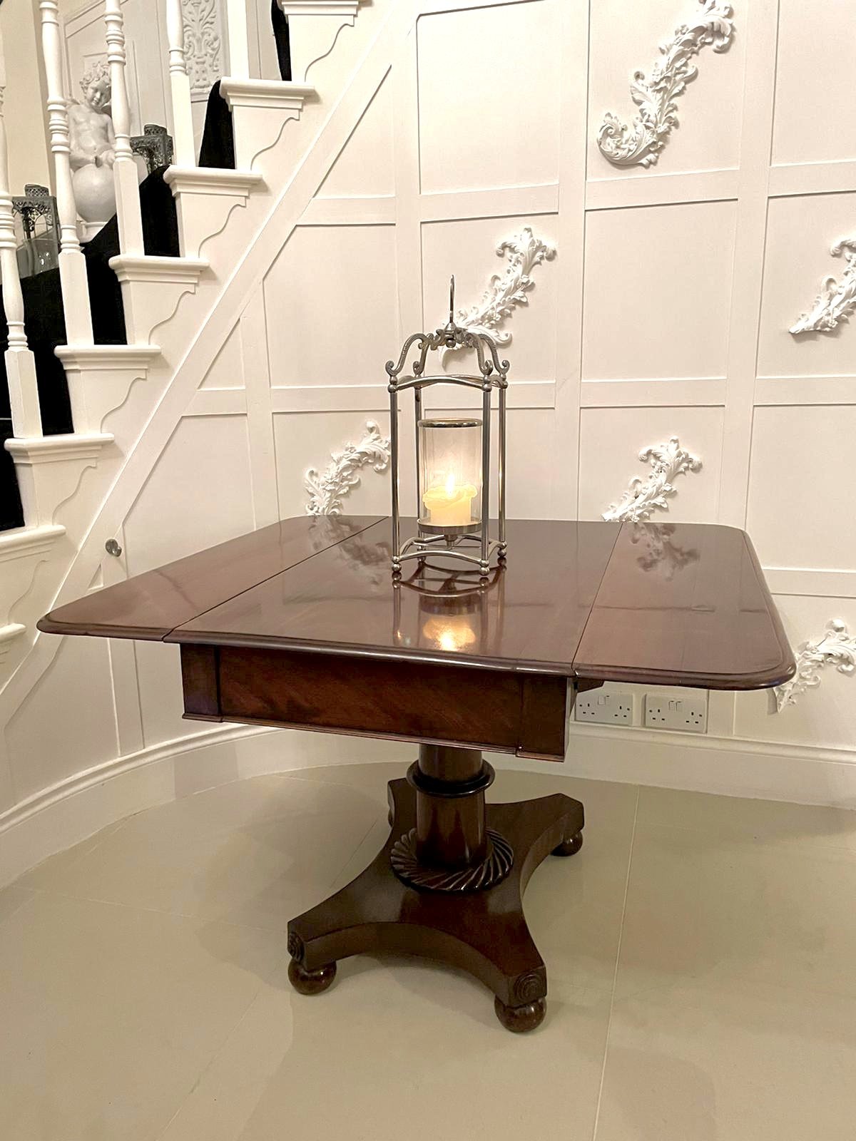 Antique Victorian mahogany pedestal centre table having a quality mahogany top with two drop leaves, one drawer to the frieze and raised on a lovely turned shaped column. It stands on a platform base with the original turned bun feet.