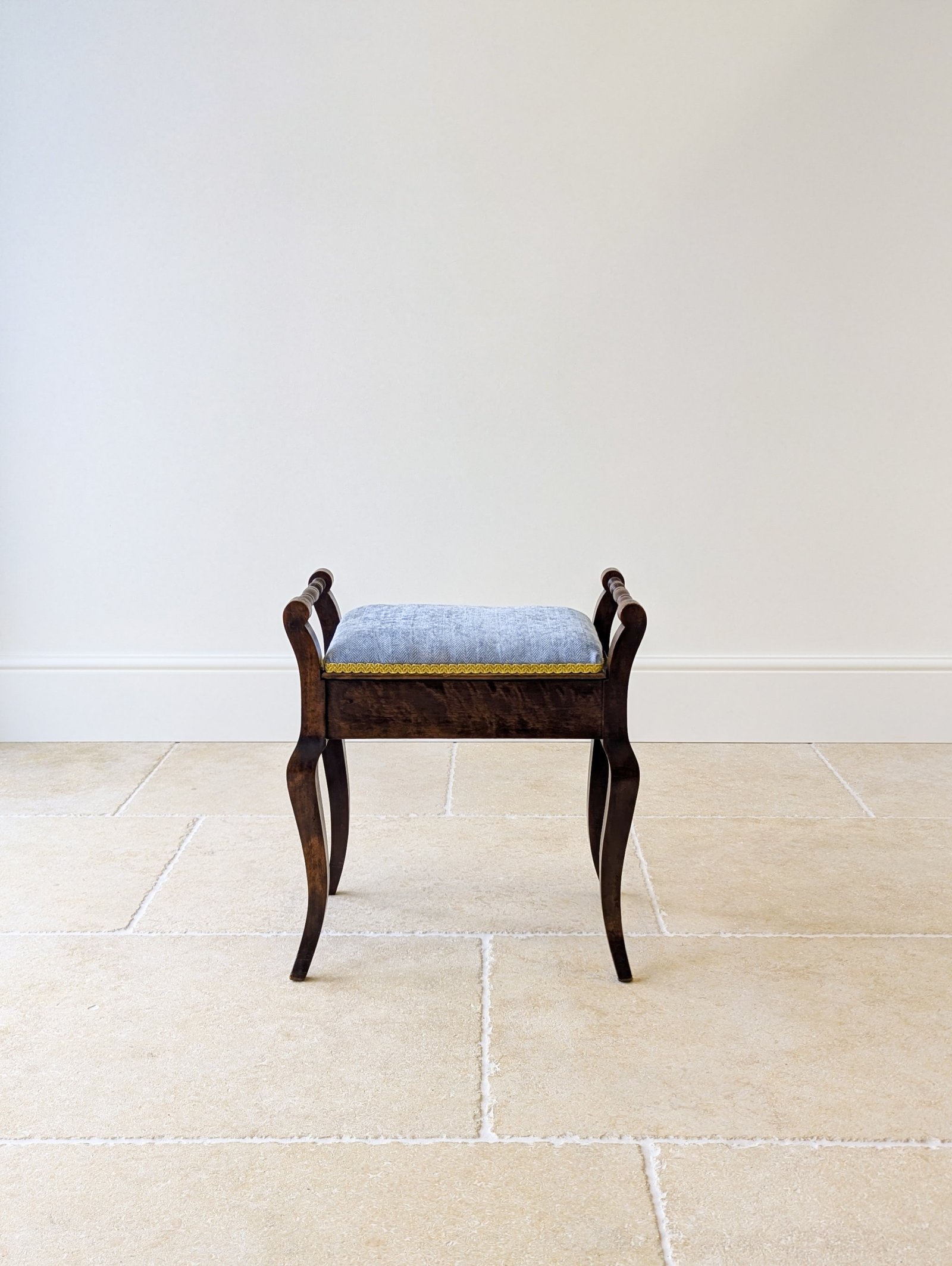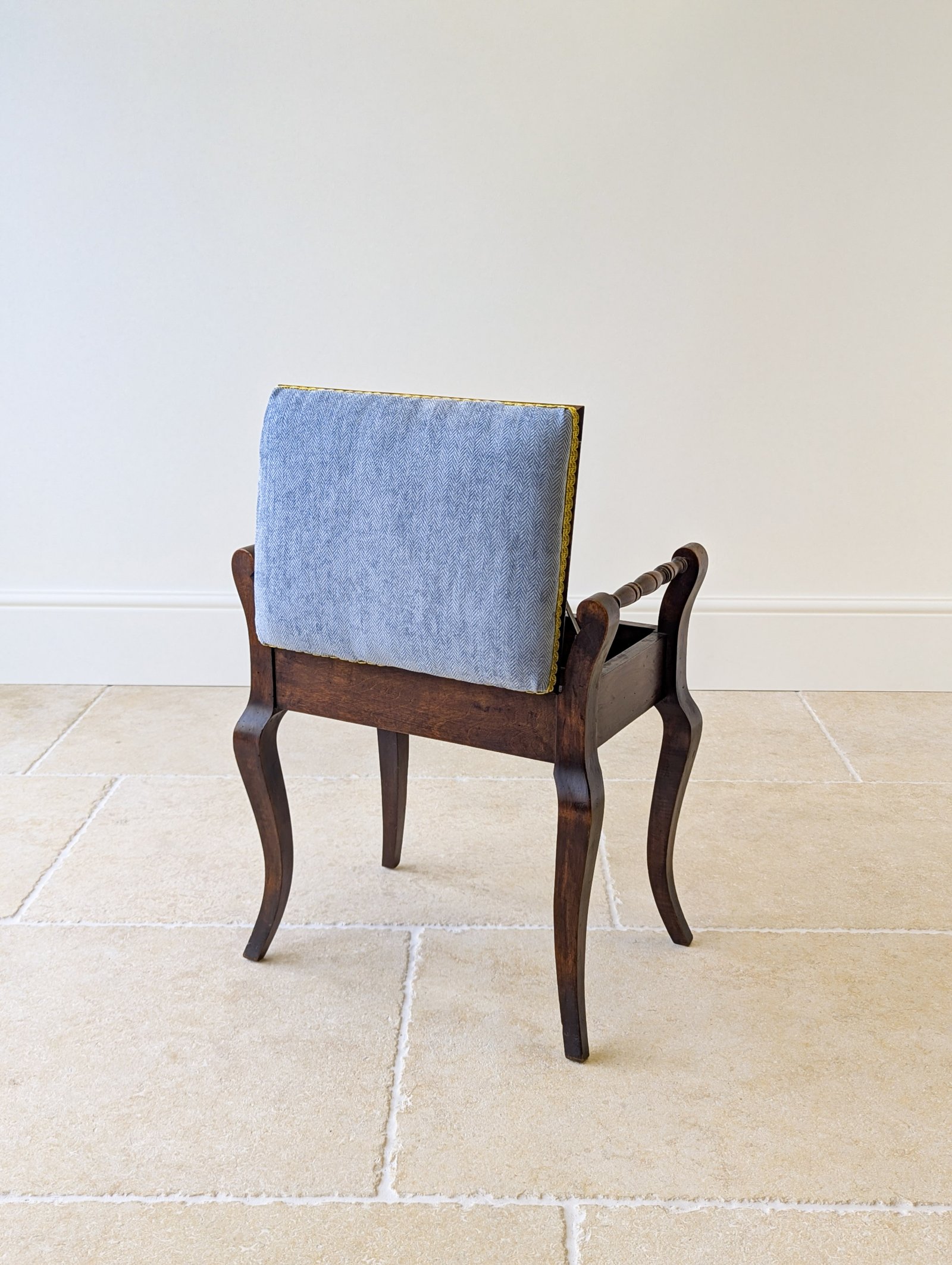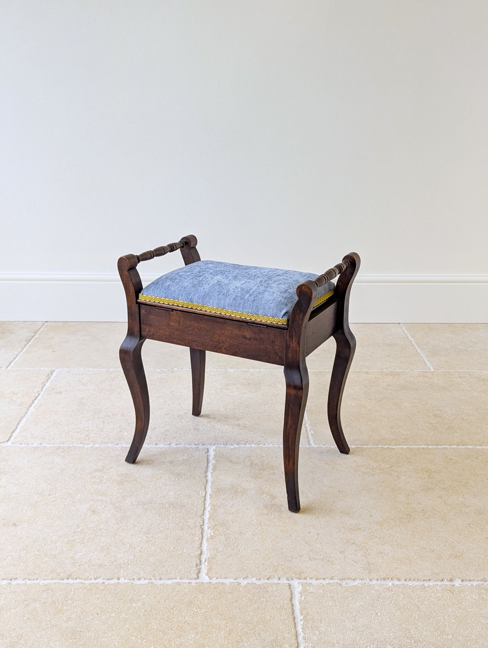 Combining practical design with decorative presence, ideal beside a period piano but equally suitable for a dressing table or as an occasional seat in a bedroom or hall. Upholstered in a soft blue fabric trimmed with gold braid, providing a tasteful contrast to the rich mahogany tones.