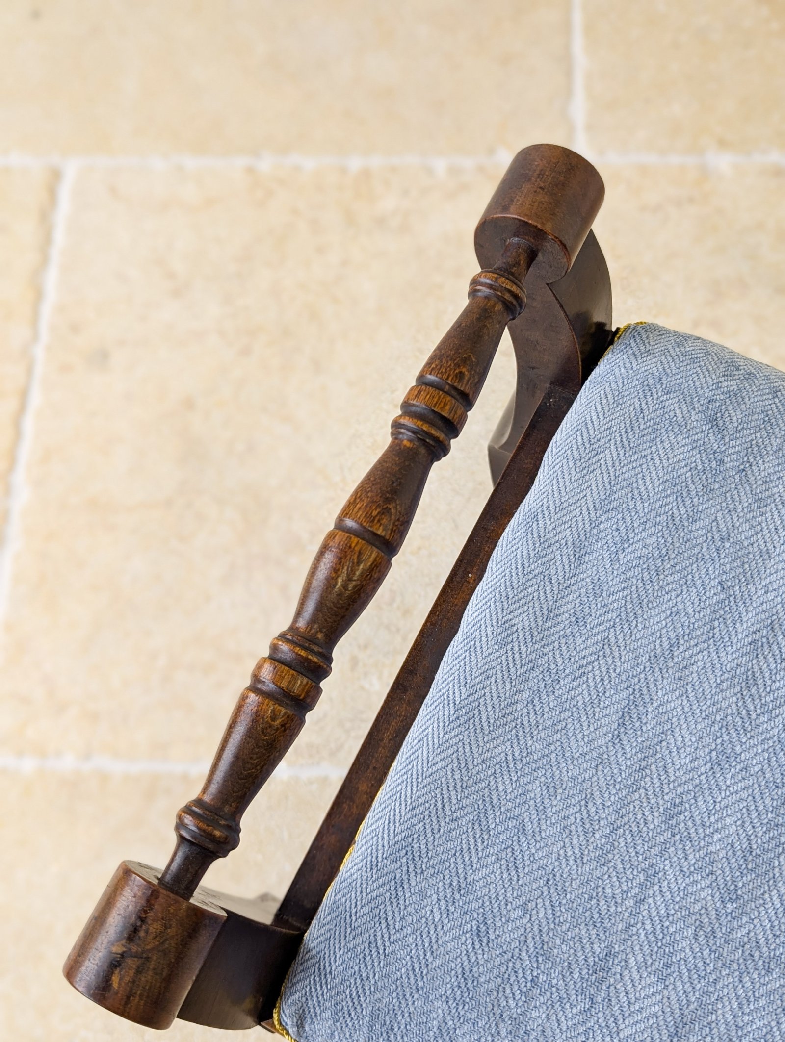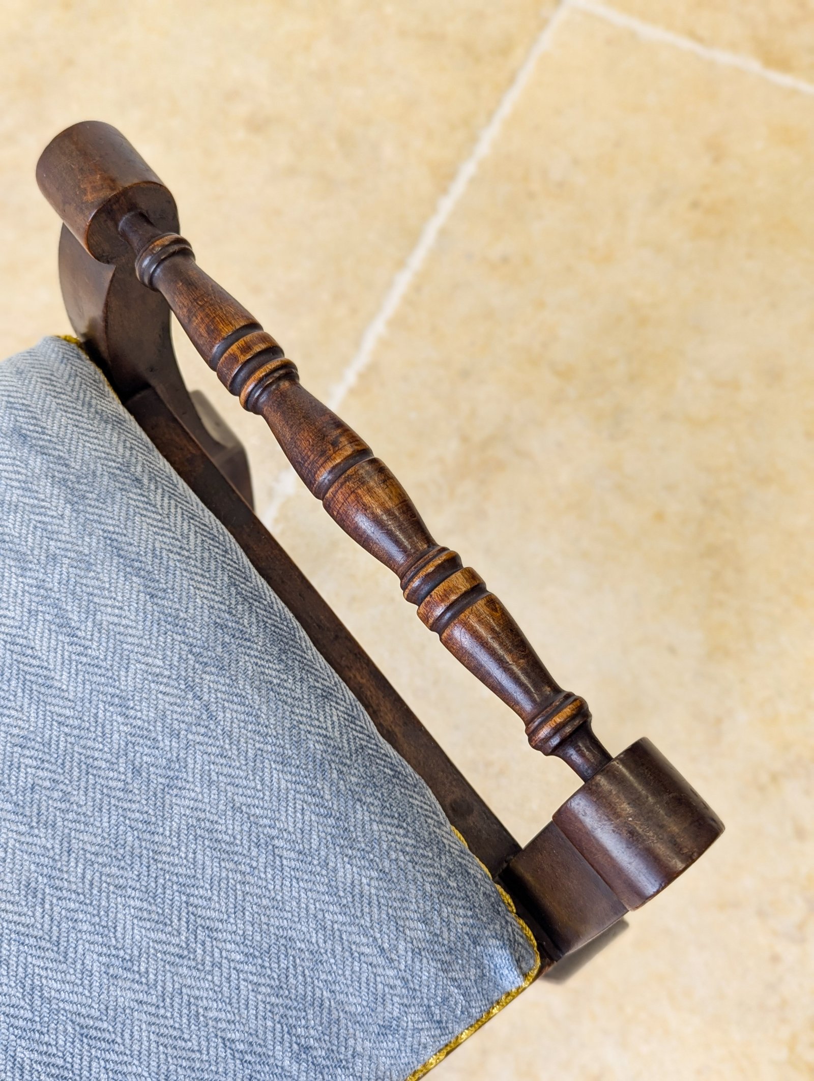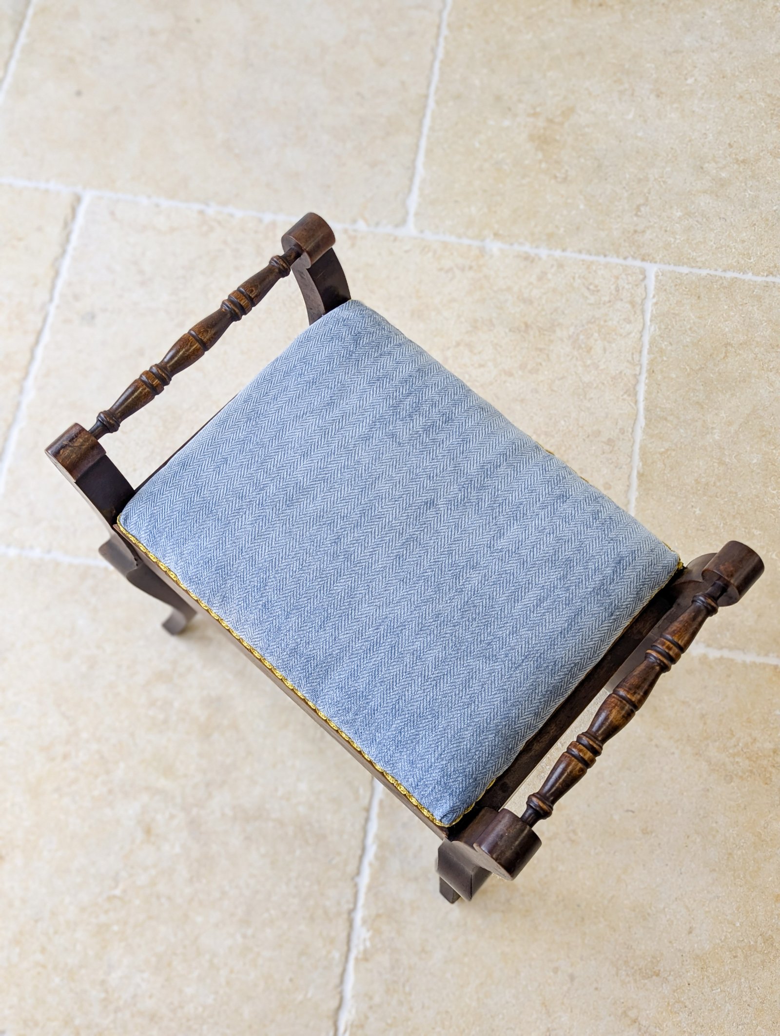 Combining practical design with decorative presence, ideal beside a period piano but equally suitable for a dressing table or as an occasional seat in a bedroom or hall. Upholstered in a soft blue fabric trimmed with gold braid, providing a tasteful contrast to the rich mahogany tones.