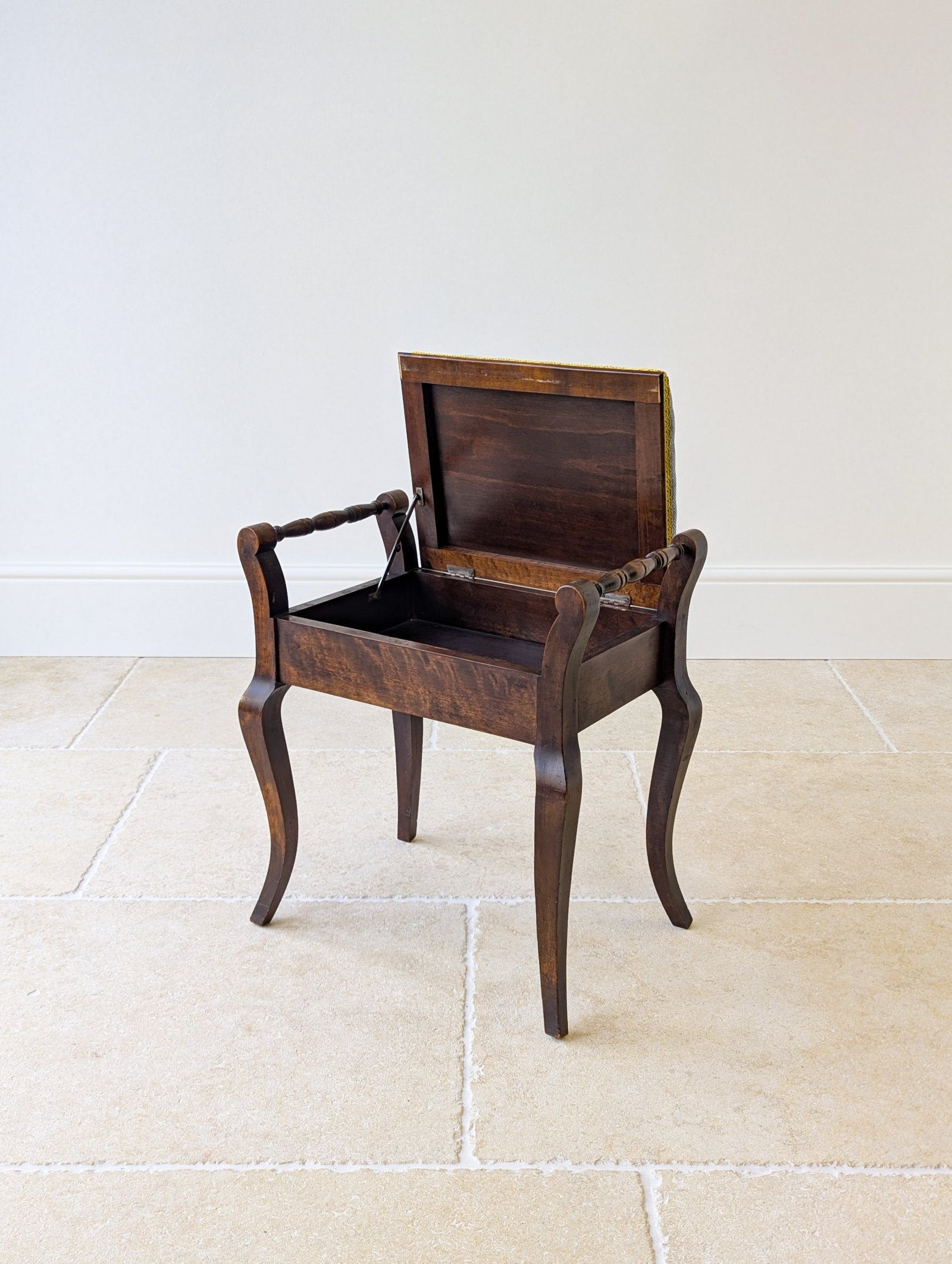 A late Victorian mahogany piano stool, the hinged upholstered seat lifting to reveal a useful storage compartment and standing on elegantly shaped cabriole legs with turned spindle side supports flanking the seat.