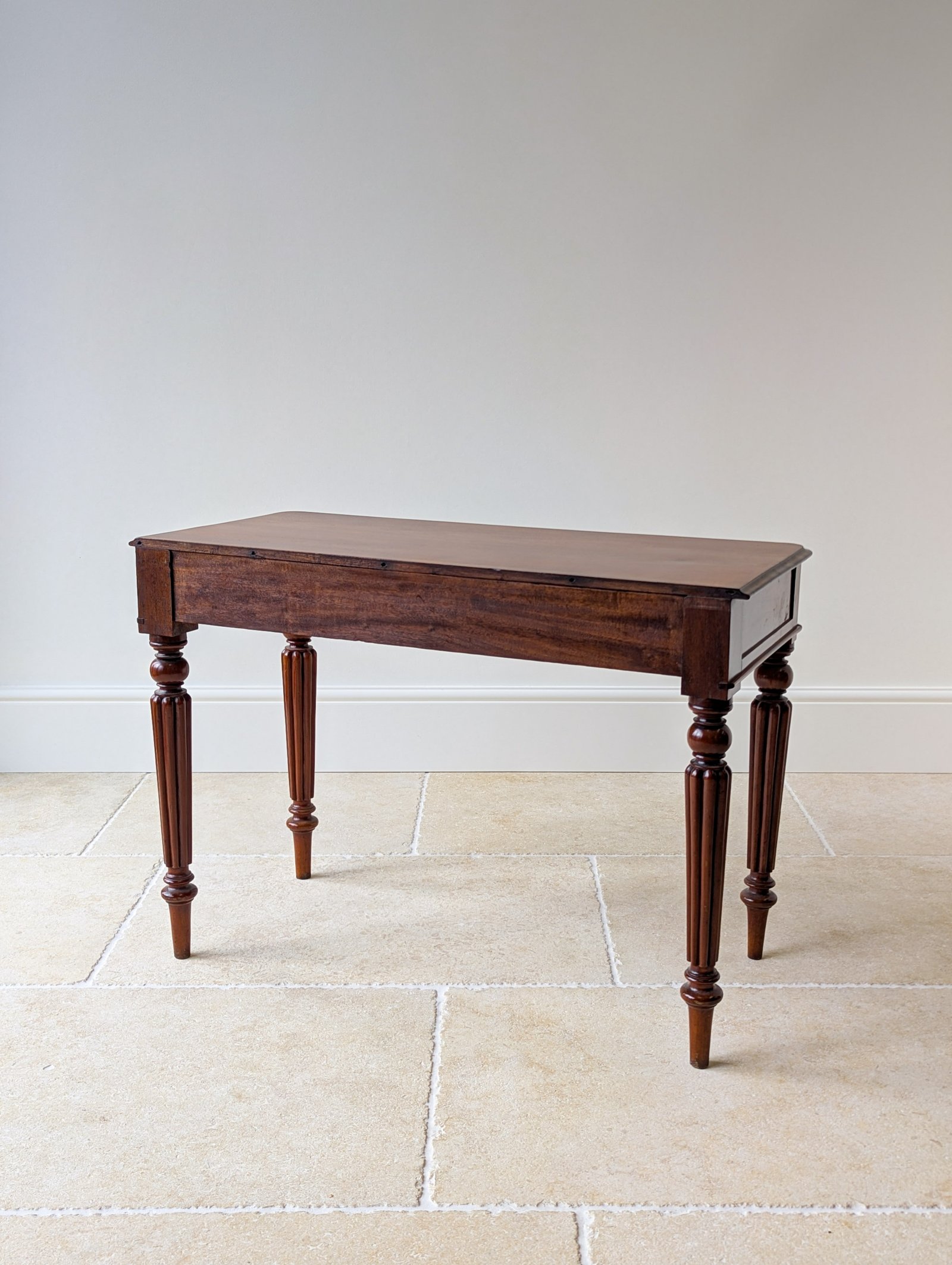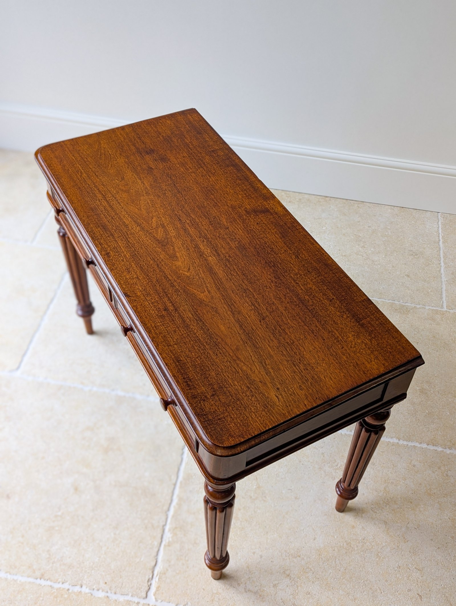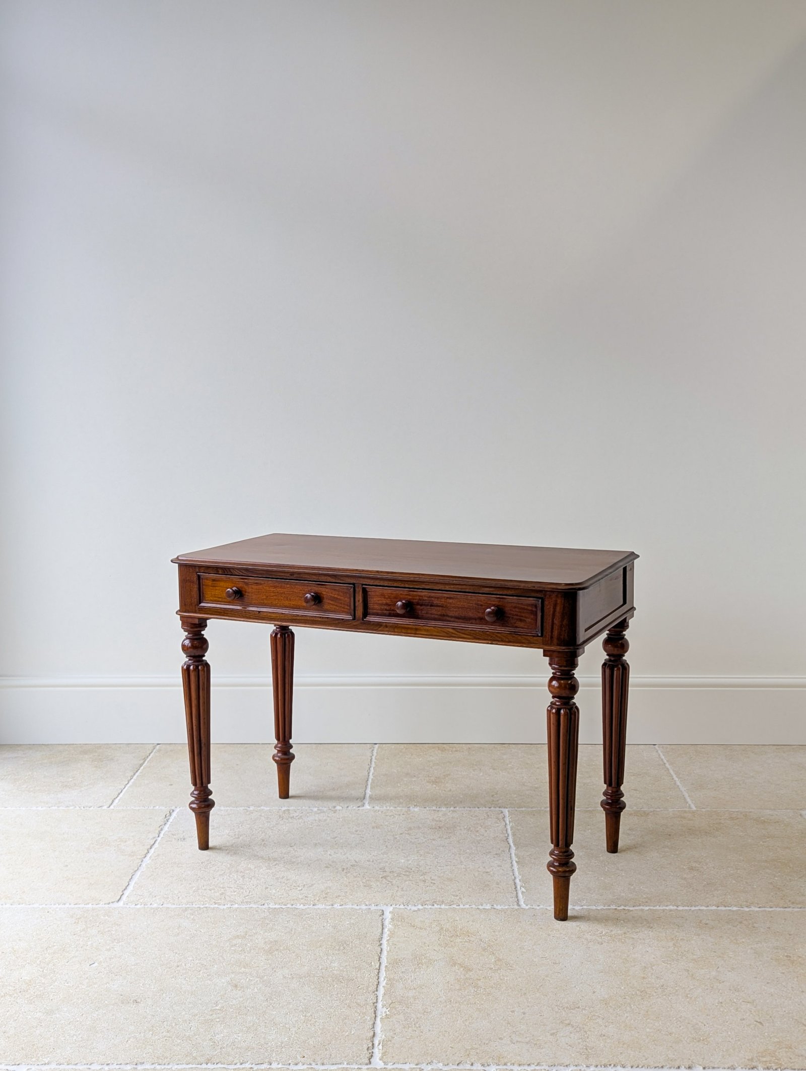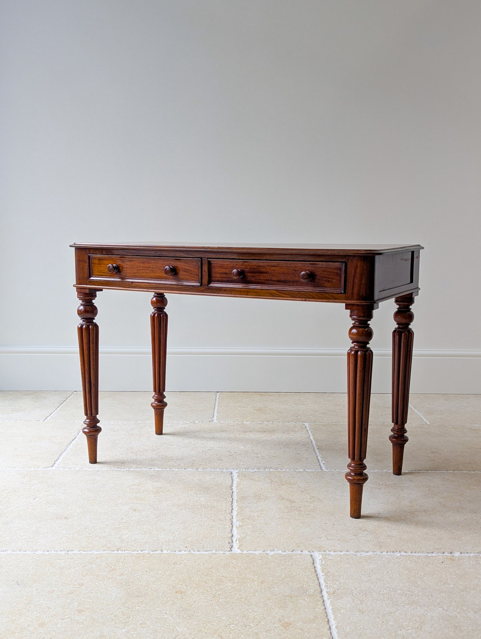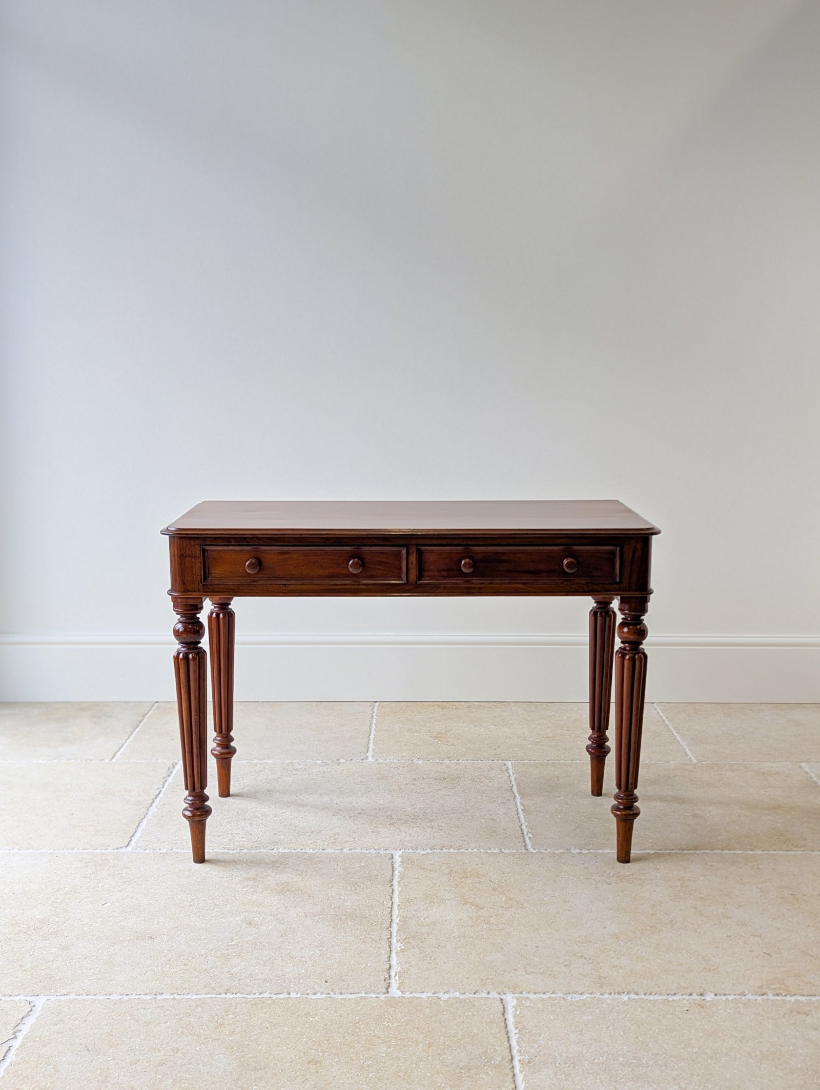 A refined mid-Victorian solid mahogany writing table of elegant Regency-influenced design. The thumb-moulded edge rectangular top sits above two frieze drawers with turned knobs, all raised on finely turned and reeded tapering legs in the manner of Gillows.