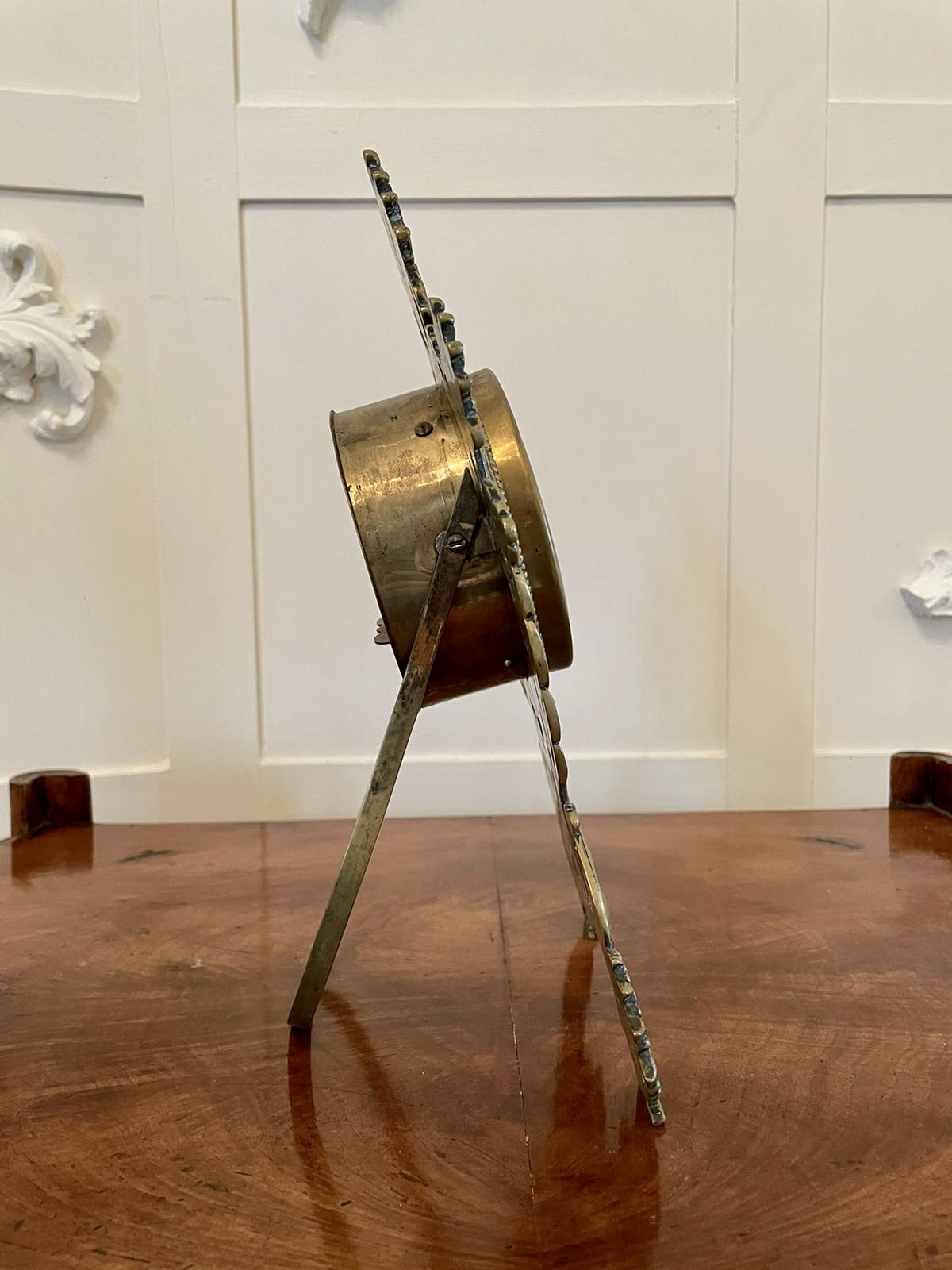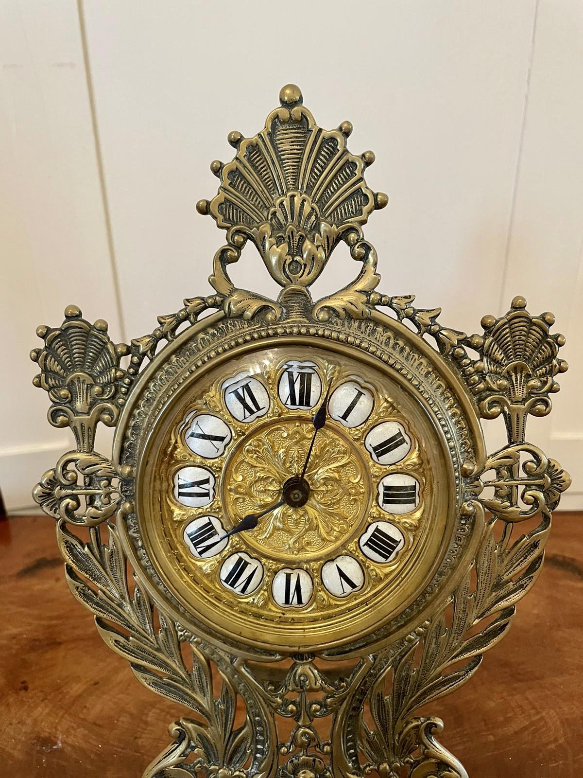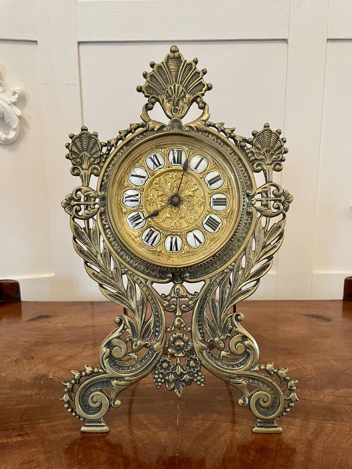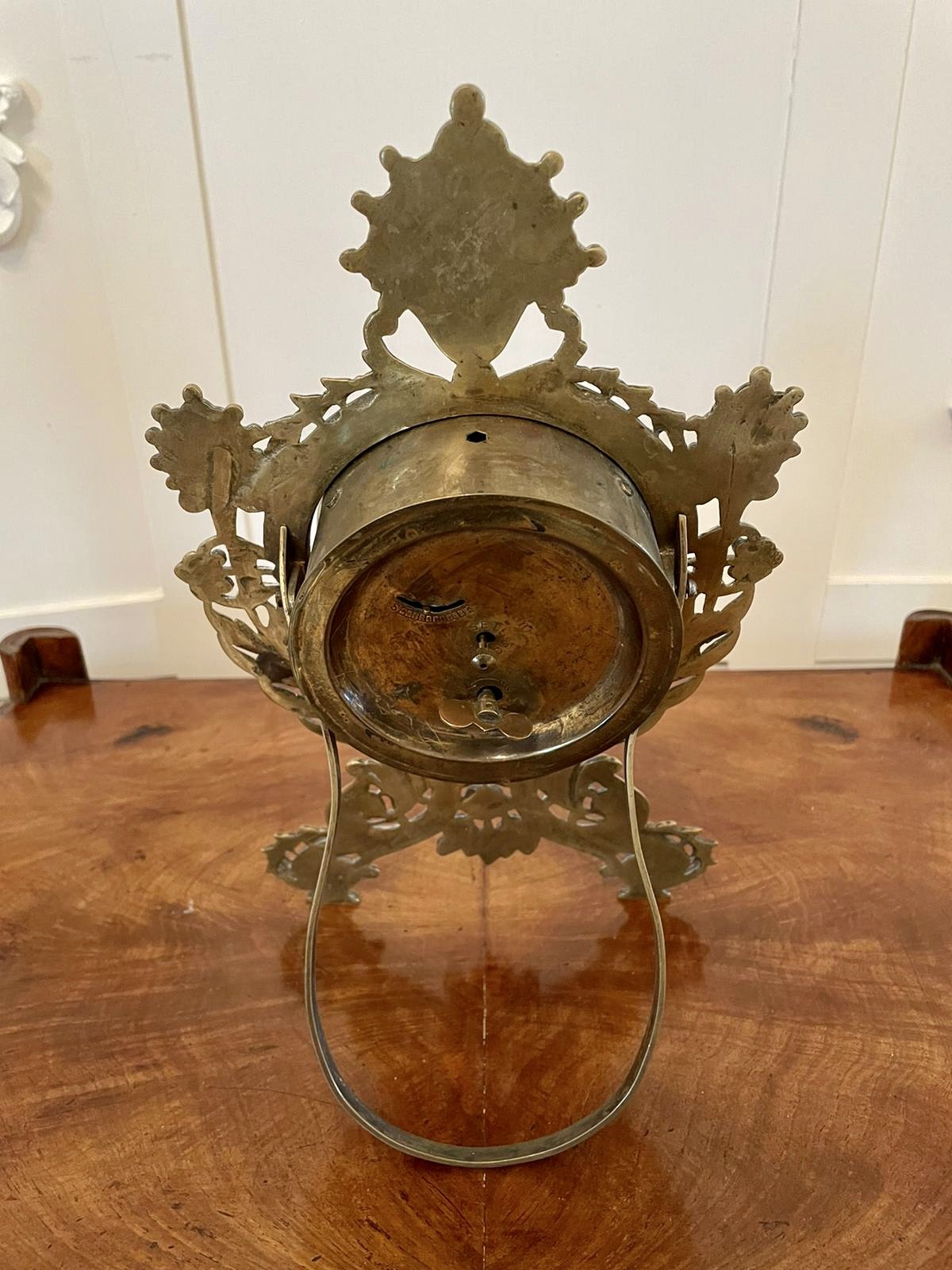 Antique Victorian ornate brass desk clock having an exquisite ornate brass and enamel dial with original hands, eight day french movement in a very pretty ornate brass case with scrolls, leaves and flowers. Original swing out support in good working order.