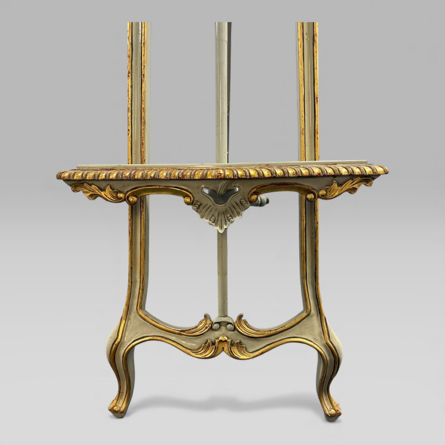 This late Victorian easel, dating to around 1890, is crafted in the Louis XV style and finished in a soft mint green paint with parcel-gilt highlights. The top features a finely carved shell cresting above a classic rise-and-fall mechanism, supported by a shaped lower shelf with a gadrooned edge. The piece stands on elegant cabriole legs, creating an attractive French-inspired silhouette.