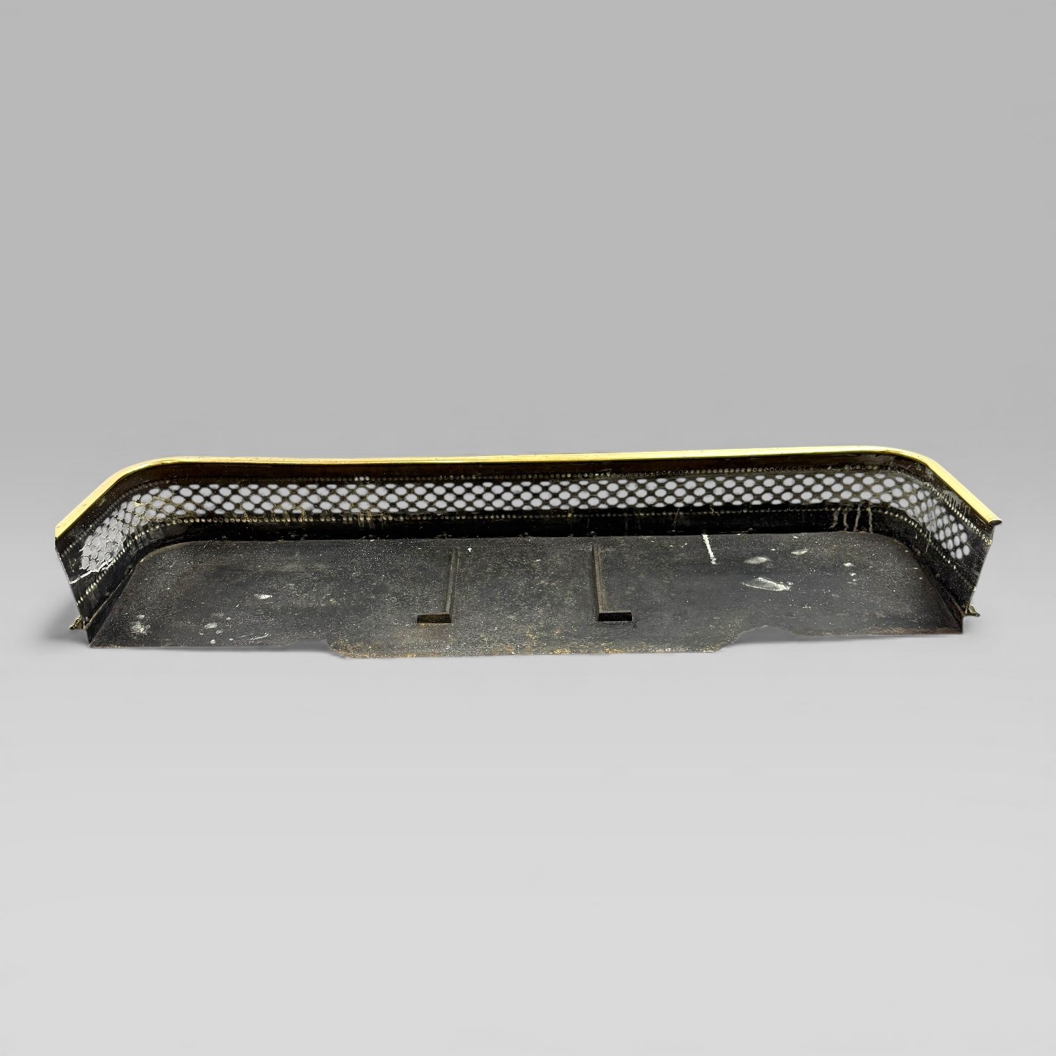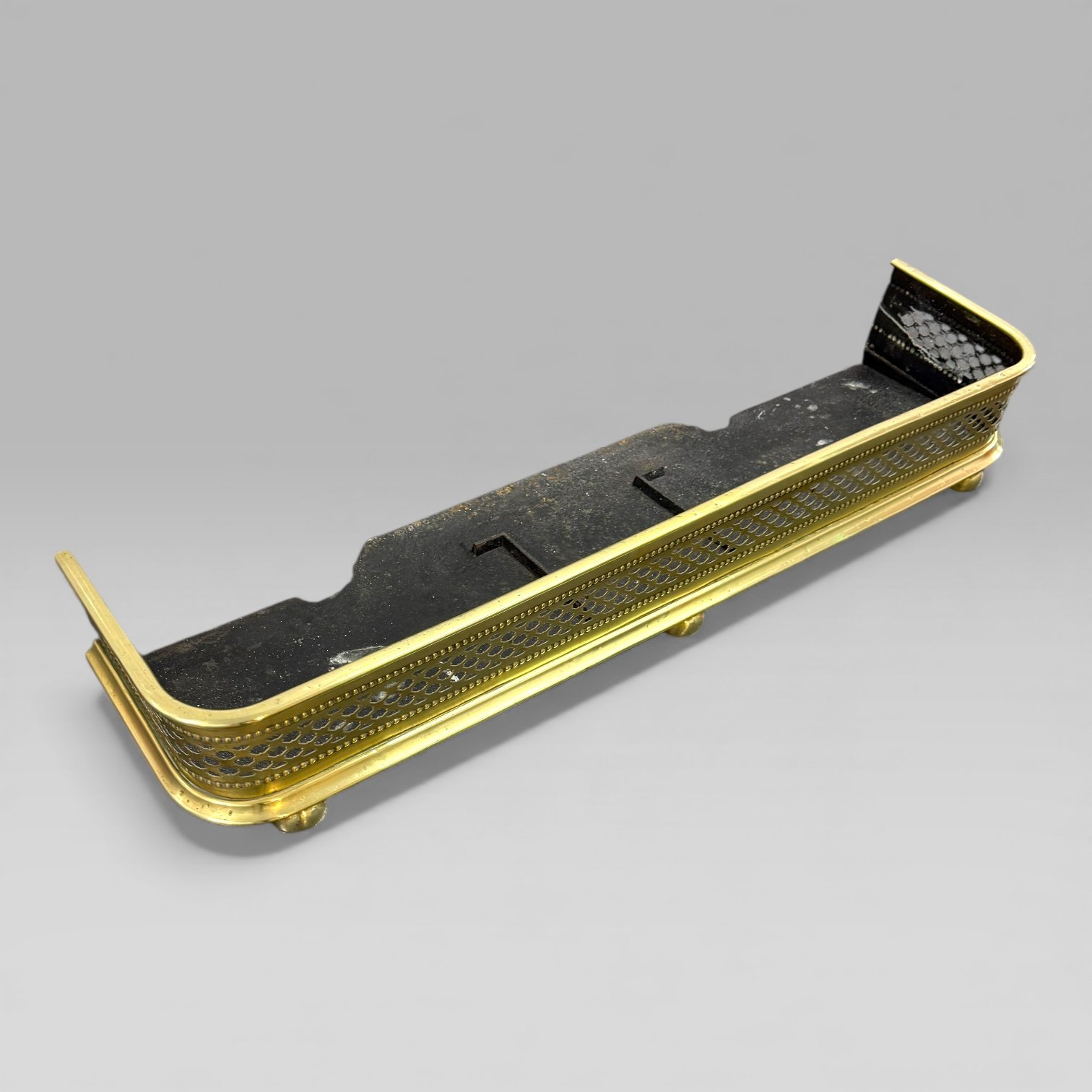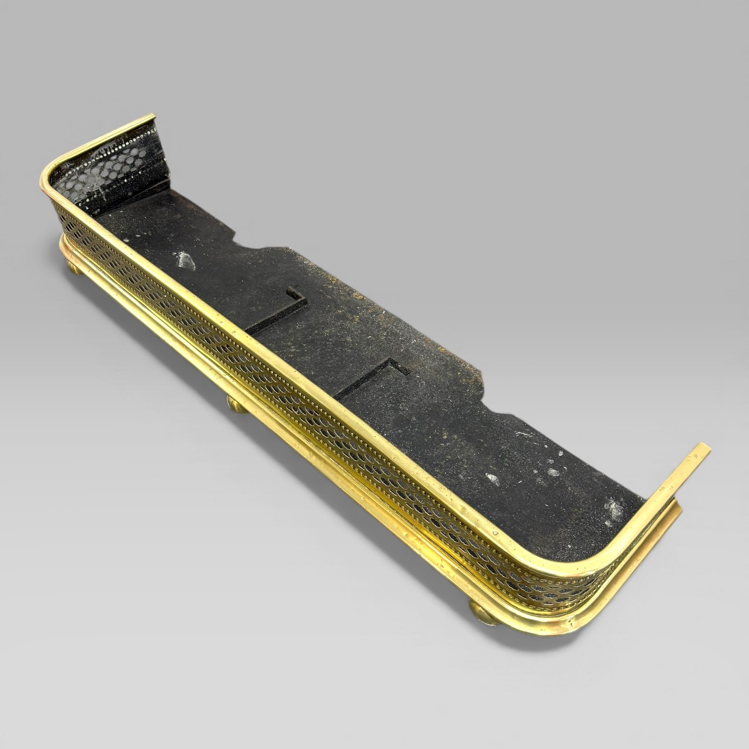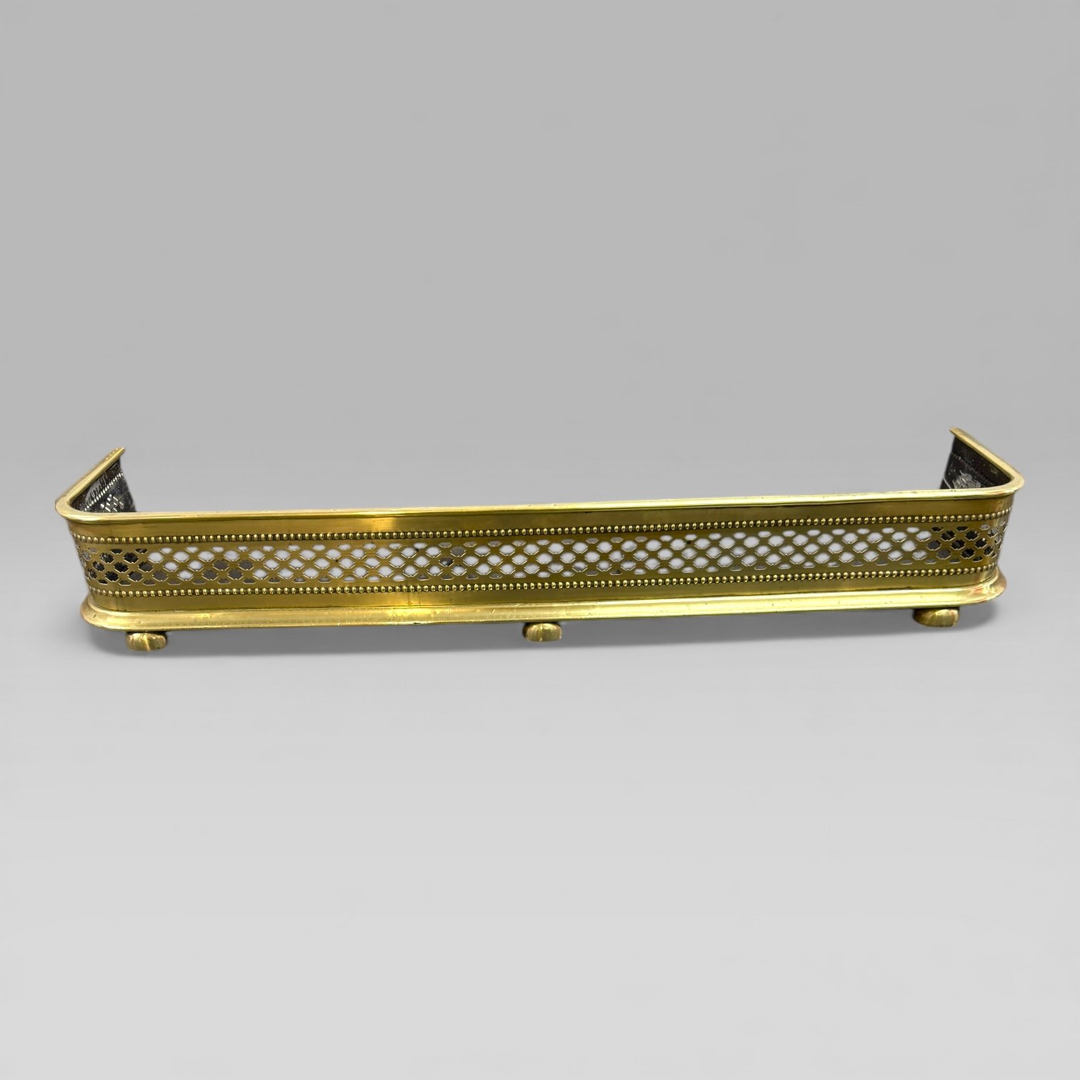 An antique Victorian pierced brass fire fender (fire kerb), dating to the late 19th century. The fender features intricate pierced fretwork decoration running around the entire perimeter, a characteristic decorative detail of the period.