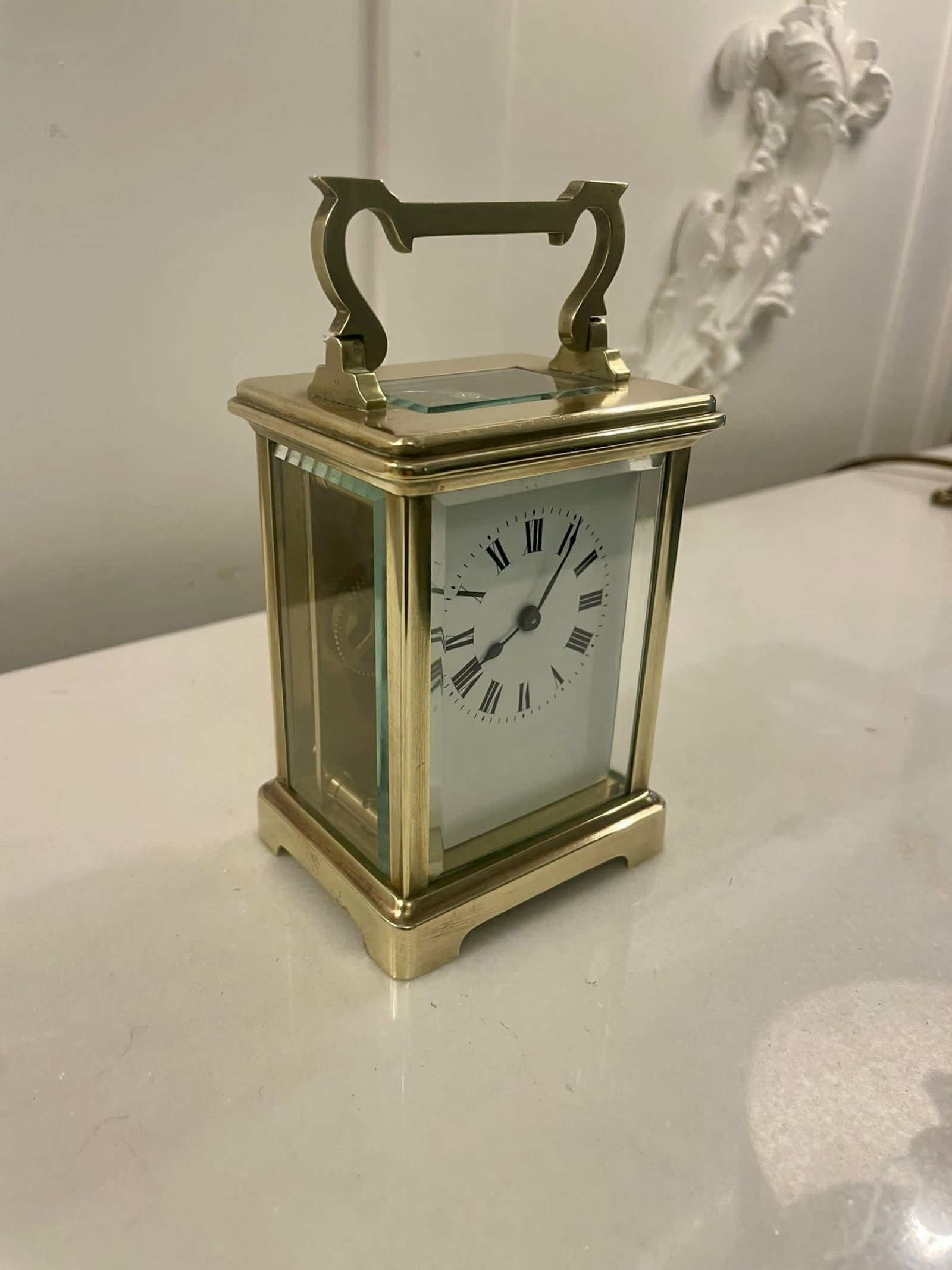 Antique Victorian quality brass carriage clock having a quality brass case with bevelled edge glass panels, 8 day French movement, white enamel dial with original hands, perfect working order
