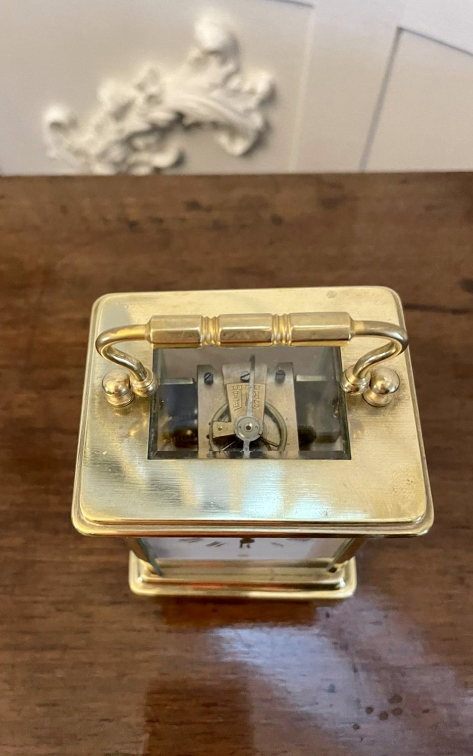 Antique Victorian quality brass carriage clock Having a quality brass carriage clock with bevelled edge glass panels white enamel dial with Roman numerals original hands 8 day movement and a shaped carrying handle to the top