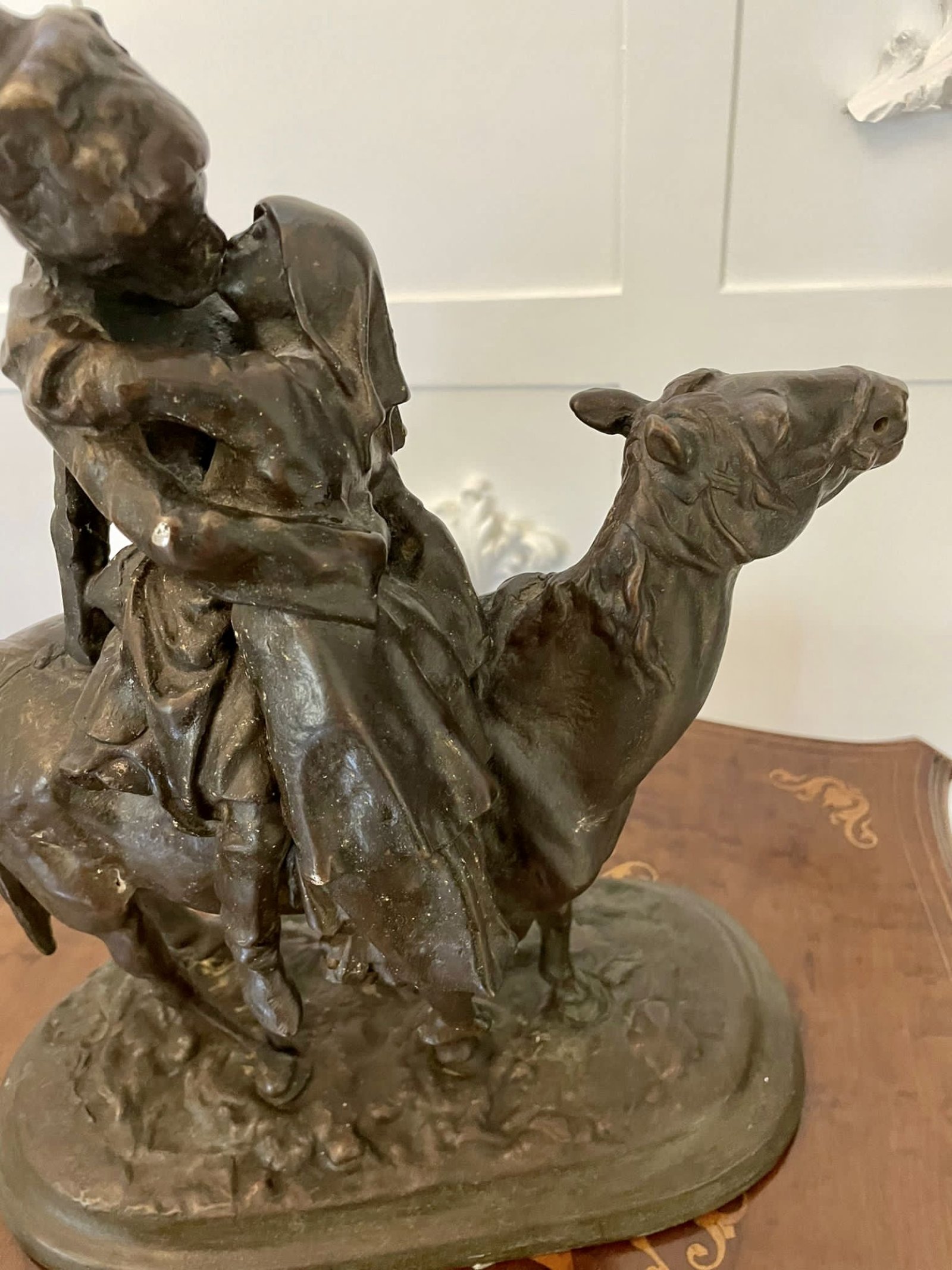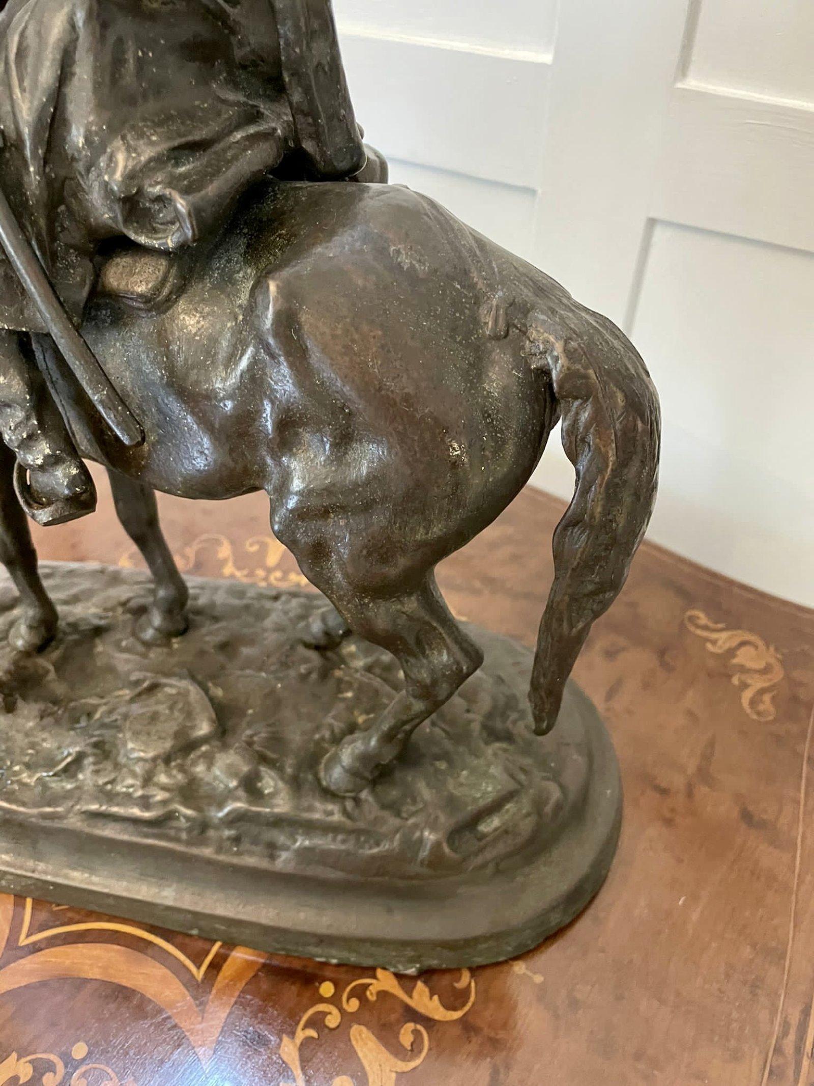 Antique Victorian quality bronze figure of a Cossack on horseback kissing his wife farewell with his sword and rifle at his side and mounted on quality bronze horse