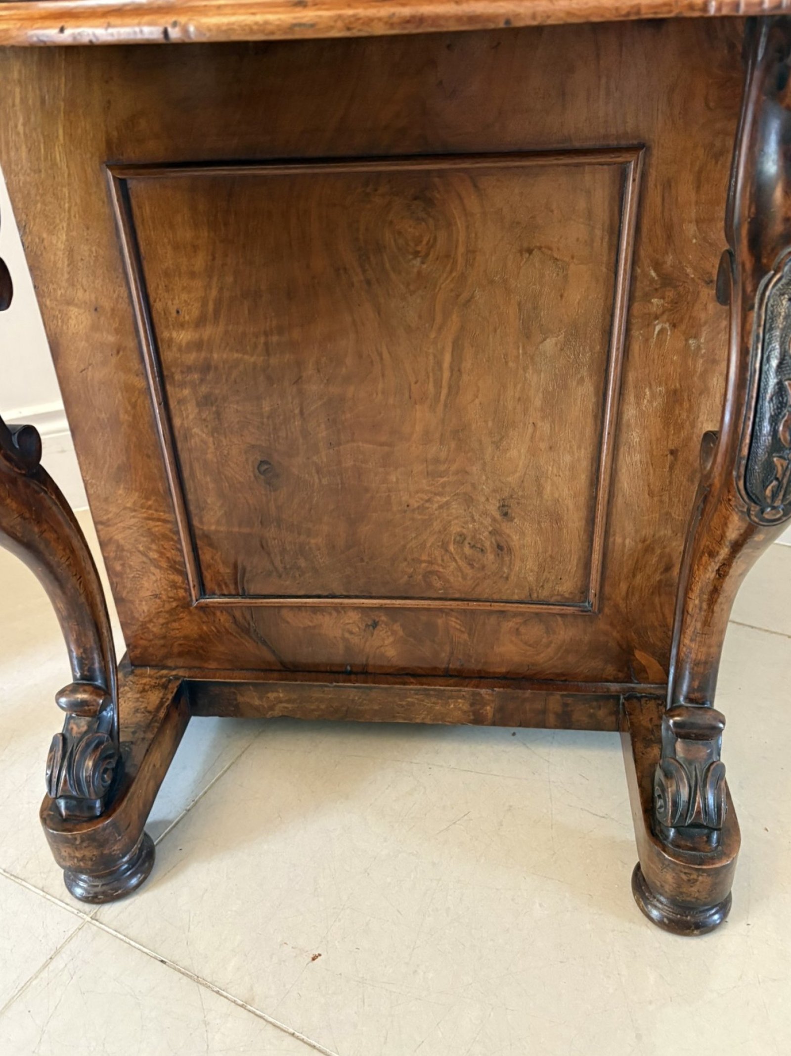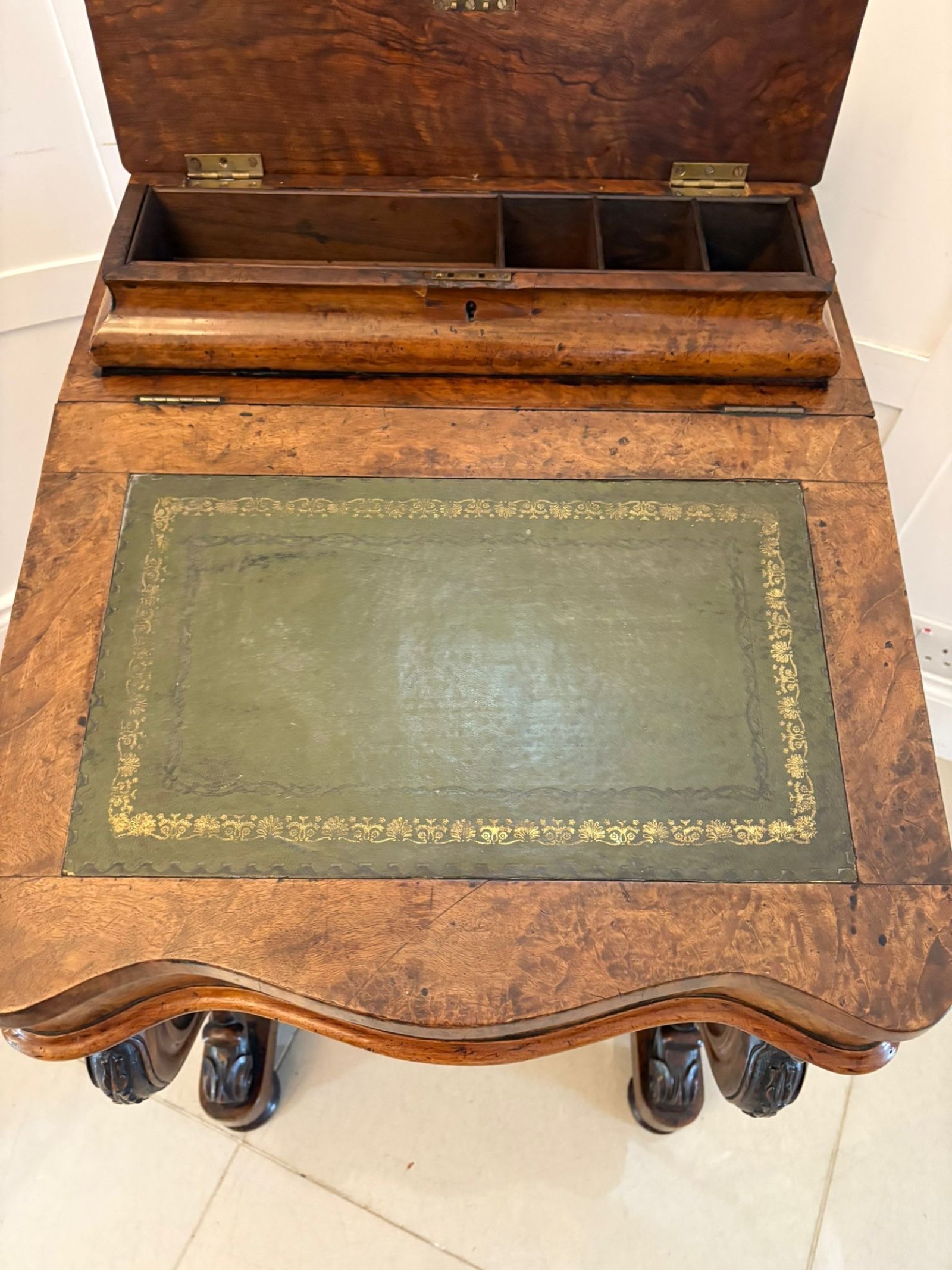 Antique Victorian quality burr walnut freestanding Davenport having a quality burr walnut serpentine shaped top opening to reveal a fitted interior above a serpentine shaped burr walnut leather writing surface opening to reveal 8 dummy drawers supported by shaped carved cabriole legs with scroll feet, 4 working drawers to the right hand side, 4 dummy drawers to the left side, freestanding burr walnut back, panelled front standing on a plinth base with turned feet.