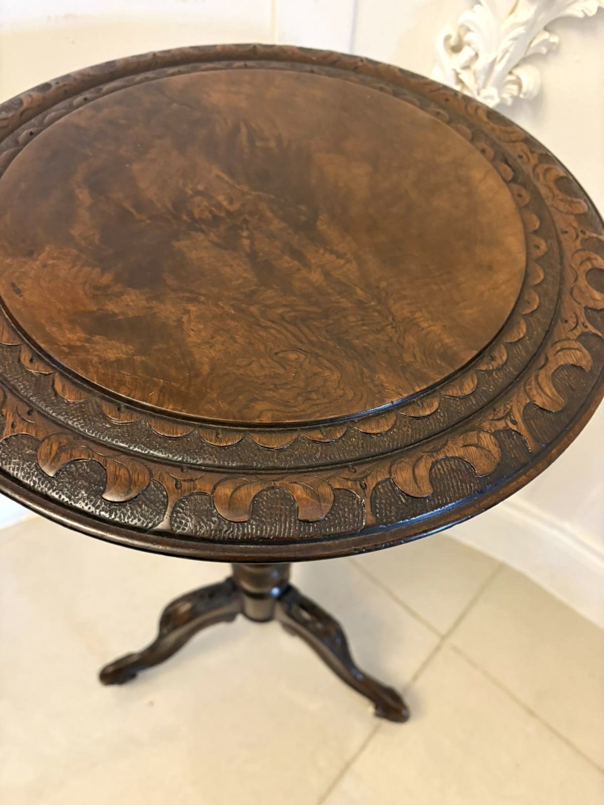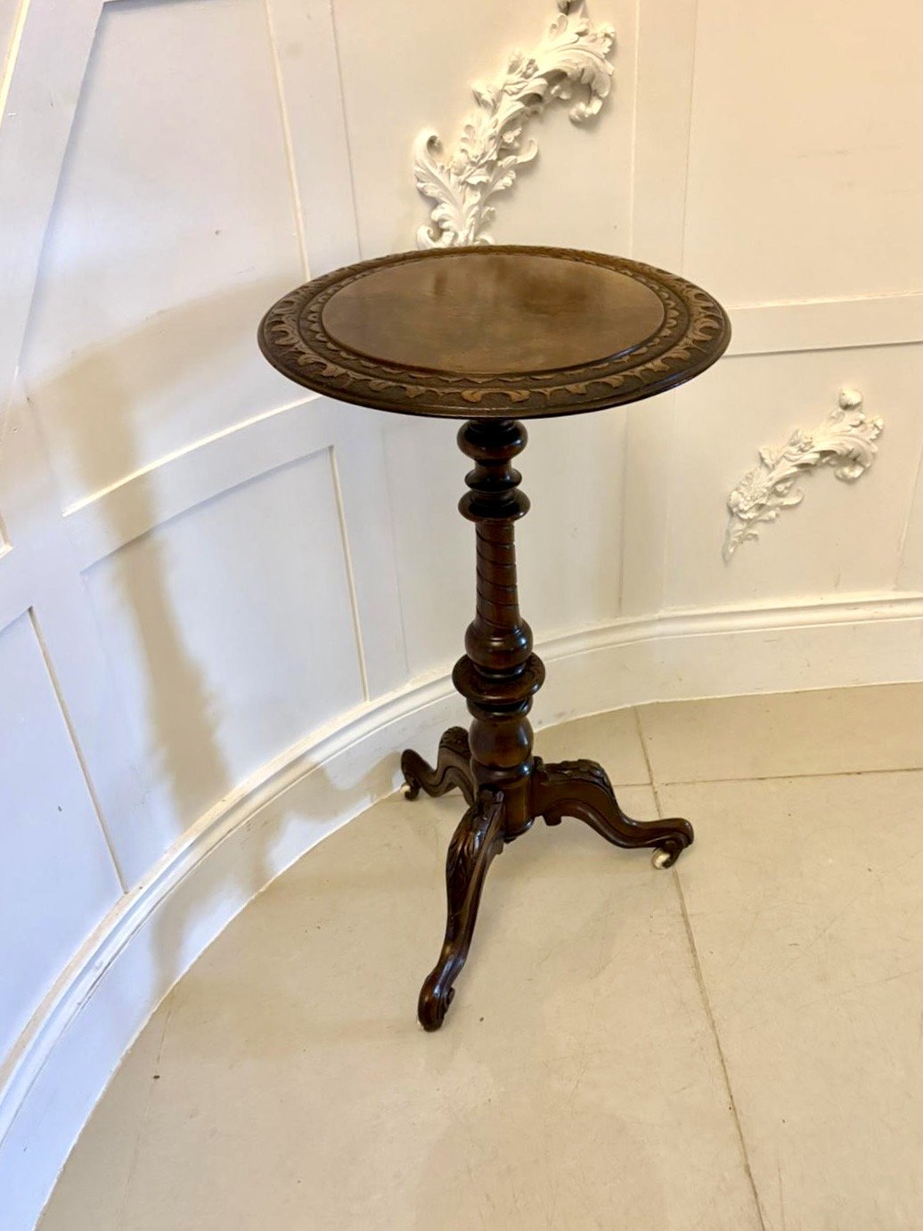 Antique Victorian quality carved burr walnut circular lamp table having a quality burr walnut circular shaped top with a fantastic carved edge supported by a turned tapering carved reeded pedestal column standing on three shaped carved cabriole legs with scroll feet and original castors