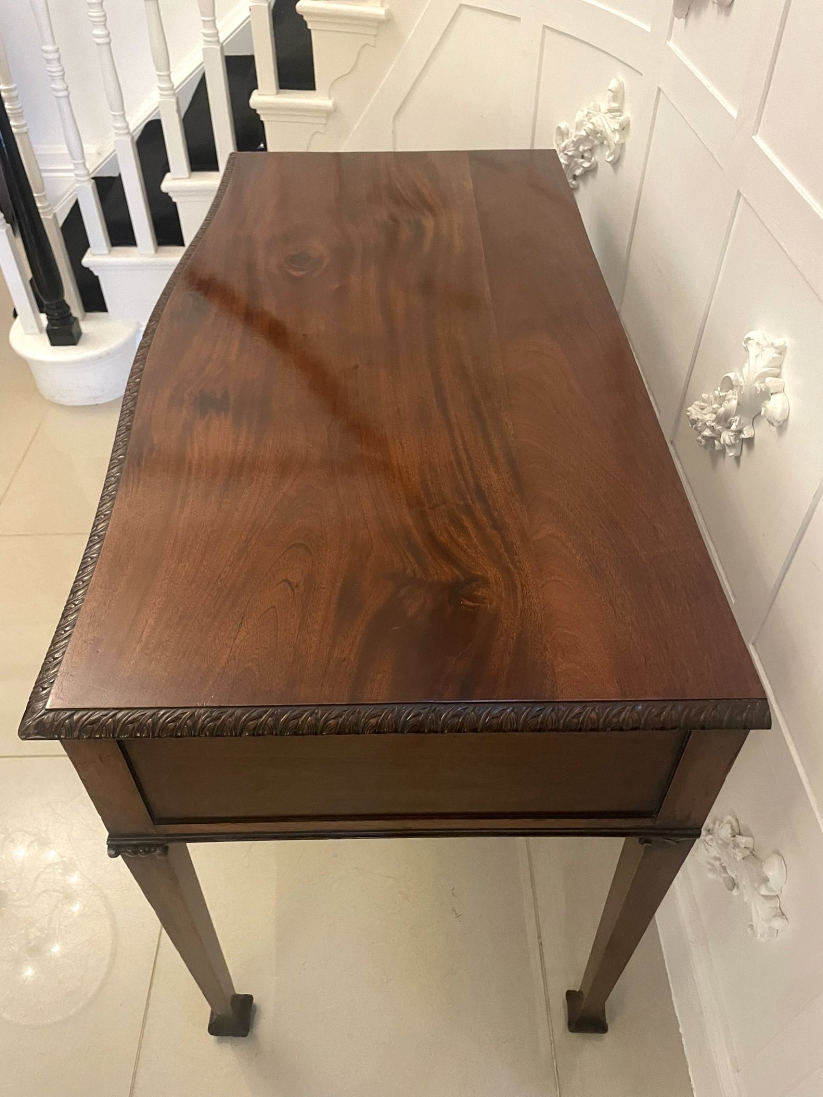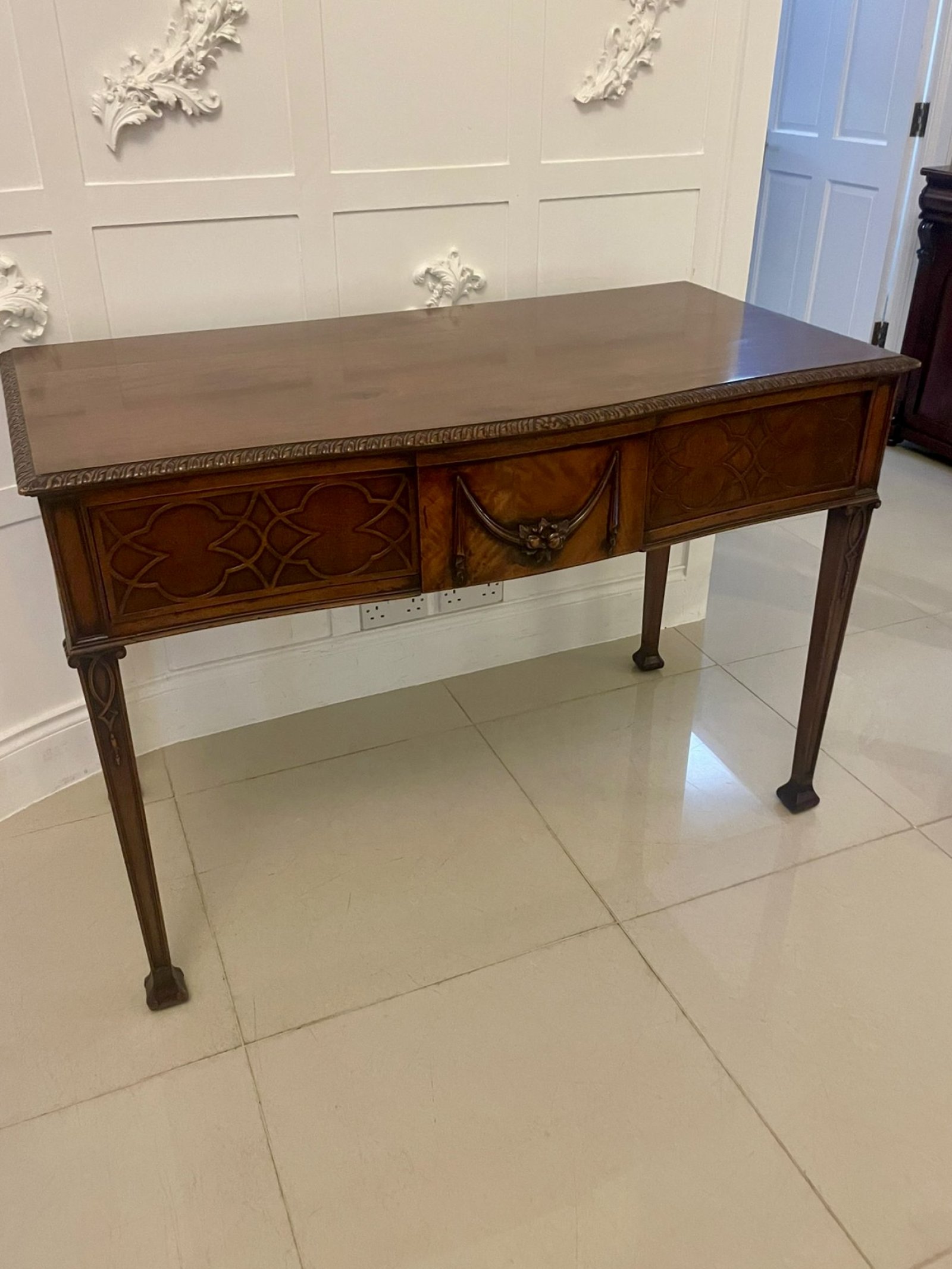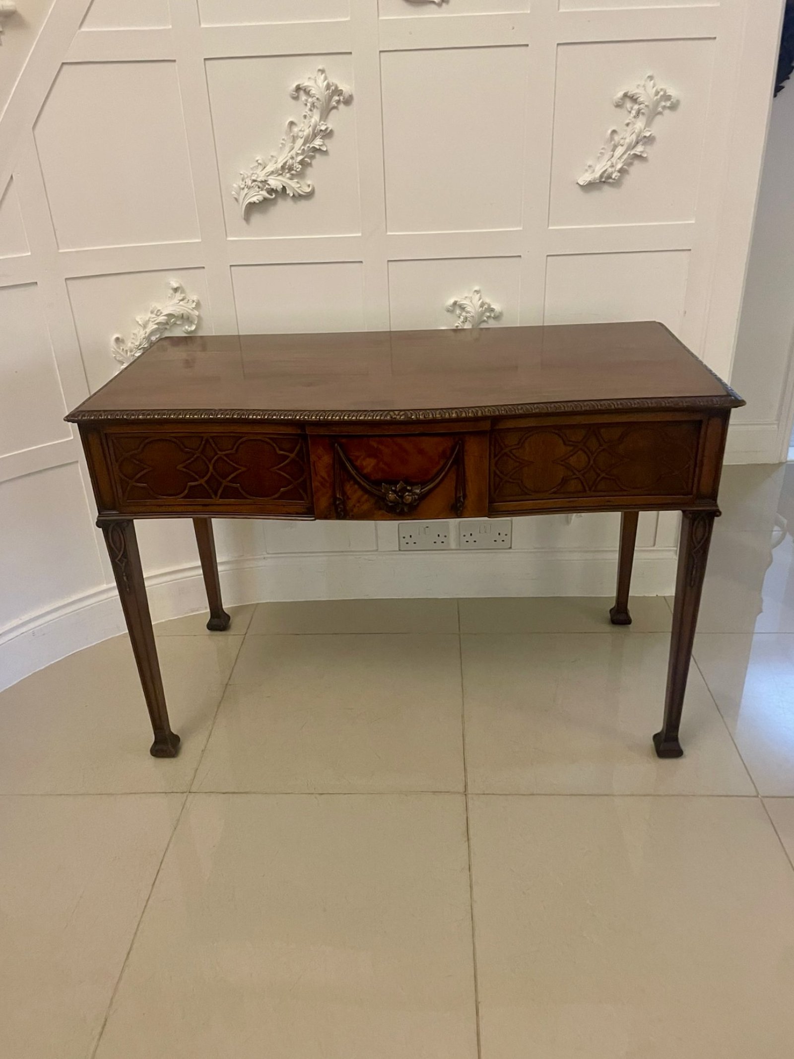 Antique Victorian quality carved figured mahogany serving/console table having a quality figured mahogany serpentine shaped top with a carved moulded edge above one long mahogany lined serpentine shaped drawer with wonderful carved decoration standing on elegant square tapering carved legs with unusual shaped block feet