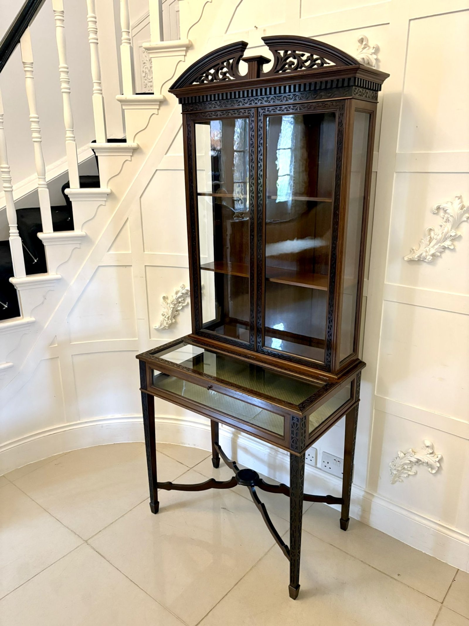 Antique Victorian quality carved mahogany bijouterie display cabinet having a quality carved mahogany 2 door glazed display cabinet with a pretty swan-neck pediment above a carved mahogany bijouterie cabinet standing on square tapering legs with spade feet united by shaped stretchers with a circular undertier.