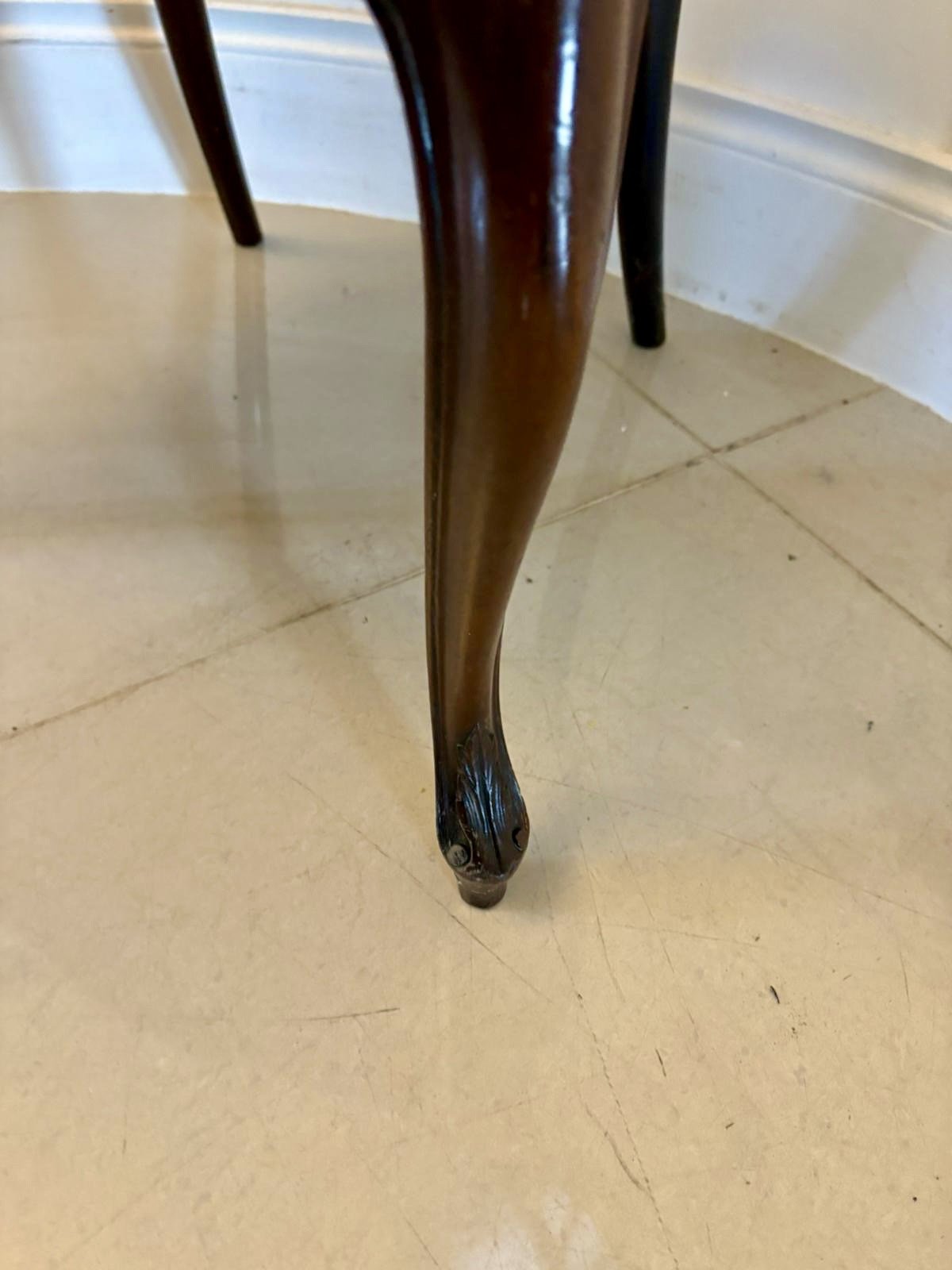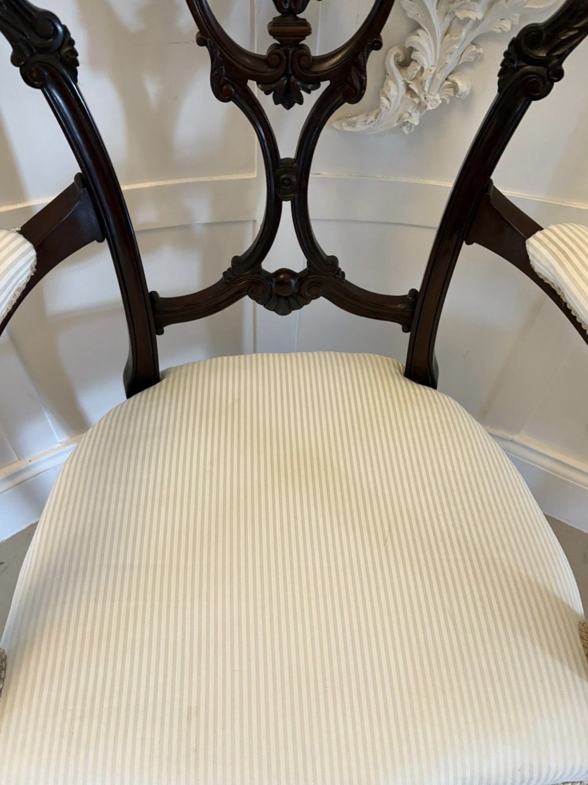 Antique Victorian quality carved mahogany desk chair having a quality carved mahogany shaped back, carved mahogany open arms with shape supports, newly reupholstered seat in a quality fabric standing on shaped cabriole legs to the front out swept back legs