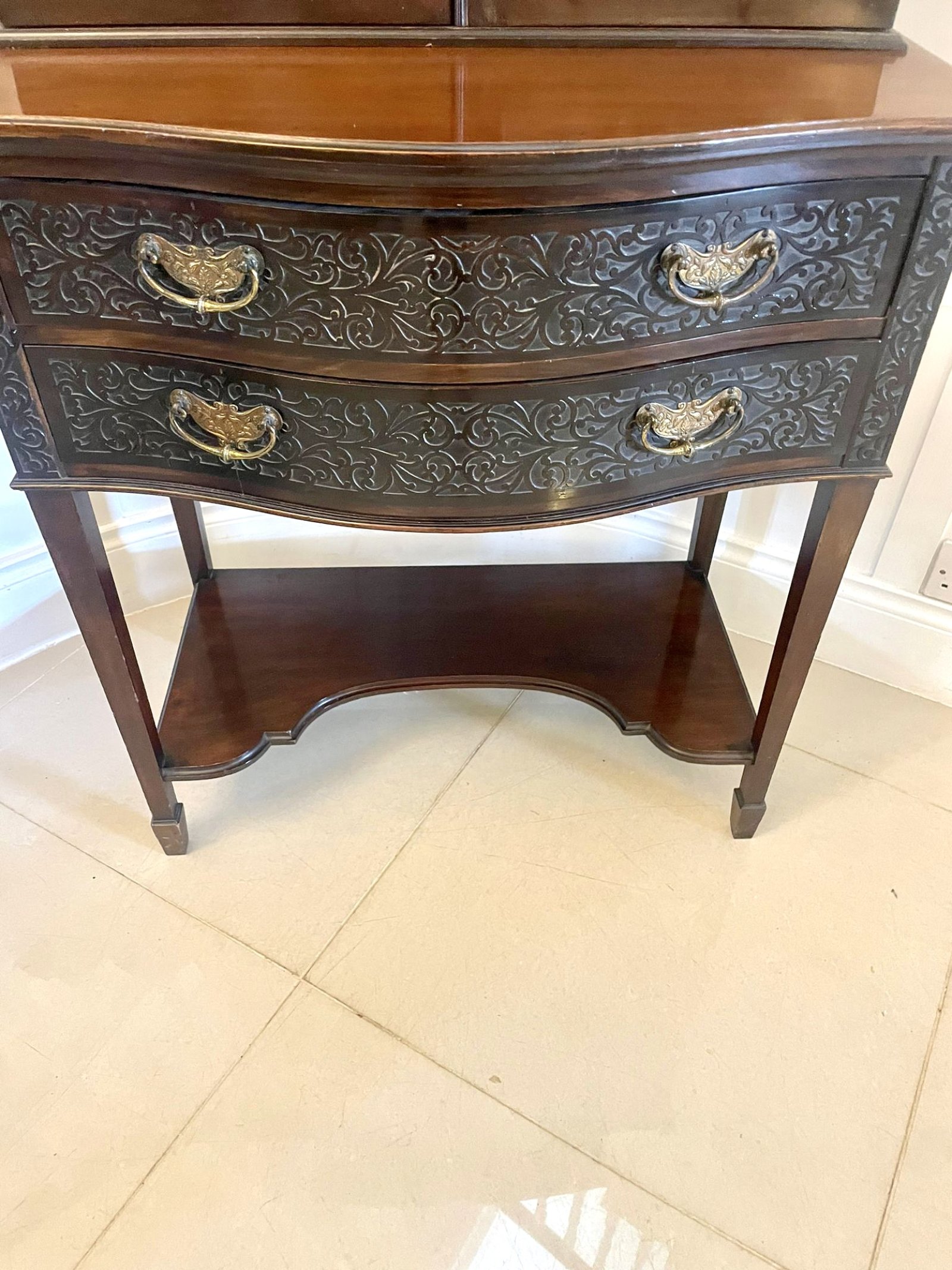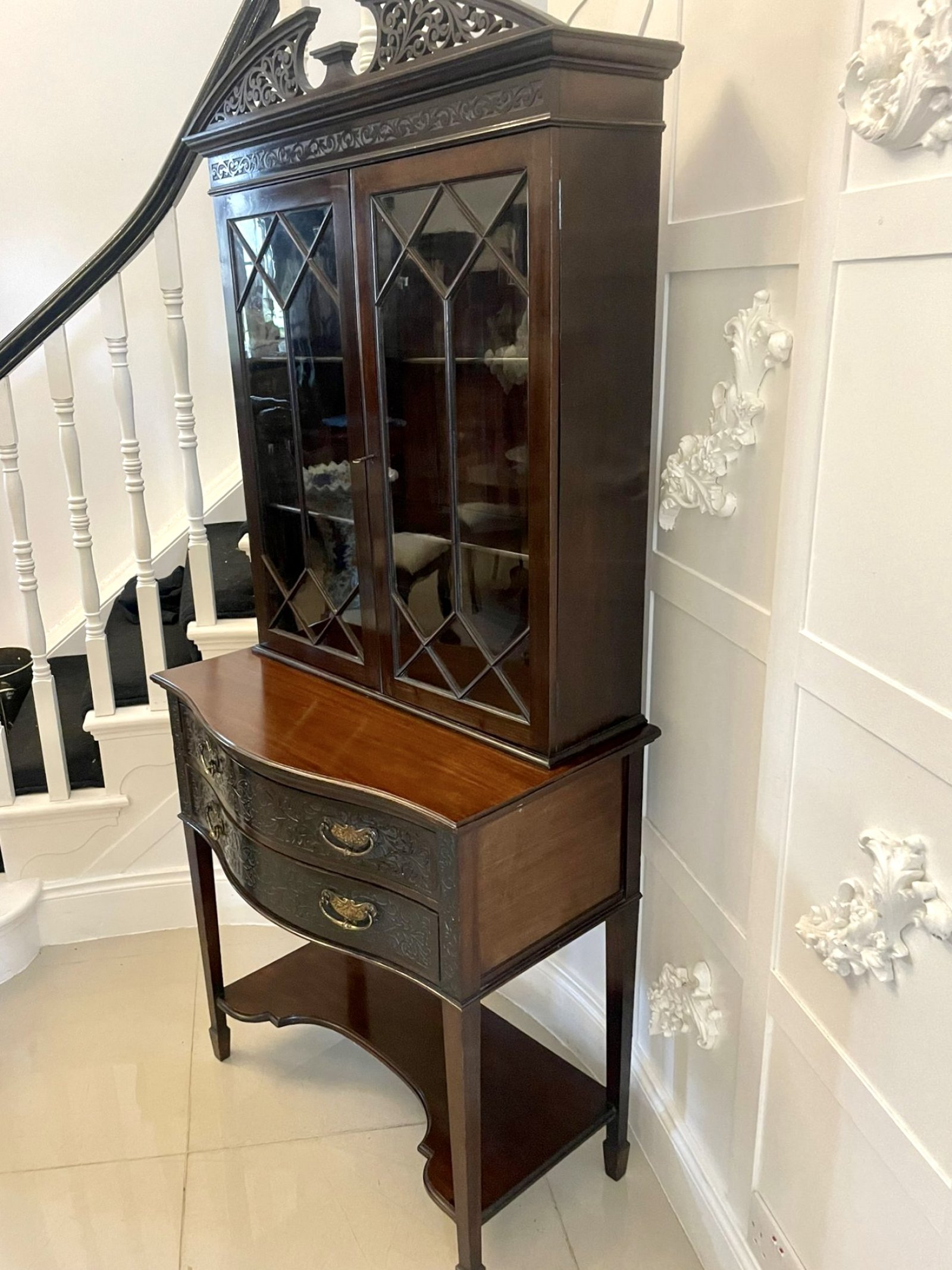 Antique Victorian quality carved mahogany display cabinet having a quality carved pediment above a pair of astral glazed doors opening to reveal two adjustable display shelves supported by a serpentine shaped two drawer carved mahogany table with original brass handles standing on square tapering legs with spade feet united by a shaped undertier
