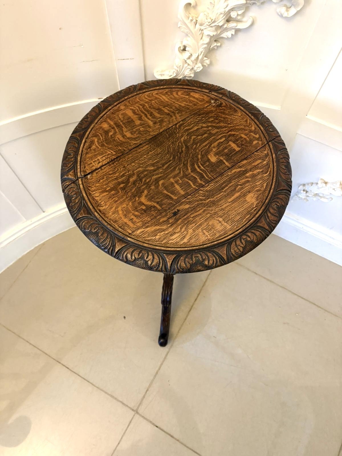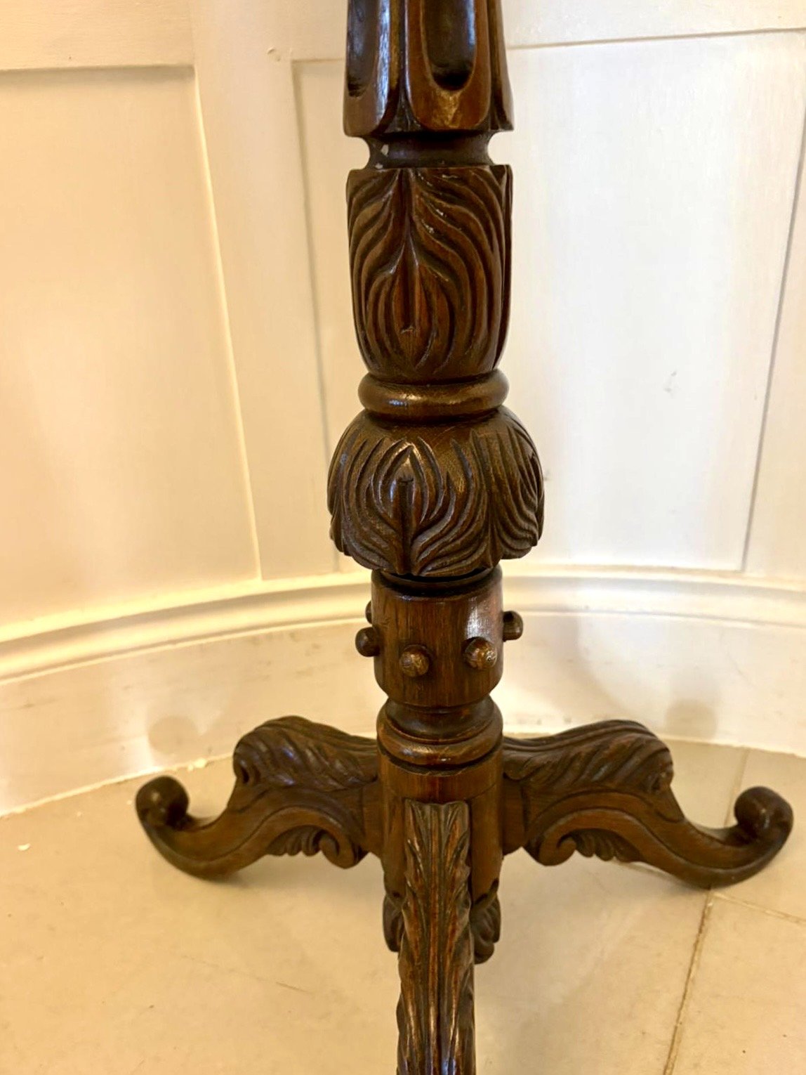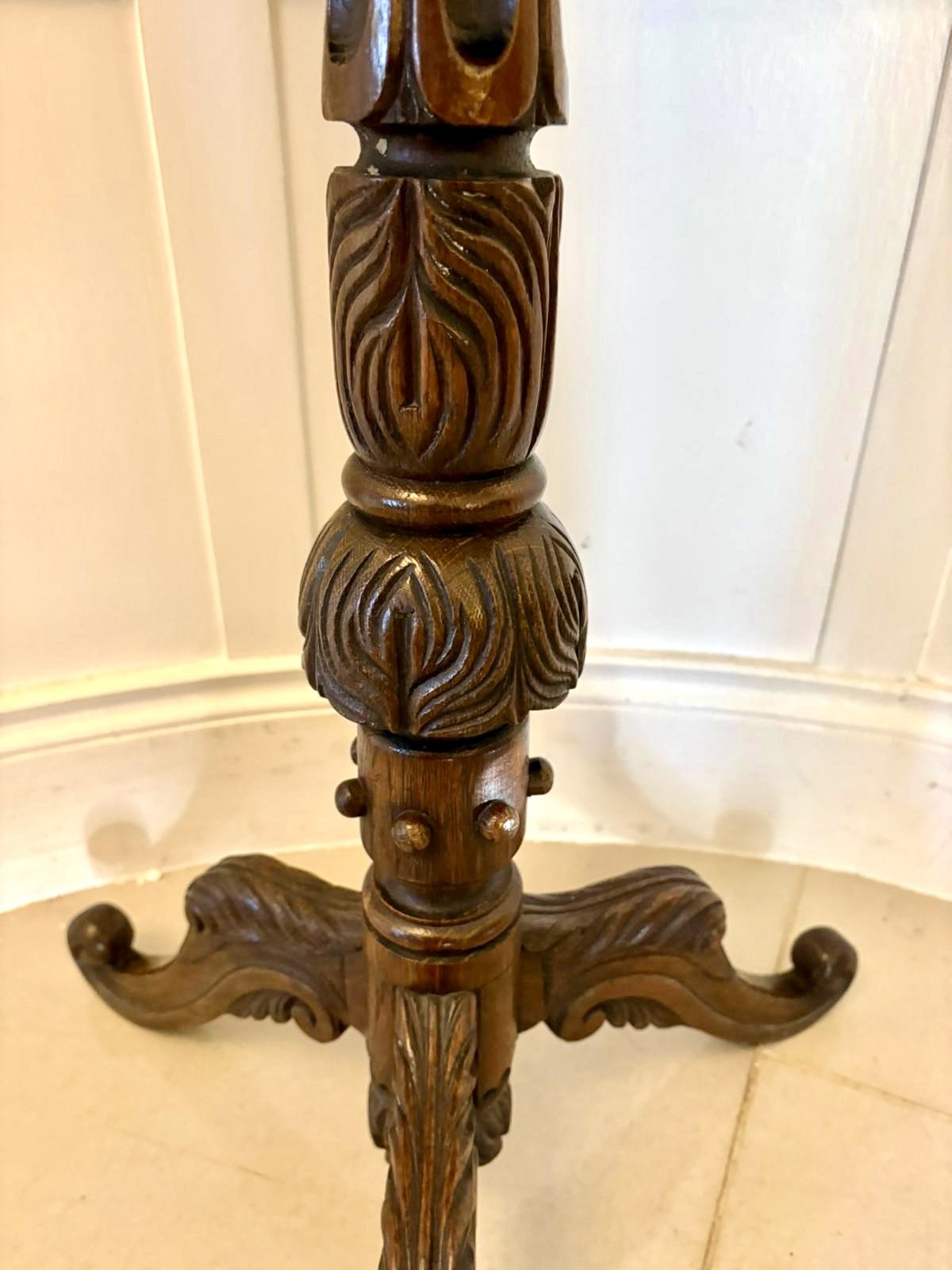 A superb Antique Victorian quality carved oak tripod / lamp table beautifully crafted with a richly figured circular top and deeply carved foliate border. The table stands on an elegant baluster stem with intricate hand-carved detailing supported by three shaped cabriole legs with scrolling toes.
