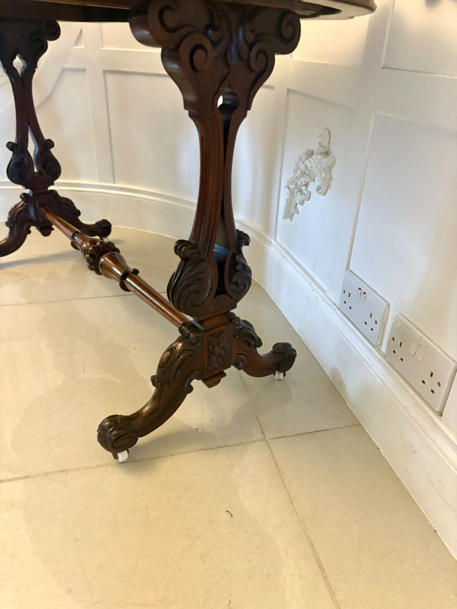 Antique Victorian quality carved rosewood freestanding centre table having a quality rosewood serpentine shaped top, carved rosewood frieze supported on carved rosewood scroll ends standing on shaped carved cabriole legs with scroll feet, original castors united by a turned carved tapering stretcher.