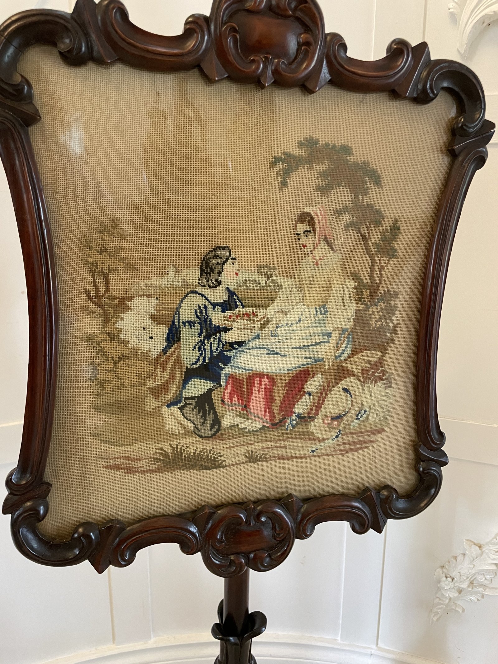 Antique Victorian quality carved rosewood pole screen having the original tapestry in a quality carved rosewood frame above a carved solid rosewood pedestal column standing on three carved rosewood shaped cabriole legs