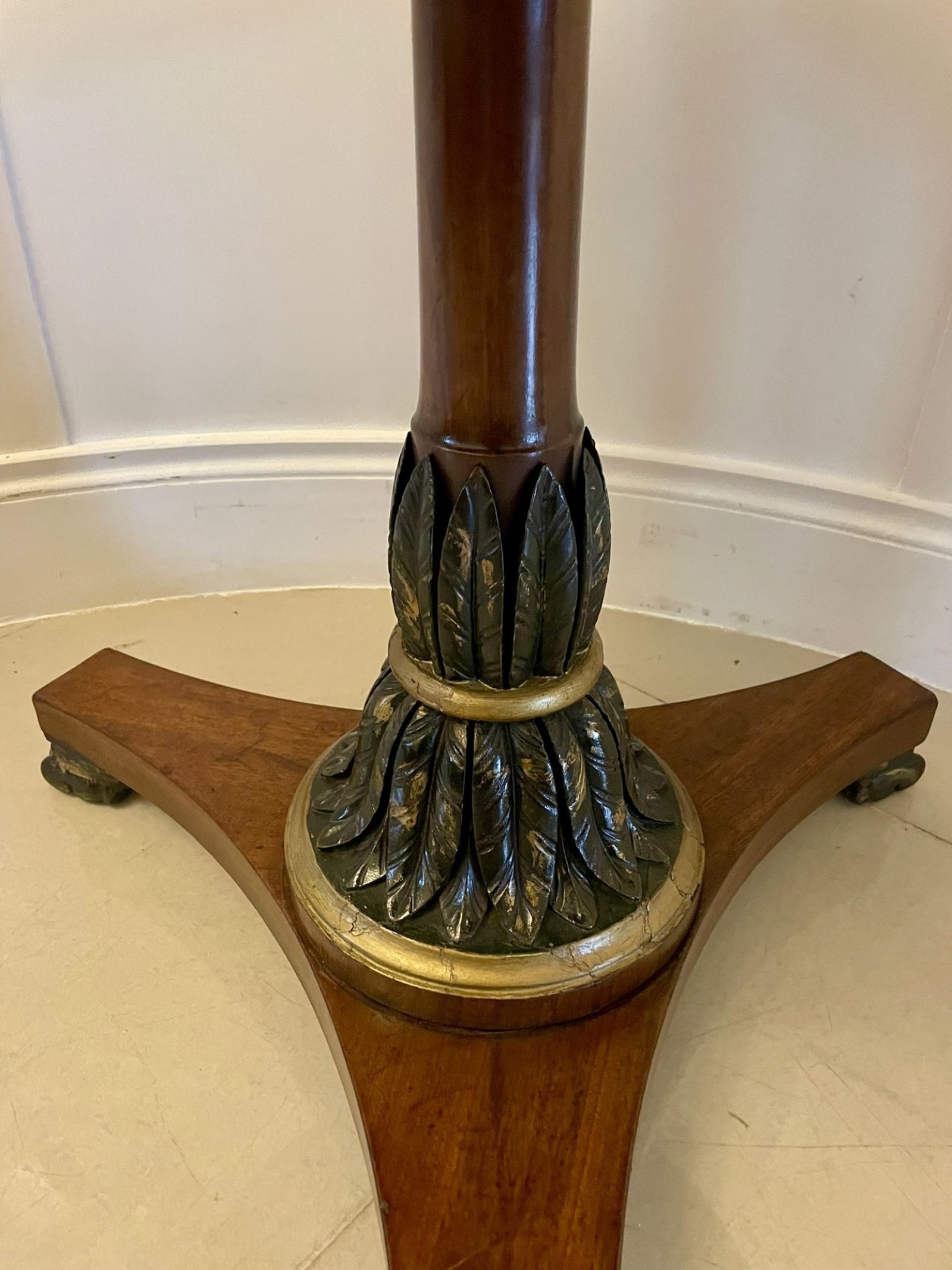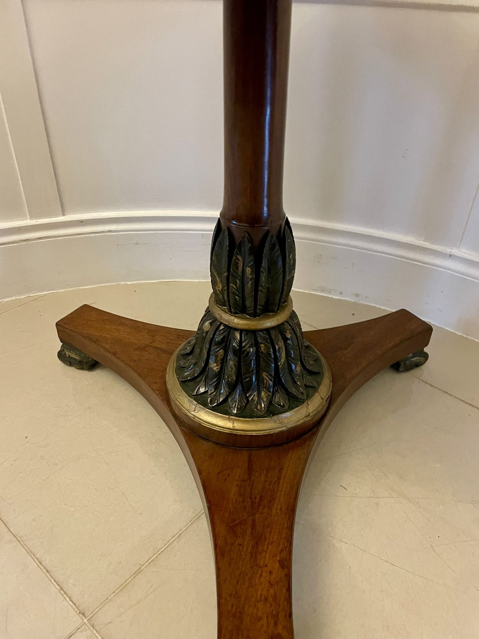 Antique Victorian quality circular specimen marble top lamp/centre table having a marvellous quality circular specimen marble top, mahogany frieze supported by an unusual turned mahogany pedestal column with carved gilded leaf decoration standing on a platform base with gilded claw feet