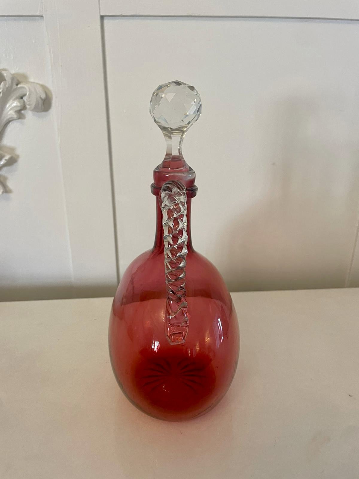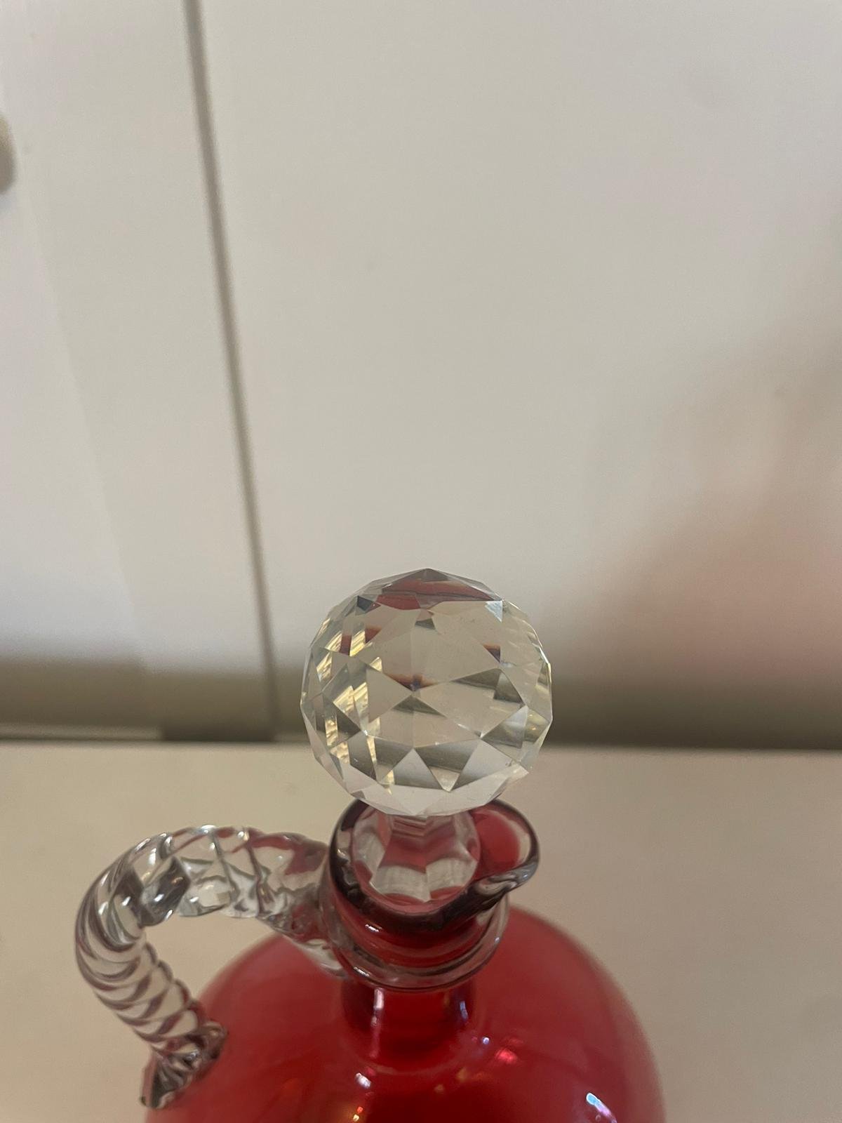 Antique Victorian quality cranberry glass decanter having an unusual rope twist glass handle and original stopper