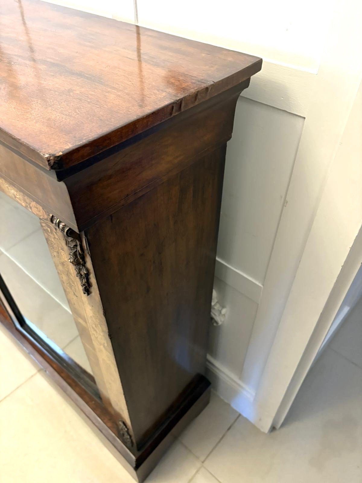 The twin glazed doors retain their original bevelled glass and open to reveal two internal shelves making it ideal for displaying silver, porcelain, or treasured collections. Decorative gilt-metal mounts and mouldings frame the doors and upright adding a refined, elegant contrast to the warm walnut tones.