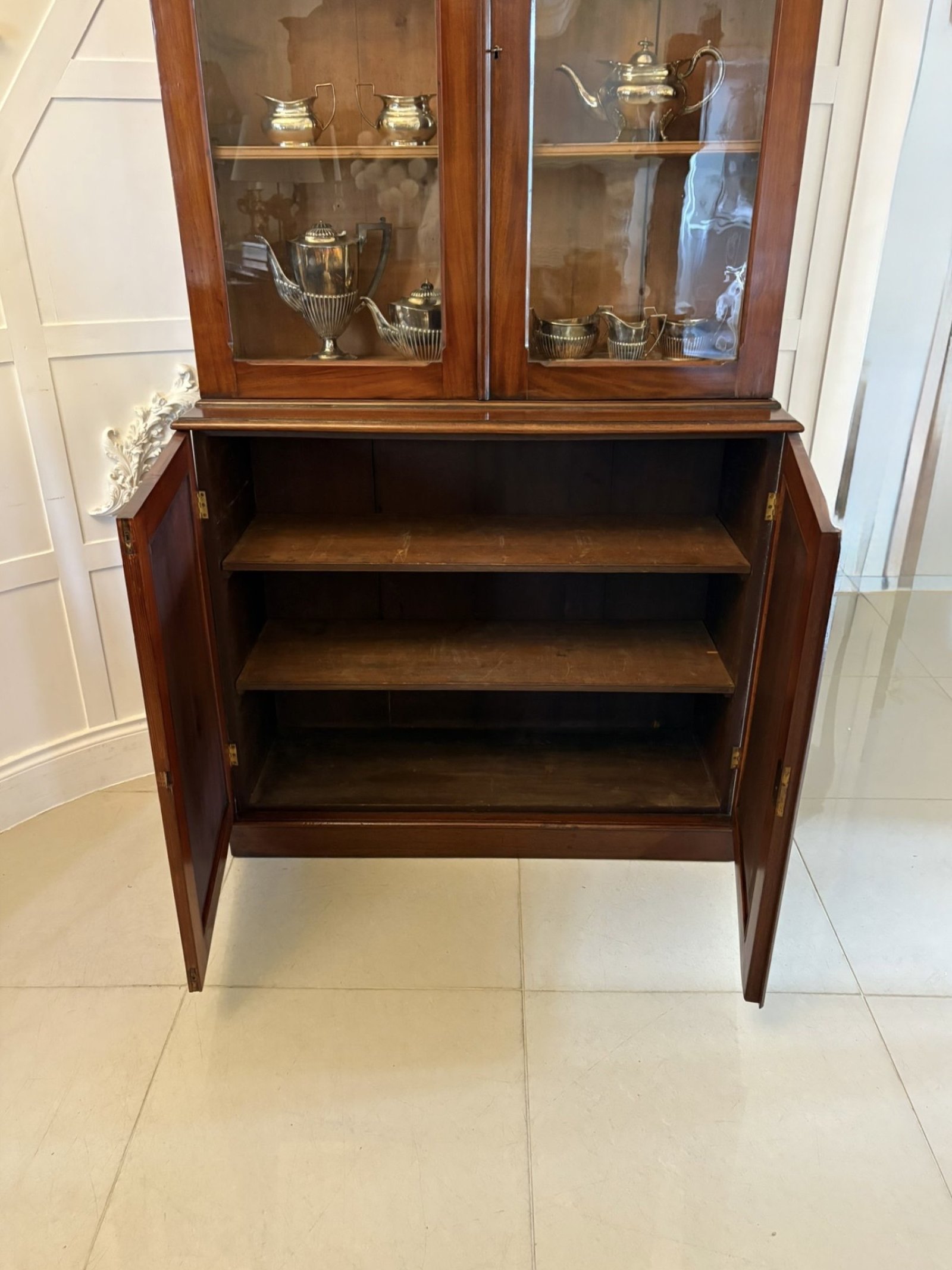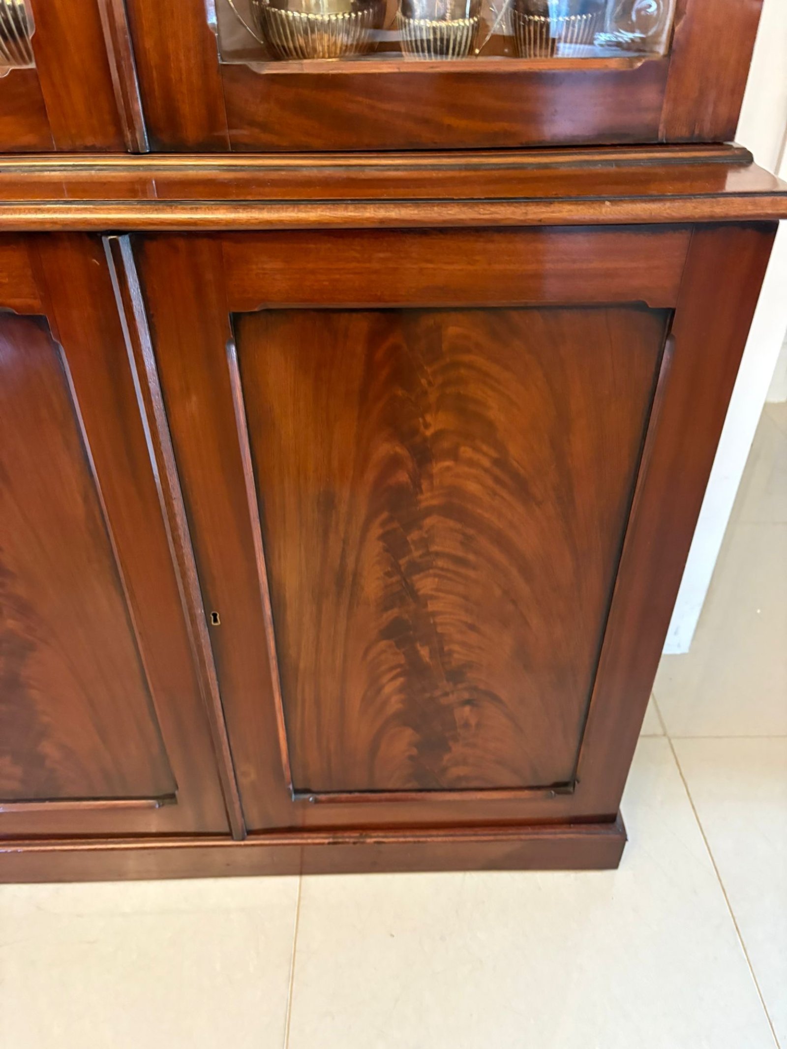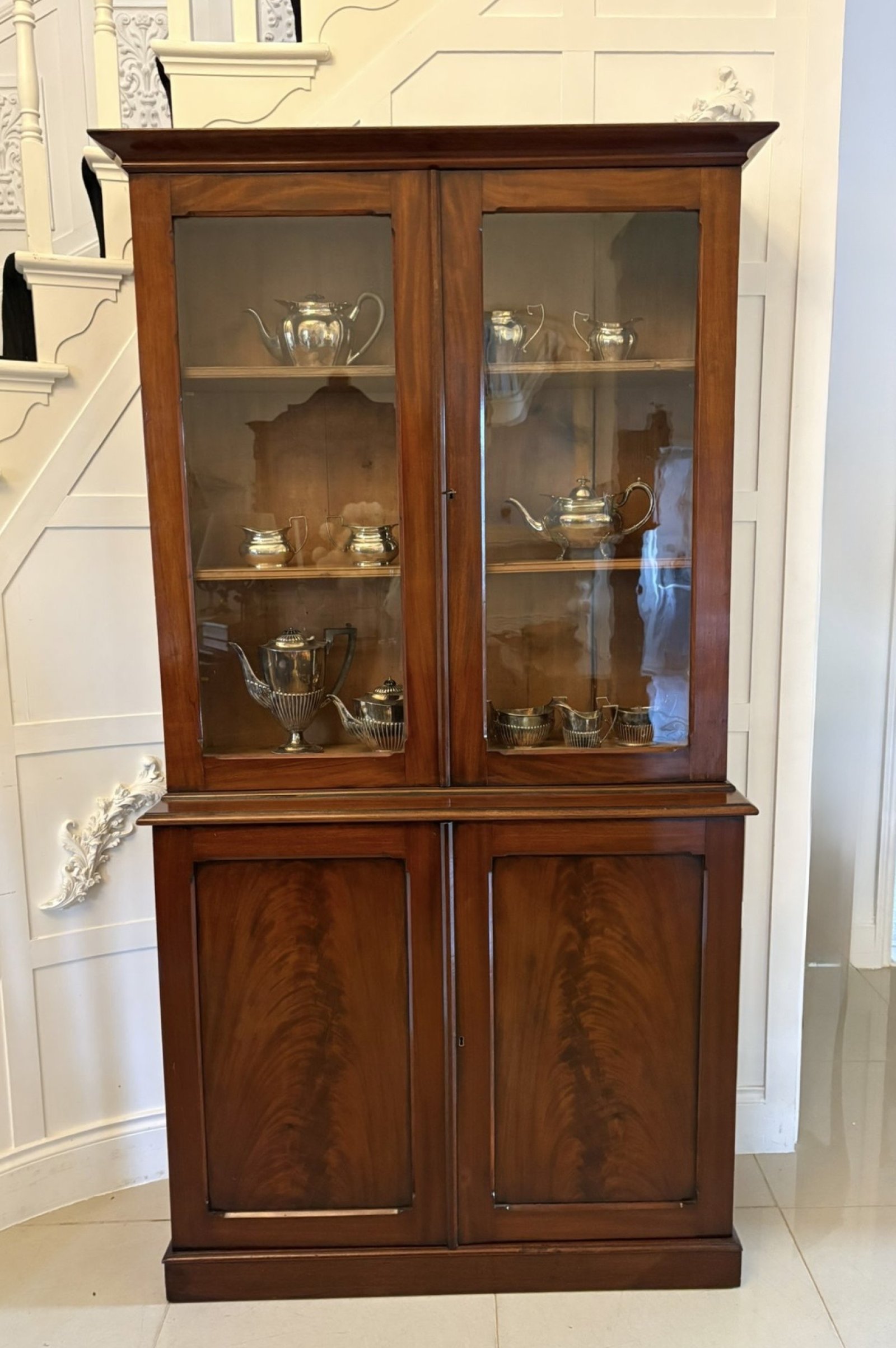 Antique Victorian quality figured mahogany bookcase having a shaped cornice above a pair of mahogany glazed doors opening to reveal three adjustable shelves above a mahogany cupboard with a pair of quality figured mahogany panelled doors opening to reveal a shelf storage interior standing on a plinth base.