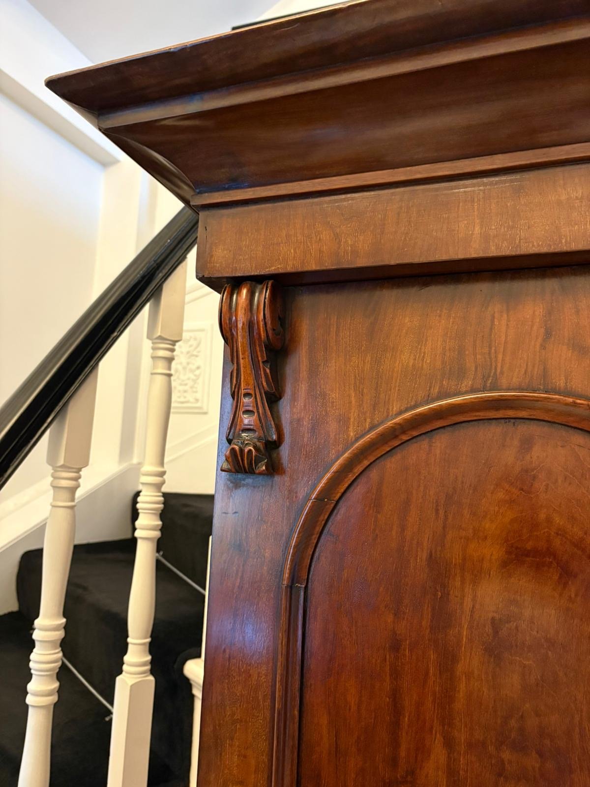 Antique Victorian quality figured mahogany three door wardrobe having a quality figured mahogany shaped cornice above three figured mahogany moulded panelled arch top doors with eight carved mahogany corbels opening to reveal a fitted interior consisting of five sliding tray, one short and two long drawers and a hanging compartment standing on a plinth base.