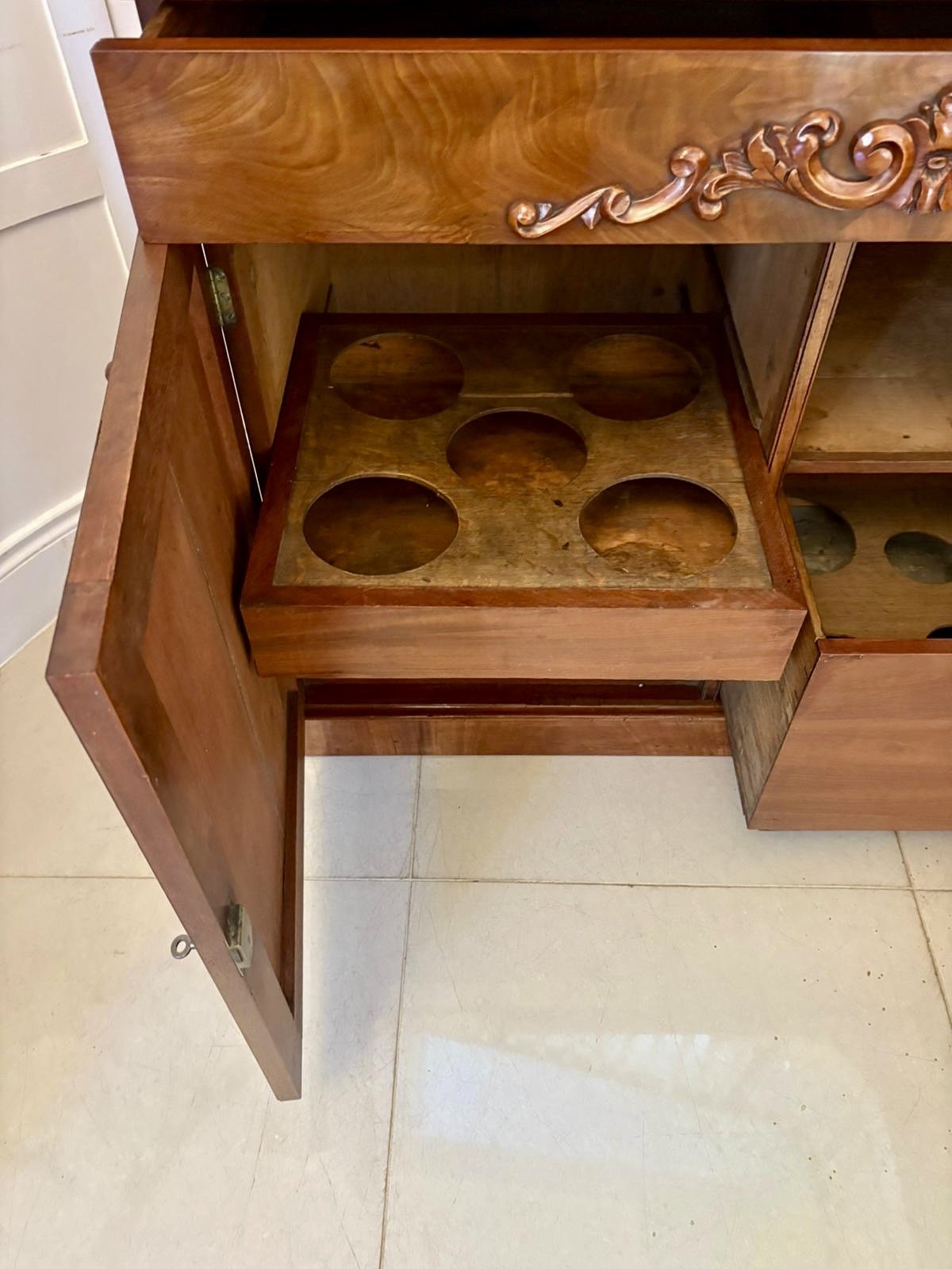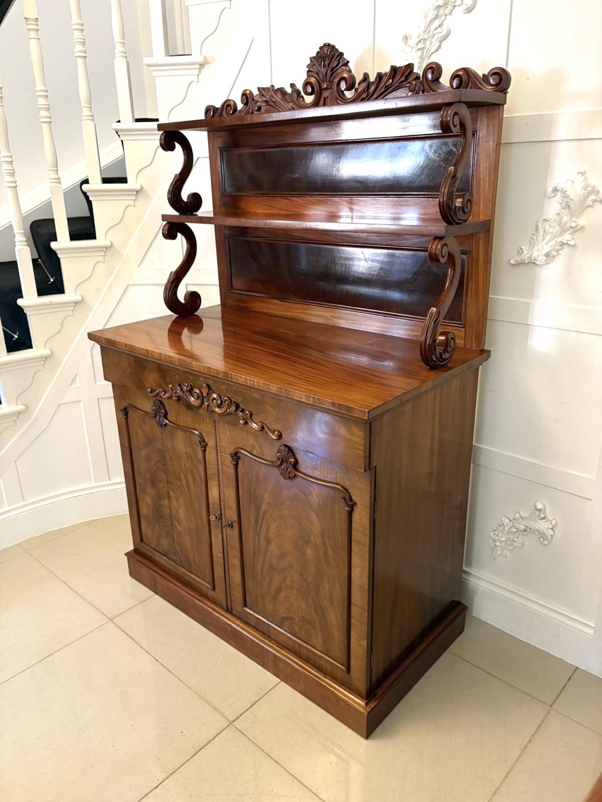 A superb antique Victorian quality figured mahogany two-tiered chiffonier / sideboard distinguished by exceptional, deeply carved decoration and beautifully grained timber. The shelves are supported by bold scrolling brackets each displaying outstanding Victorian craftsmanship with finely carved acanthus and volute details. The figured mahogany doors below feature elegant applied scrollwork opening to reveal original bottle slides and practical storage.