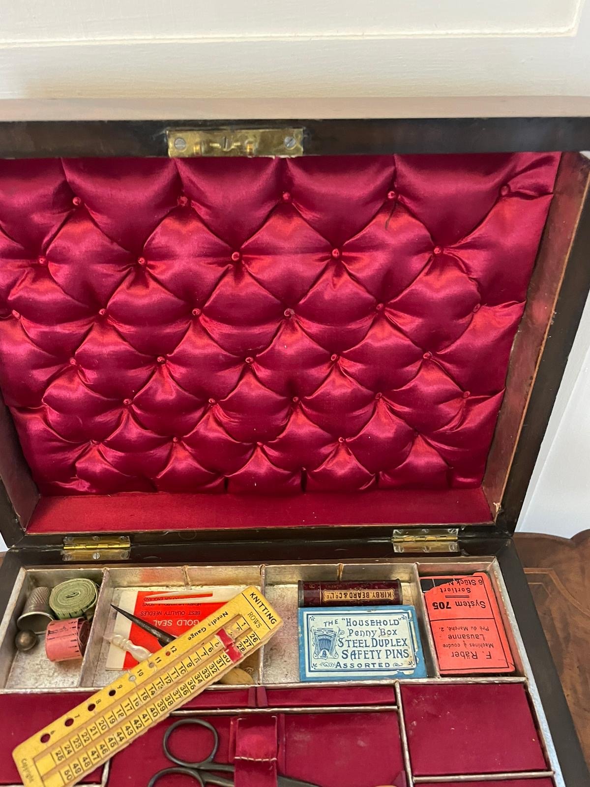 Antique Victorian quality figured walnut sewing box having a brass handle to the lift up top opening to reveal a fitted interior, drop down front opening to reveal a storage drawer