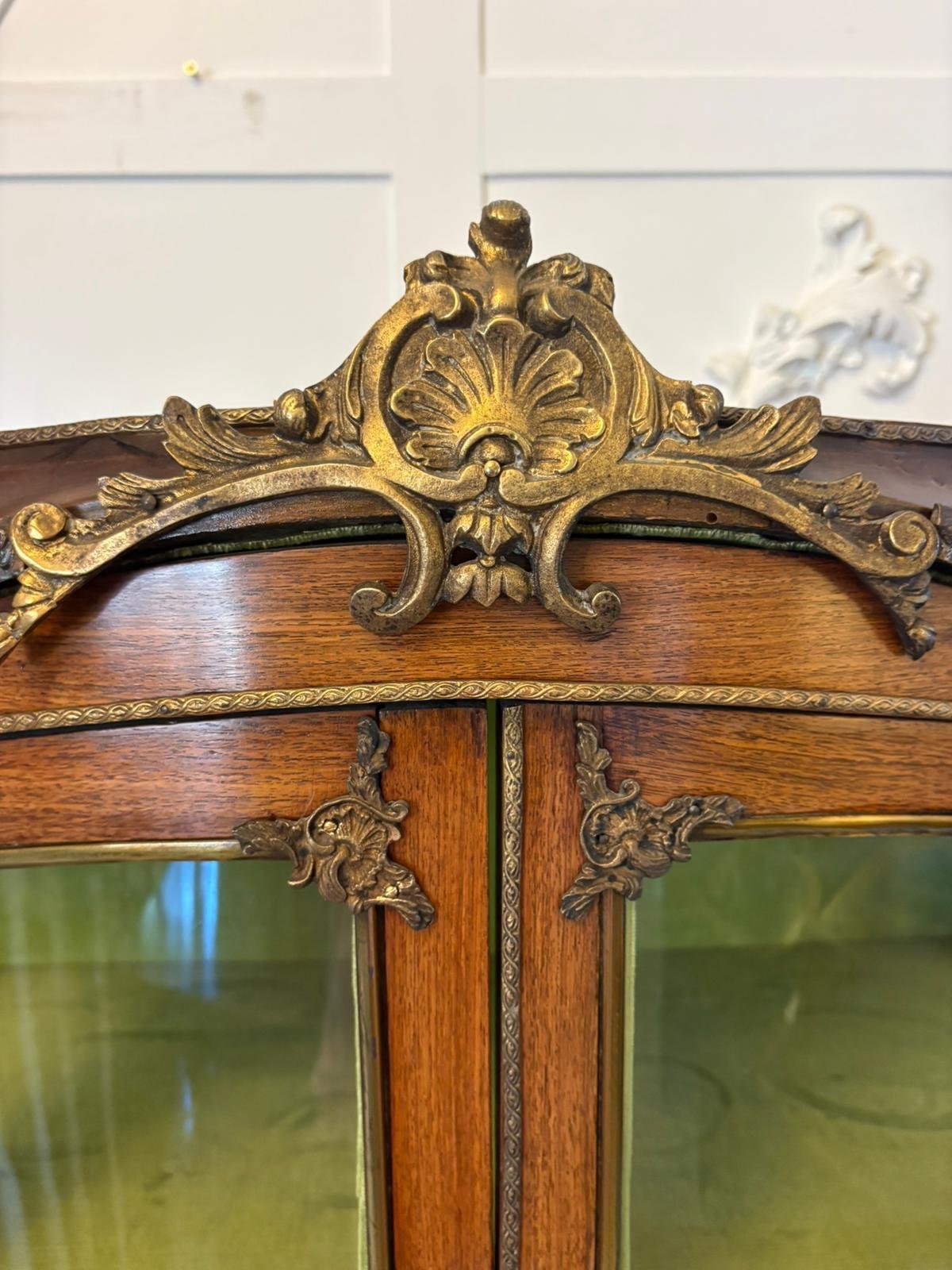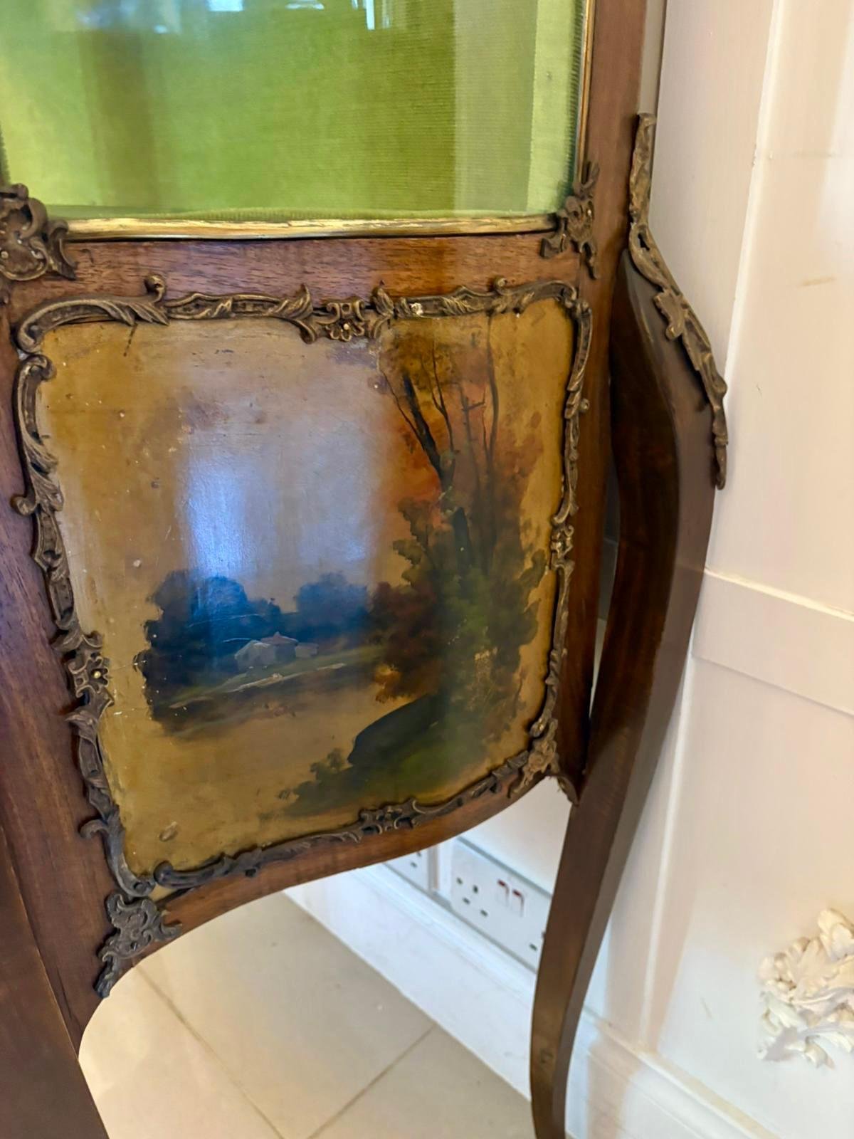 Antique Victorian quality French Vernis Martin vitrine/display cabinet having a pair of quality kingwood ornate gilded brass serpentine shaped glazed doors with original and fabulous Vernis Martin painted panels opening to reveal three display shelves with original velvet lining, serpentine glazed sides with painted panels, lovely ormolu mounts standing on shaped cabriole legs with brass feet.