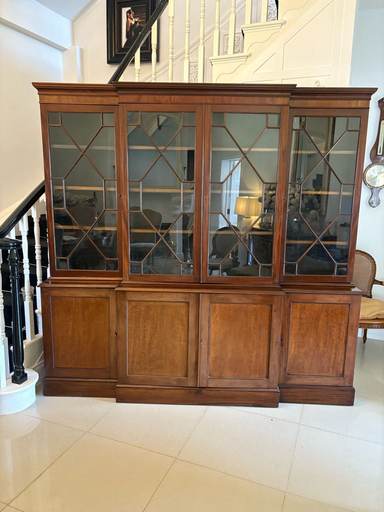 Antique Victorian quality mahogany breakfront bookcase having a quality mahogany astral glazed breakfront top with four doors opening to reveal 9 adjustable shelves above a quality mahogany breakfront base with 4 moulded panelled doors opening to reveal 3 shelves, standing on a plinth base, working keys.