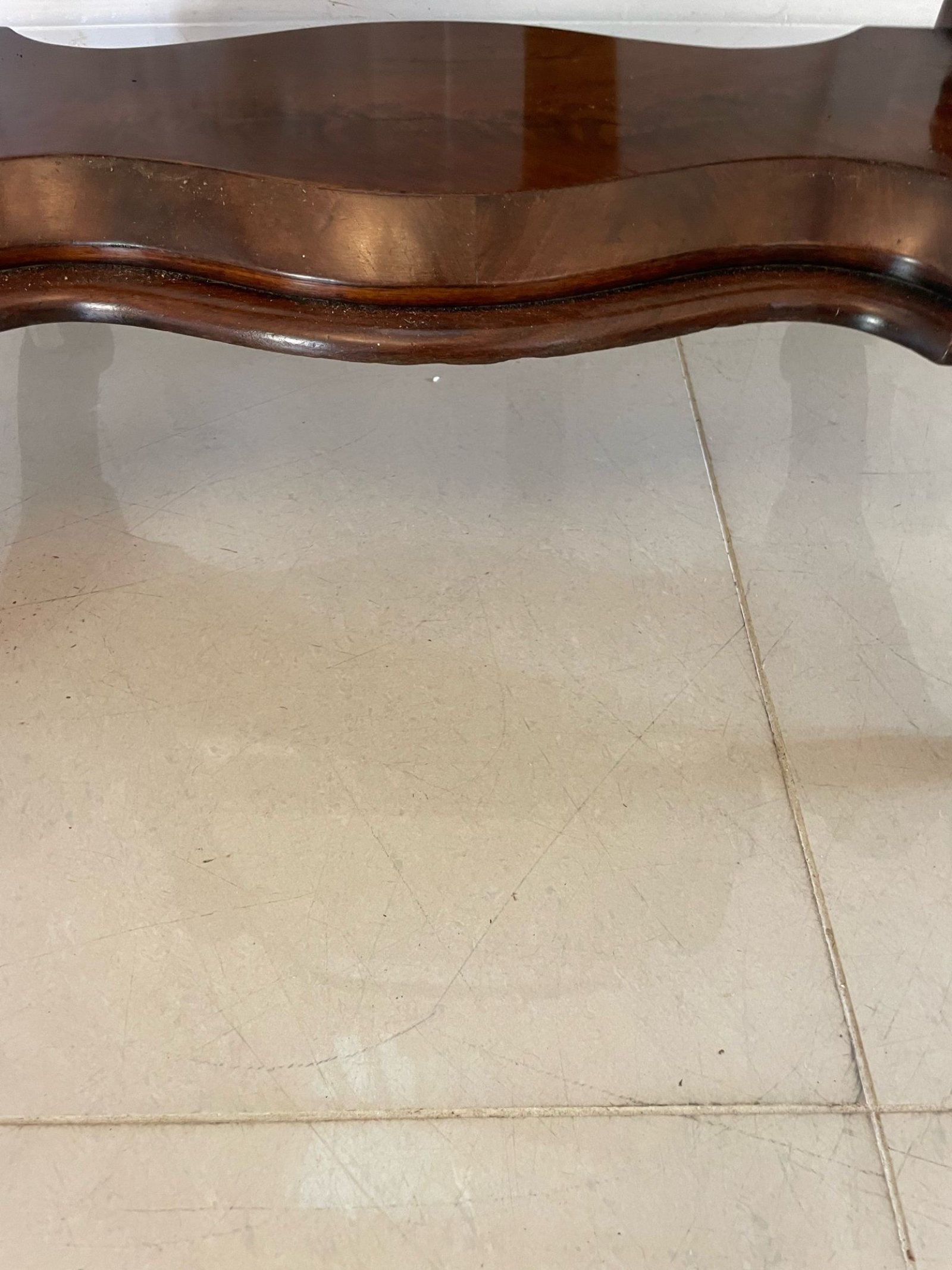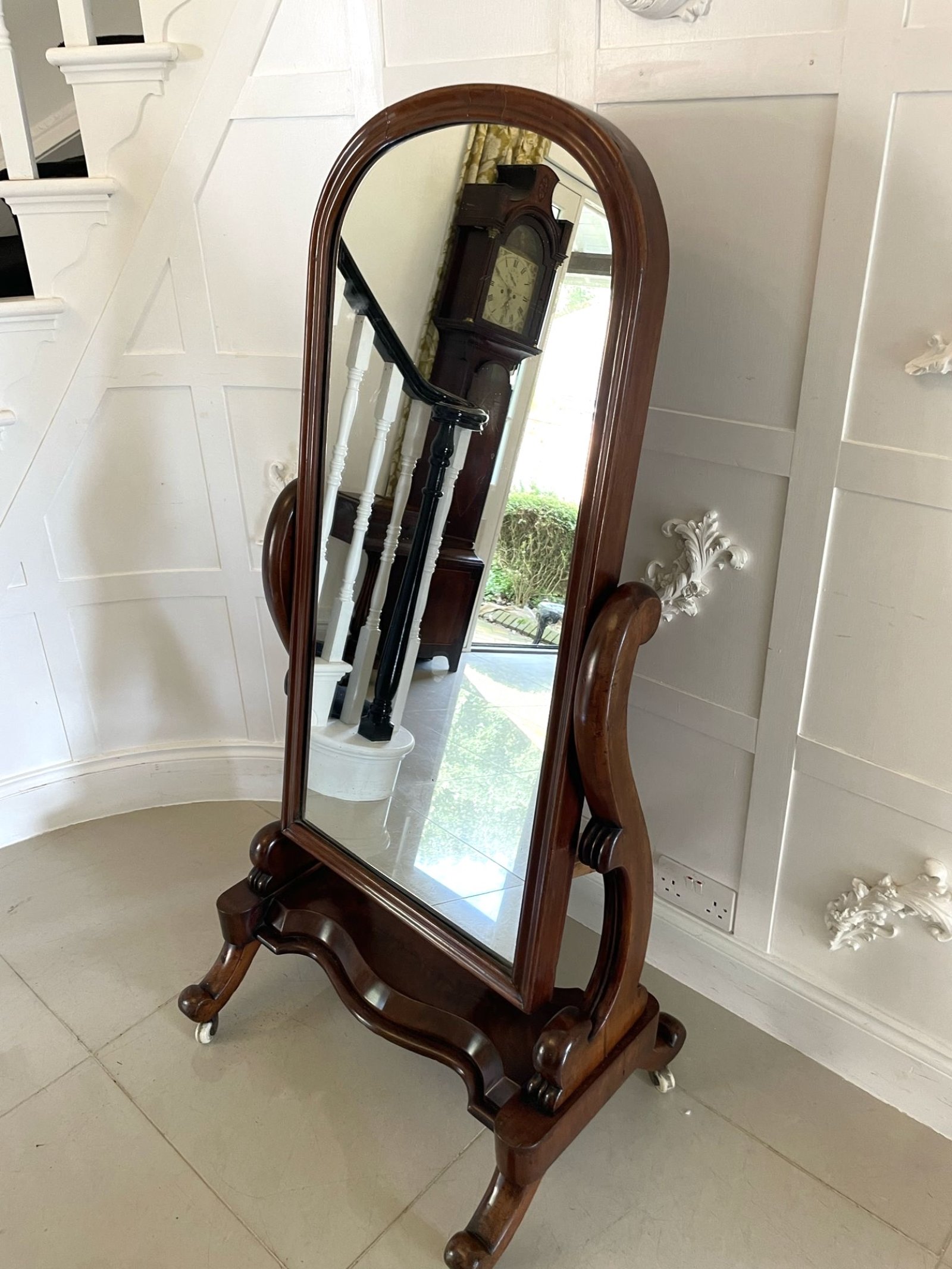 Antique Victorian quality mahogany cheval mirror having the original mirror in an arched top, mahogany frame with a moulded edge supported by scroll shaped supports standing on a serpentine shaped mahogany platform with cabriole legs and scroll feet original with porcelain castors