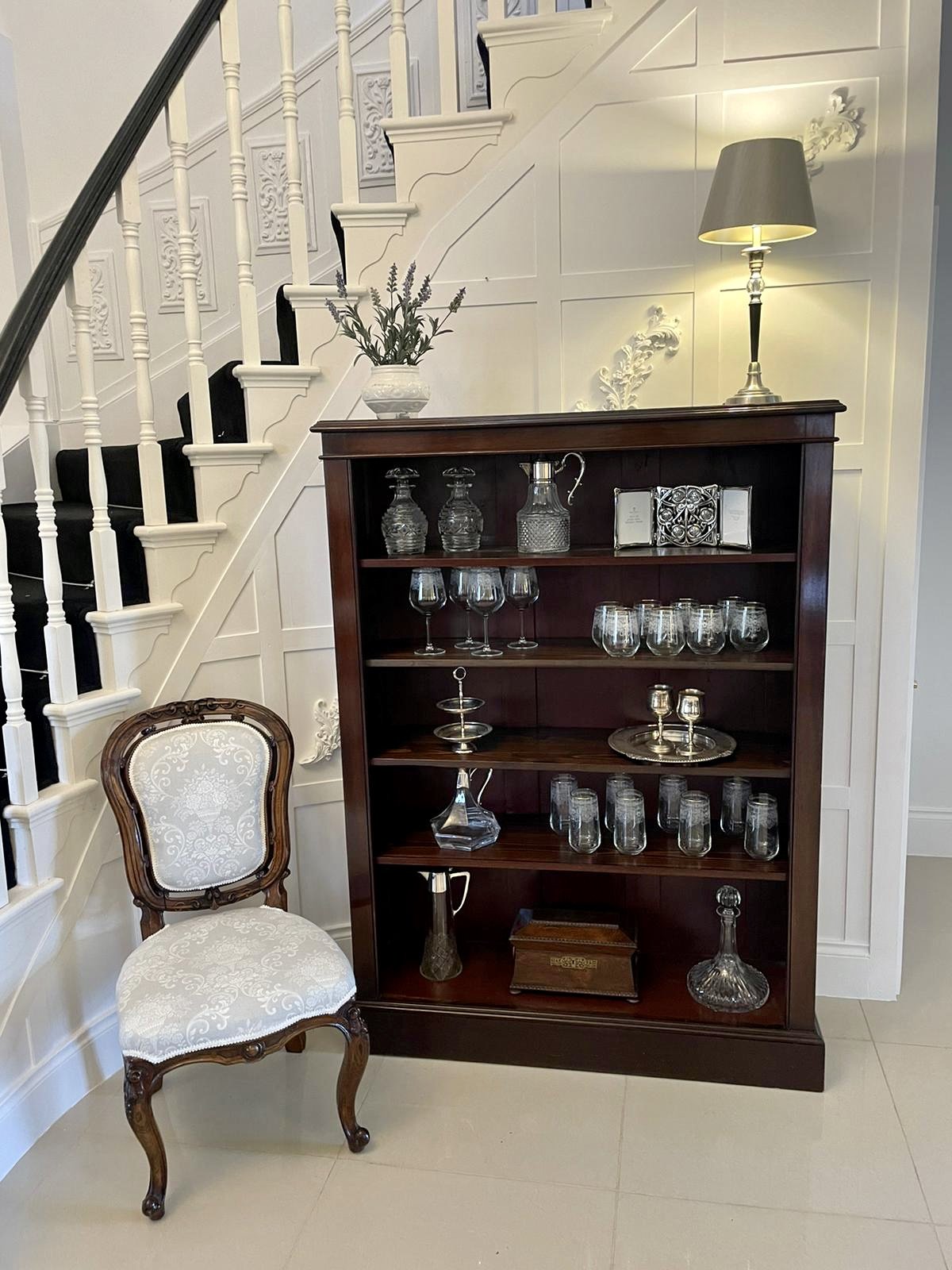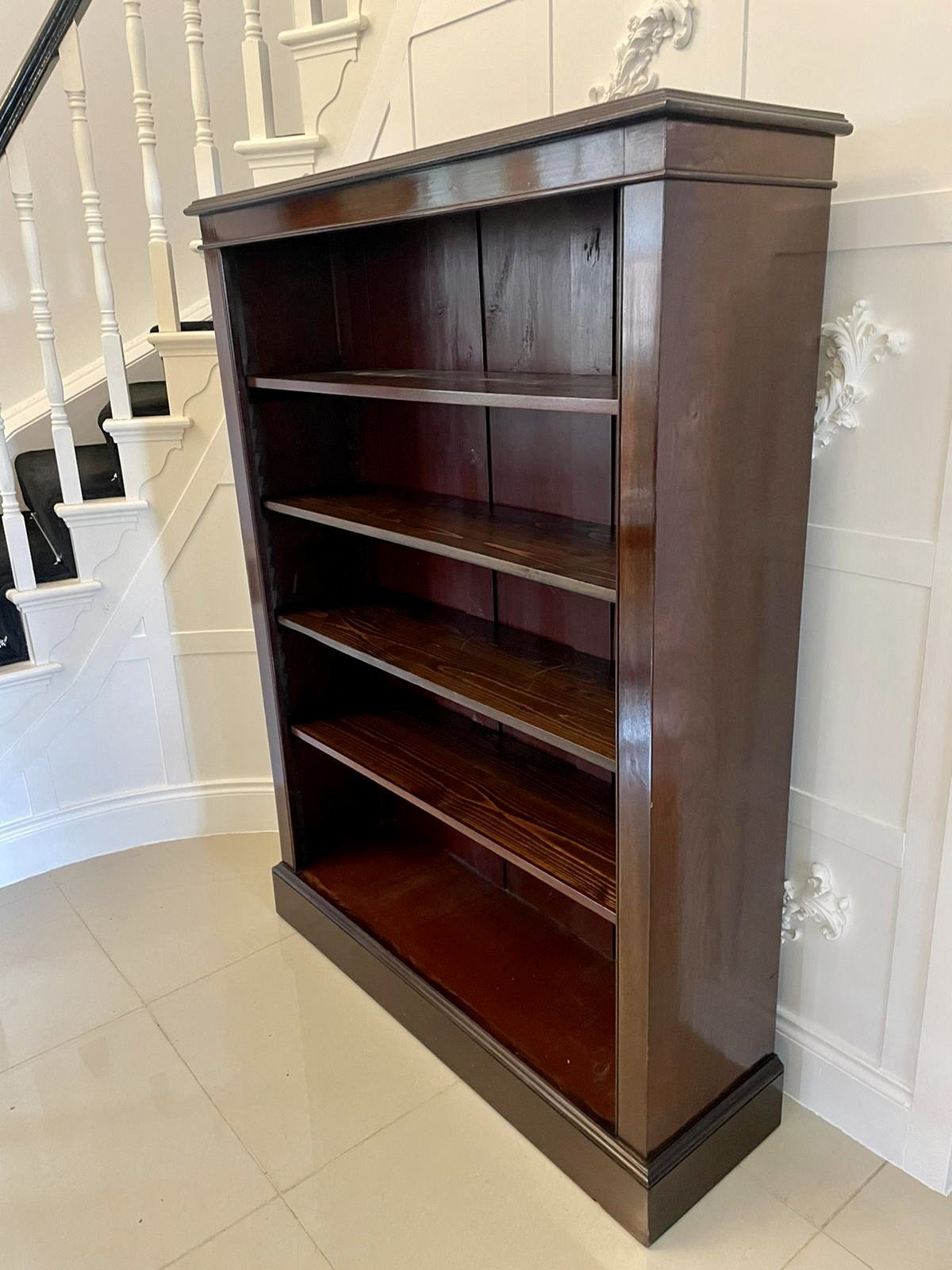 Antique Victorian quality mahogany open bookcase having a quality mahogany top with a moulded edge, four adjustable shelves and raised on a plinth base.
