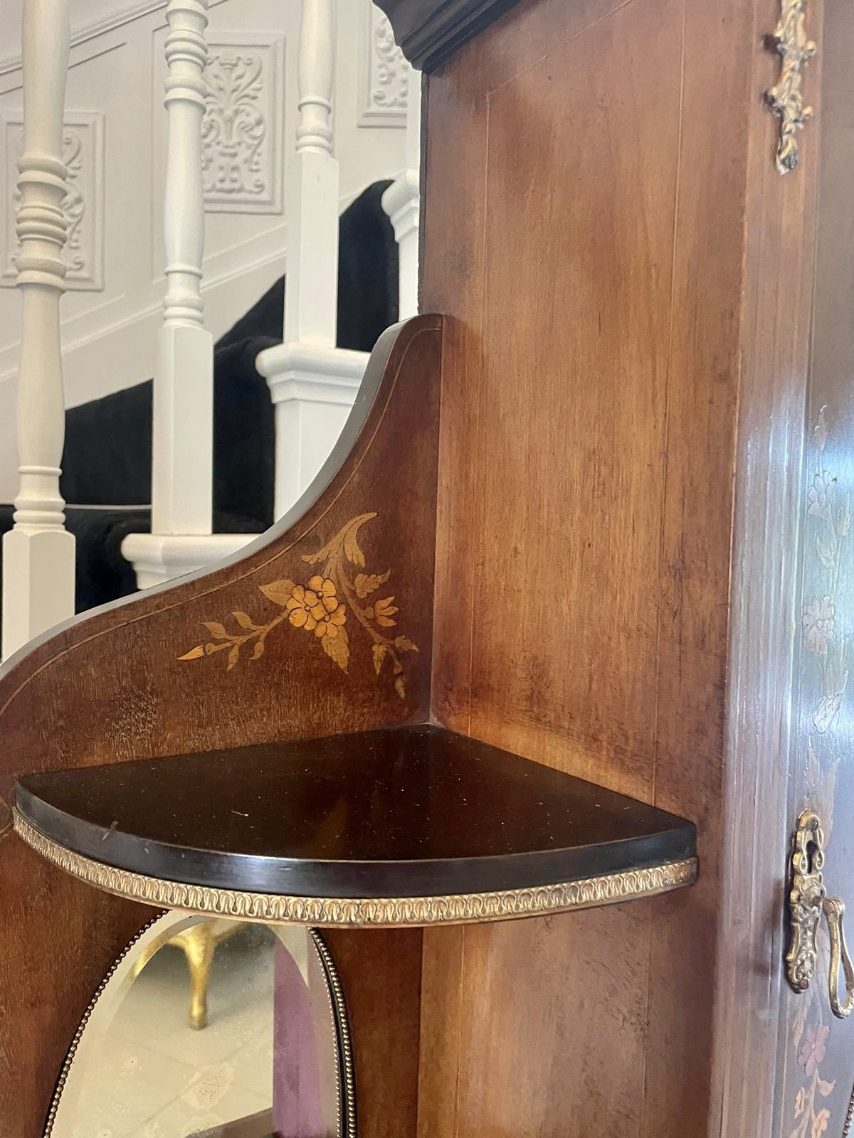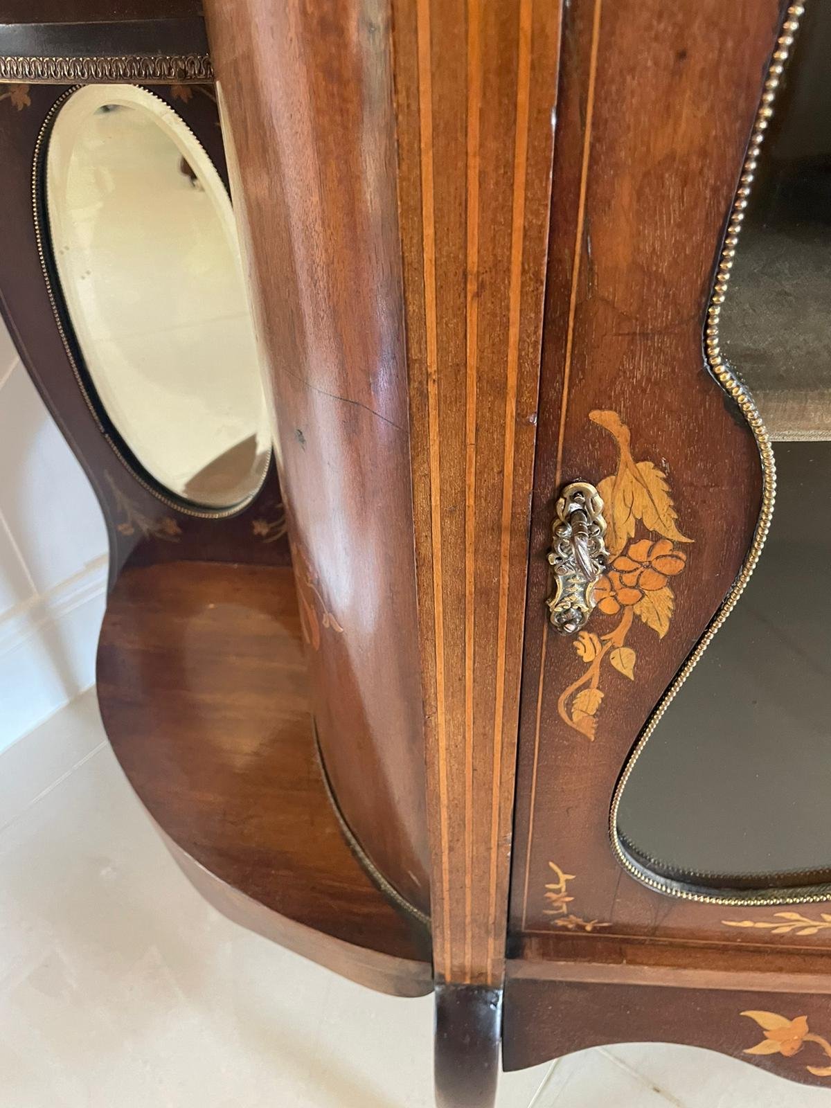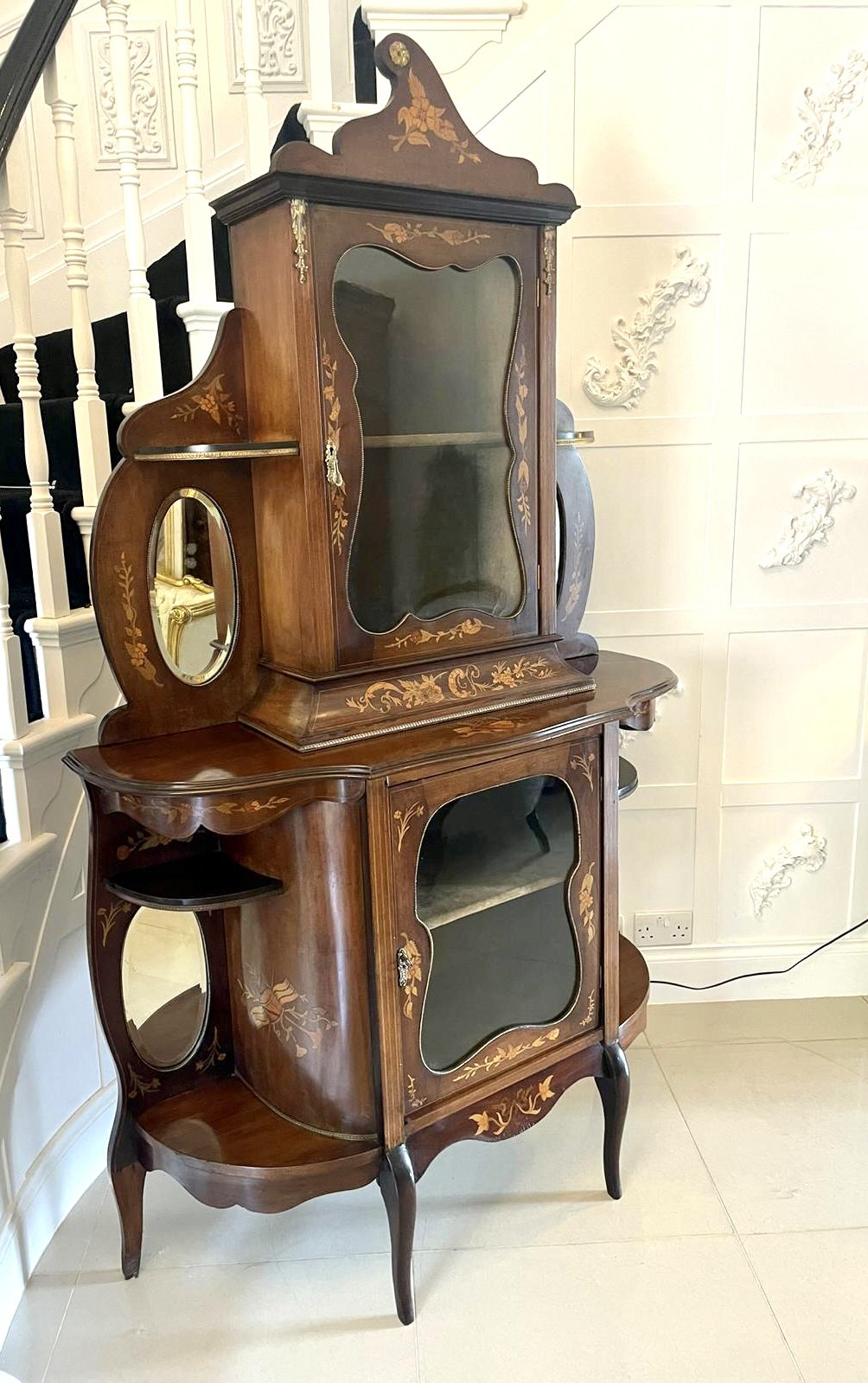 Antique Victorian quality marquetry inlaid mahogany display cabinet having a quality floral marquetry inlaid top with oval bevelled edge mirrors, ormolu mounts, glazed shaped door opening to reveal a fitted display shelf above an open ended display cabinet with pretty floral marquetry inlay, oval bevelled edge mirrors, shaped glazed door opening to reveal a fitted display shelf standing on shaped cabriole legs with ormolu mounts united by a shaped marquetry inlaid apron